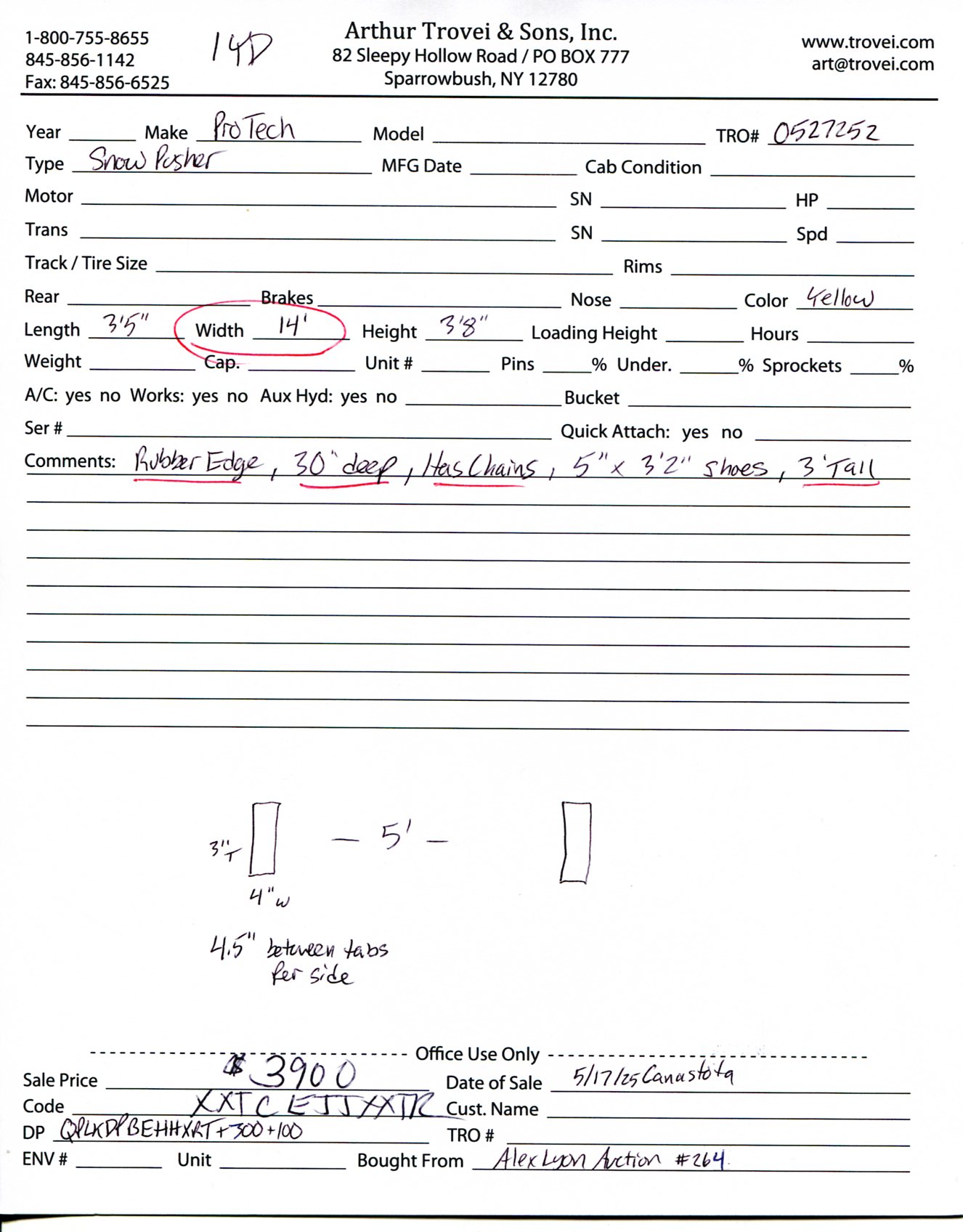 Inventory # 0527252Make: ProTech Model: Type: Snow Plow Serial Number: Width: 14' Length: 3'5" Height: 3'8" Weight: Fits: Loader Box: 3' T x 2'6" D Shoes: 5" W x 3'2" L Shoes Added Details: Rubber Edge, Two 4" x 3" Tabs, 5' Between Price: $3,900 1YDXXTCEJJXXTRQPLKDPBEHHXRT+300+100 Terms of Sale