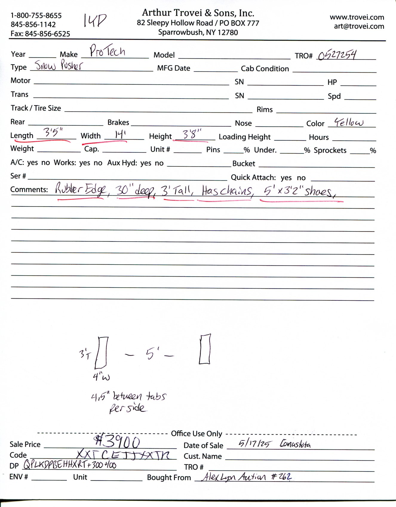 Inventory # 0527254Make: ProTech Model: Type: Snow Plow Serial Number: Width: 14' Length: 3'5" Height: 3'8" Weight: Fits: Loader Box: 3' T x 2'6" D Shoes: 5" W x 3'2" L Shoes Added Details: Rubber Edge, Two 4" x 3" Tabs, 5' Between Price: $3,900 1YDXXTCEJJXXTRQPLKDPBEHHXRT+300+100 Terms of Sale