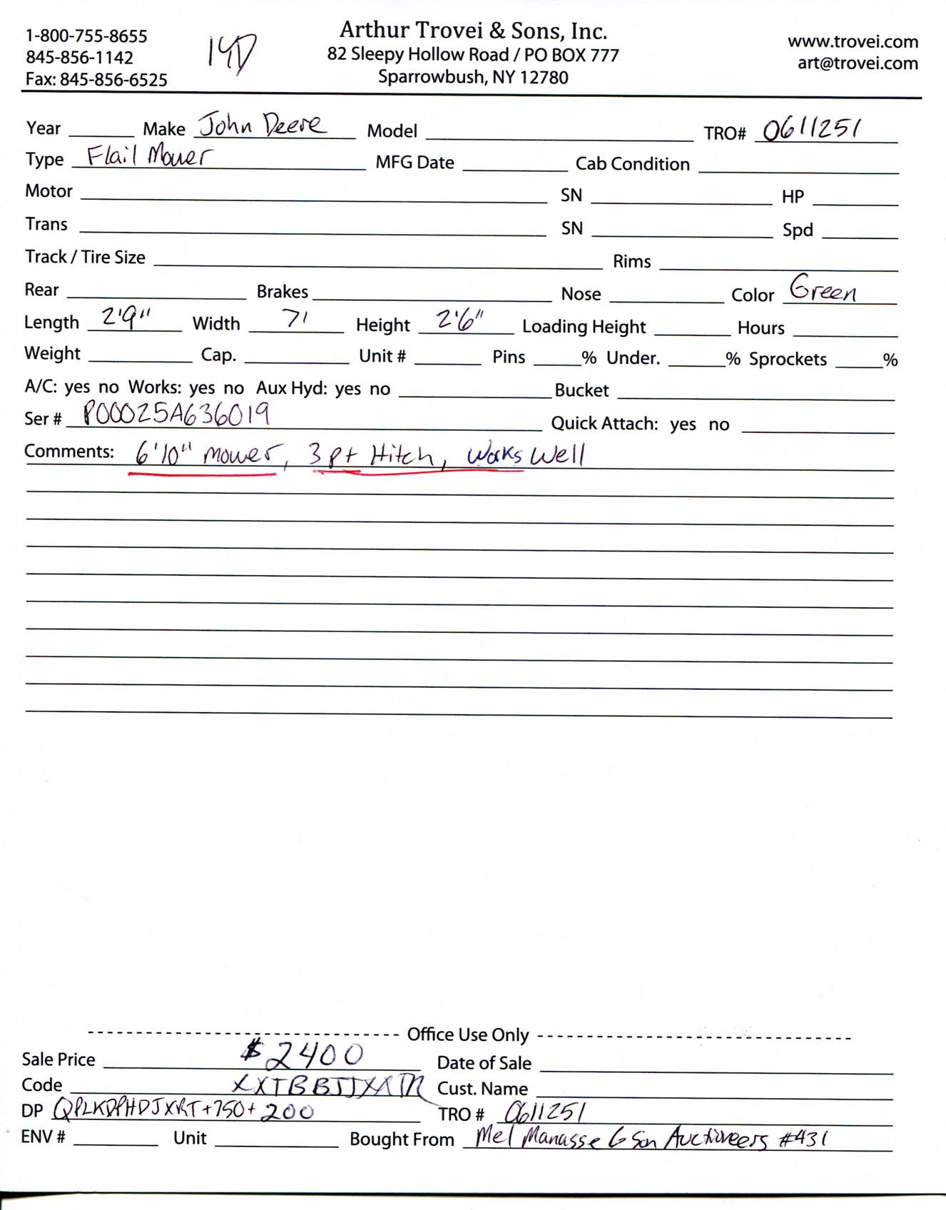Inventory # 0611251Year: Make: John Deere Model: Type: Rear Mount Flail Mower Serial Number: P00025A636019 Length: 2'9" Width: 7' Height: 2'6" Weight: Fits: Agricultural Tractors Added Details: Works Well, PTO Driven, 3-Point Hitch Mount, 6'10" Mower, Currently Installed On TRO 0721254 Price: $2,400 1YDXXTBBJJXXTRQPLKDPHDJXRT+750+200 Terms of Sale