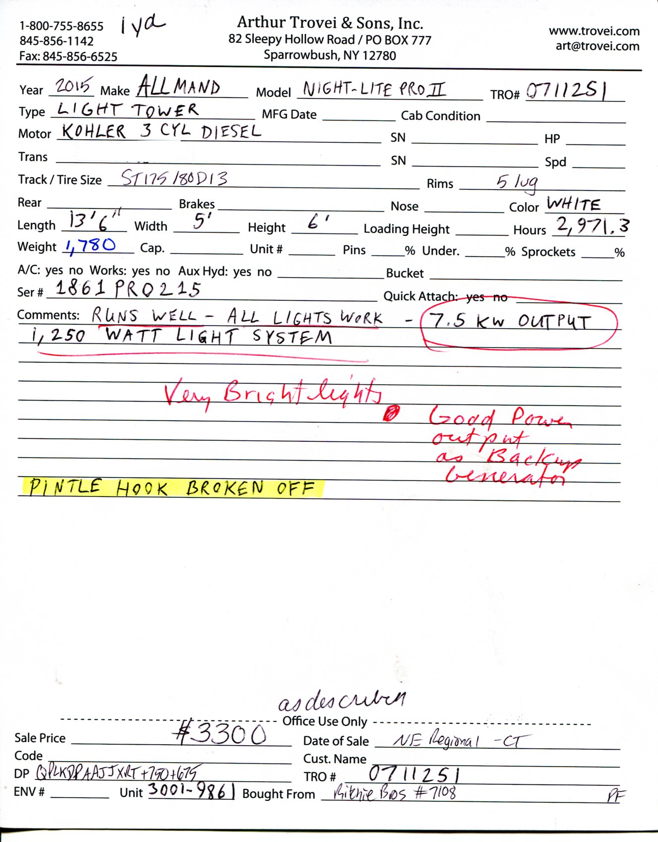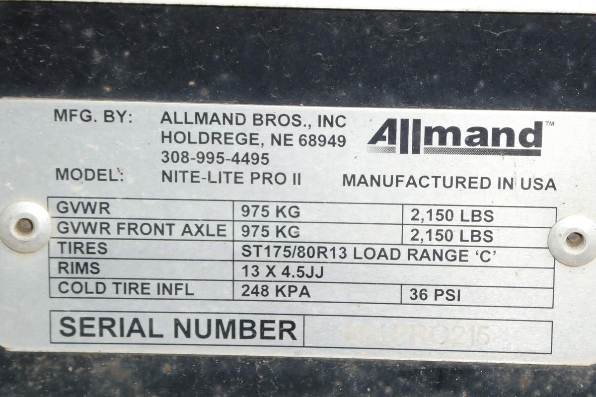 Inventory # 0711251Year: 2015 Make: Allmand Model: Night-Light Pro II Type: Light Tower Serial # 1861PRO215 Motor: Kohler 3 Cylinder Diesel Tires: ST175/80D13 Rims: 5 Lug - Steel Hours: 2,971 Length: 13'6" Width: 5' Height: 6' Weight: 1,780 lb Added Details: Runs Well, 7.5kW Generator, 120V Receptical, 4x Lights, 1,250W Light System, Pintle Hook Broken Off, Has Trailer Ball Price: $3,300 as described 1YDQPLKDPAAJJXRT+750+675 Print This Page | Back to Miscellaneous Inventory | Ask A Question Terms of Sale