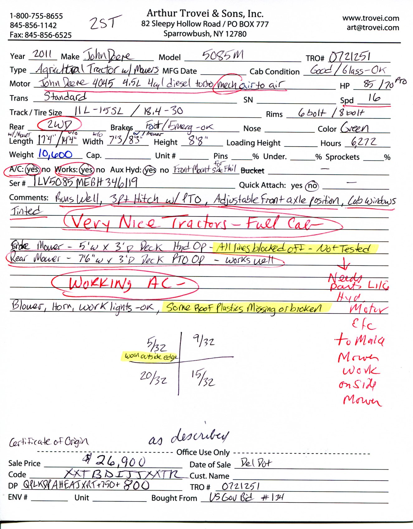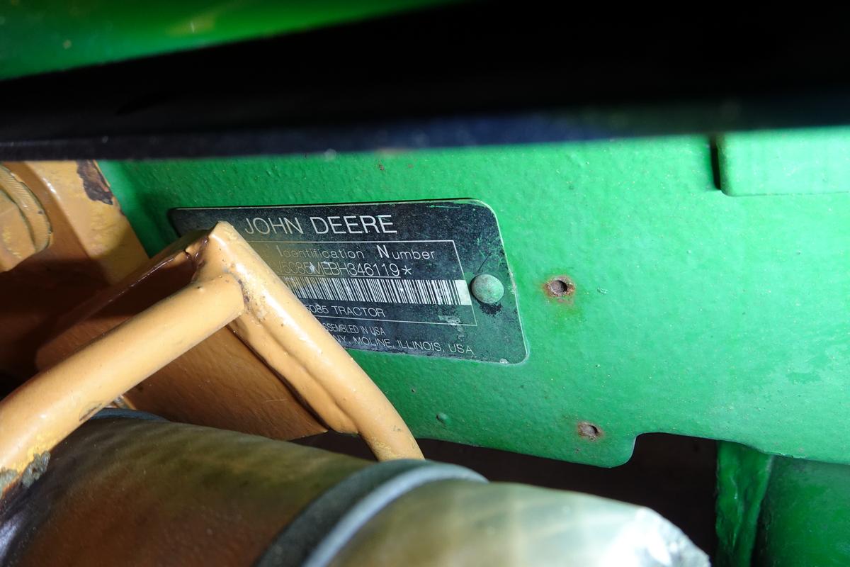 Inventory # 0721251Year: 2011 Make: John Deere Model: 5085M Type: Agricultural Tractor Serial # 1LV5085MEBH346119 Motor: John Deere 4045 4.5L 4 Cylinder Turbo Diesel Mech 85 HP / PTO 70 HP Air To Air: Yes Air Conditioning: Yes (Works) Transmission: 16 Speed Rear: 2WD Tires: 11L-15SL Front - 18.4-30 Rear Rims: 6 Bolt Front - 8 Bolt Rear - Steel Hour Reading: 6,272 Length w/ Everything: 17'4" Length (Tractor Only): 14'4" Width w/ Mower: 7'3" Width (Tractor Only): 8'3" Height: 8'8" Weight: 10,600 lbs Side Mower Details: Alamo Industrial IS62-R Flail Mower - SN 56084, Not Working - Lines Blocked Off, Unknown Condition, 5' Wide - Hydraulic Driven, Pump Front Of Engine Rear Mower Details: Alamo Industrial SH88 3 Point Hitch Mounted Rotary Flail Mower, Works Well, 7'6" Wide - PTO Driven Added Details: Runs And Works Well, 3 Point Hitch, Adjustable Front Axle Position, Enclosed ROPS, Glass Tinted Price: $26,900 Certificate Of Origin - as described 2STXXTBDIJJXXTQPLKDPAHEAJXRT+750+800 Terms of Sale