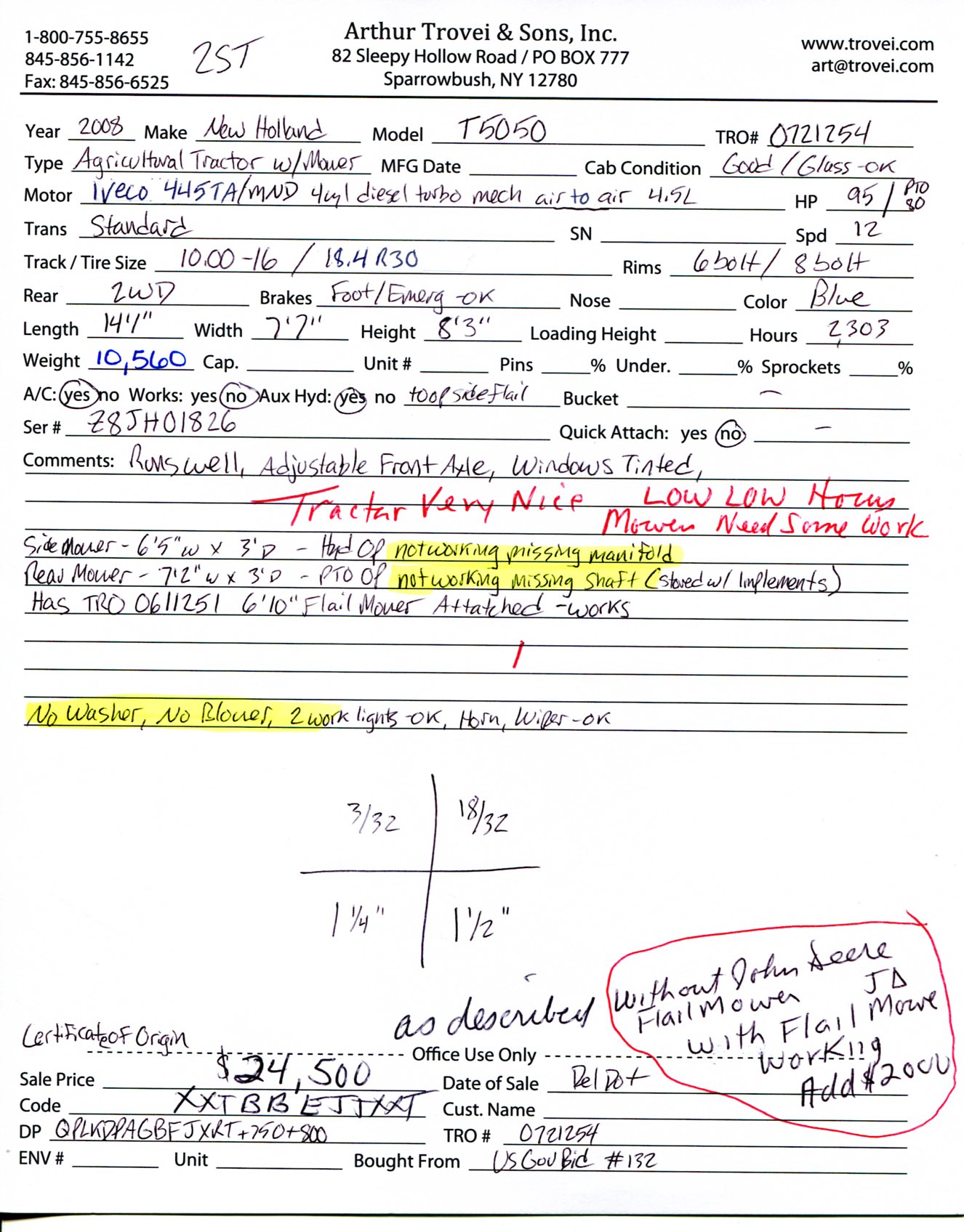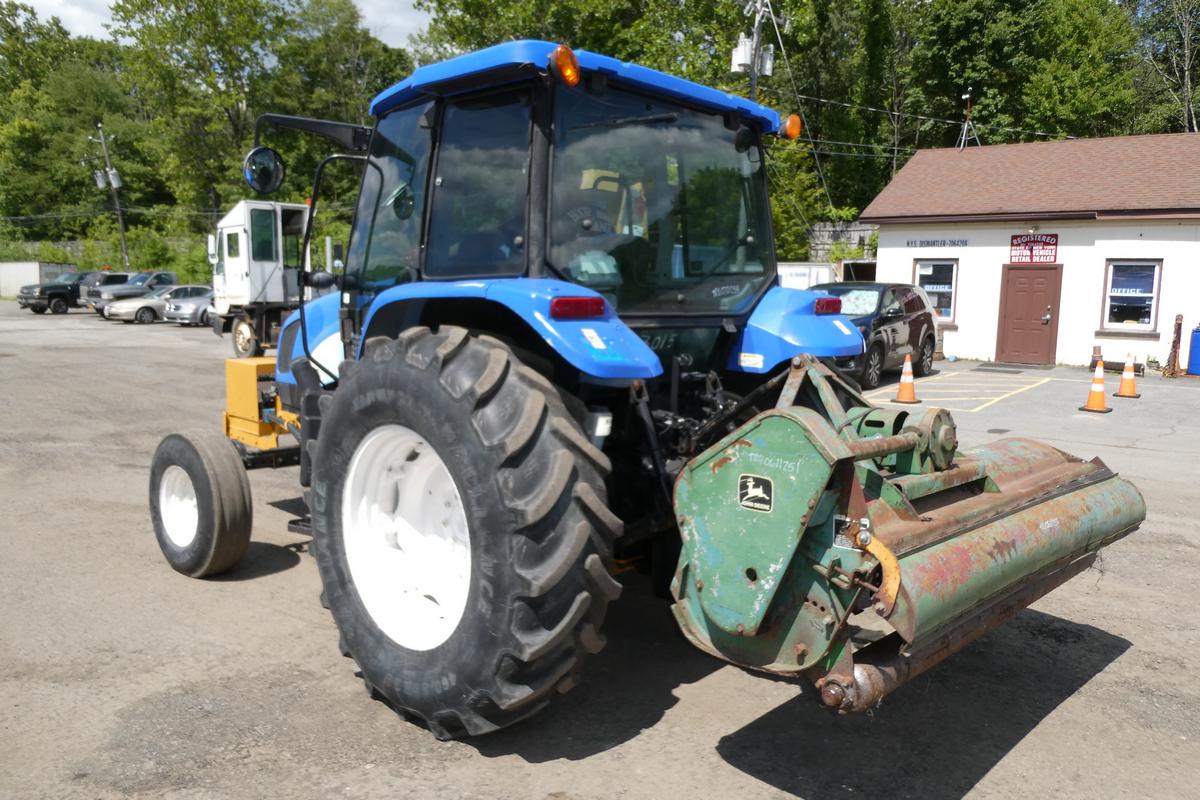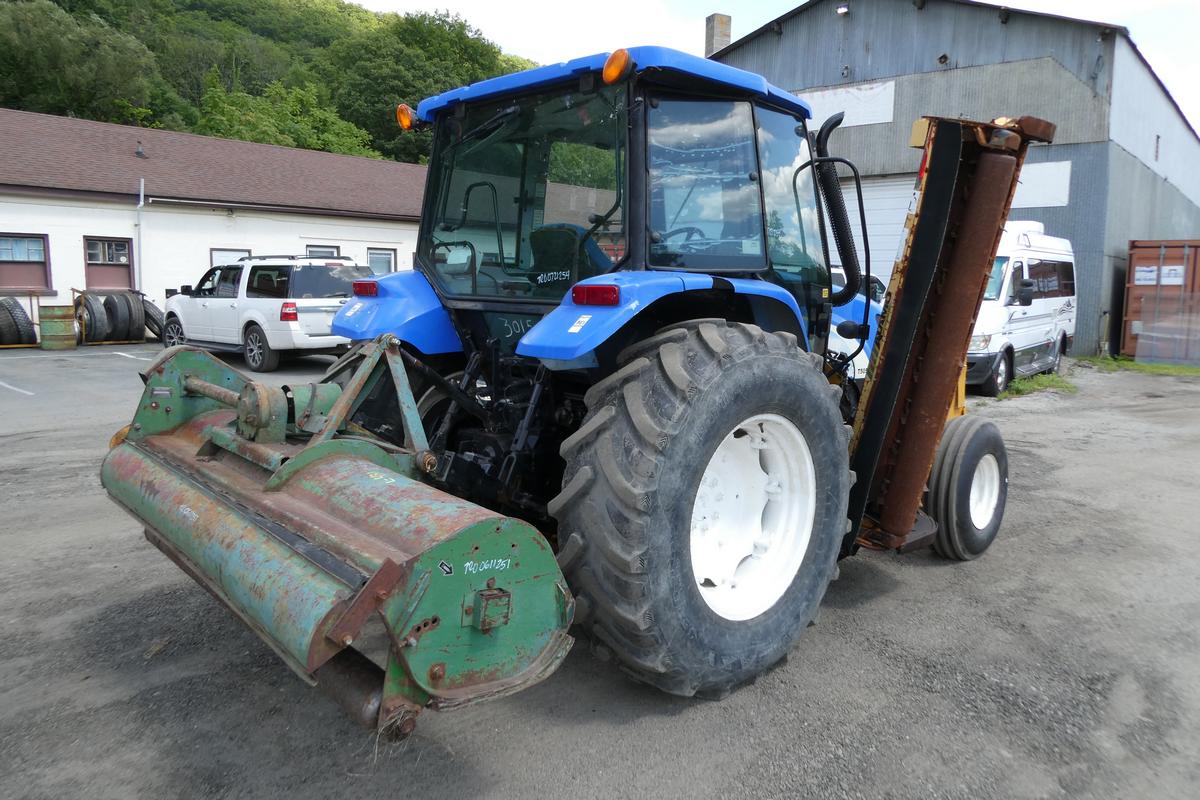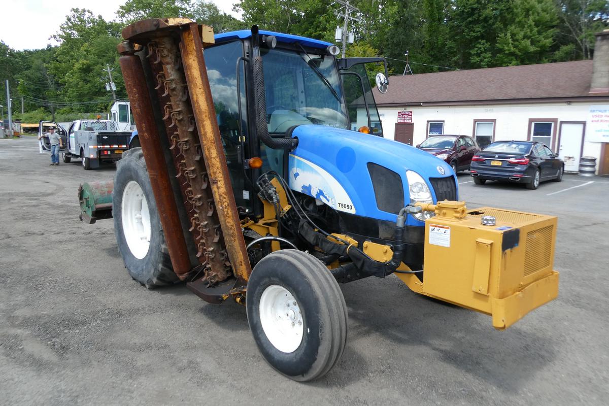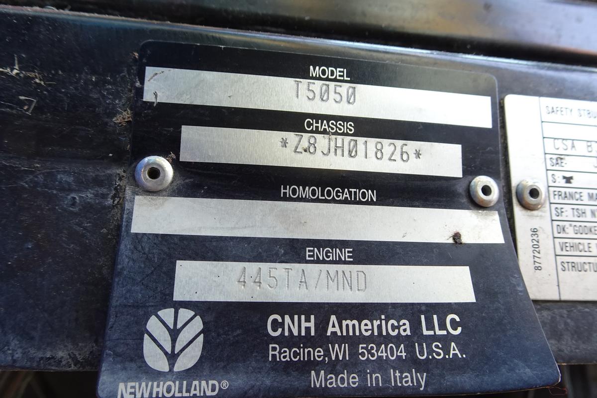 Inventory # 0721254Year: 2008 Make: New Holland Model: T5050 Type: Agricultural Tractor Serial # Z8JH01826 Motor: Iveco 445TA/MND 4.5L 4 Cylinder Turbo Diesel Mech 95 HP / PTO 80 HP Air Conditioning: Yes (Not Working) - No Blower Transmission: 12 Speed Rear: 2WD Tires: 10.00-16 Front - 18.4R30 Rear Rims: 6 Bolt Front - 8 Bolt Rear - Steel Hour Reading: 2,303 Length w/o Rear Mower: 14'1" Width: 7'7" Height: 8'3" Weight: 10,560 lbs Side Mower Details: Alamo Industrial IS74-R Flail Mower - SN 61017, Not Working - Missing Manifold, Unknown Condition, 6'5" Wide - Hydraulic Driven, Pump Front Of Engine Rear Mower Details: Alamo Industrial SH88 3 Point Hitch Mounted Rotary Flail Mower - SN 02751, Not Tested - No Shaft, 7'2" Wide - PTO Driven Added Details: Runs And Works Well, 3 Point Hitch, Adjustable Front Axle Position, Enclosed ROPS, Glass Tinted, Has John Deere Flail Mower Attached TRO 0611251 Not Included, Add $2,000 To Include Price: $24,500 Certificate Of Origin - as described 2STXXTBBEJJXXTQPLKDPAGBFXRT+750+800 Terms of Sale