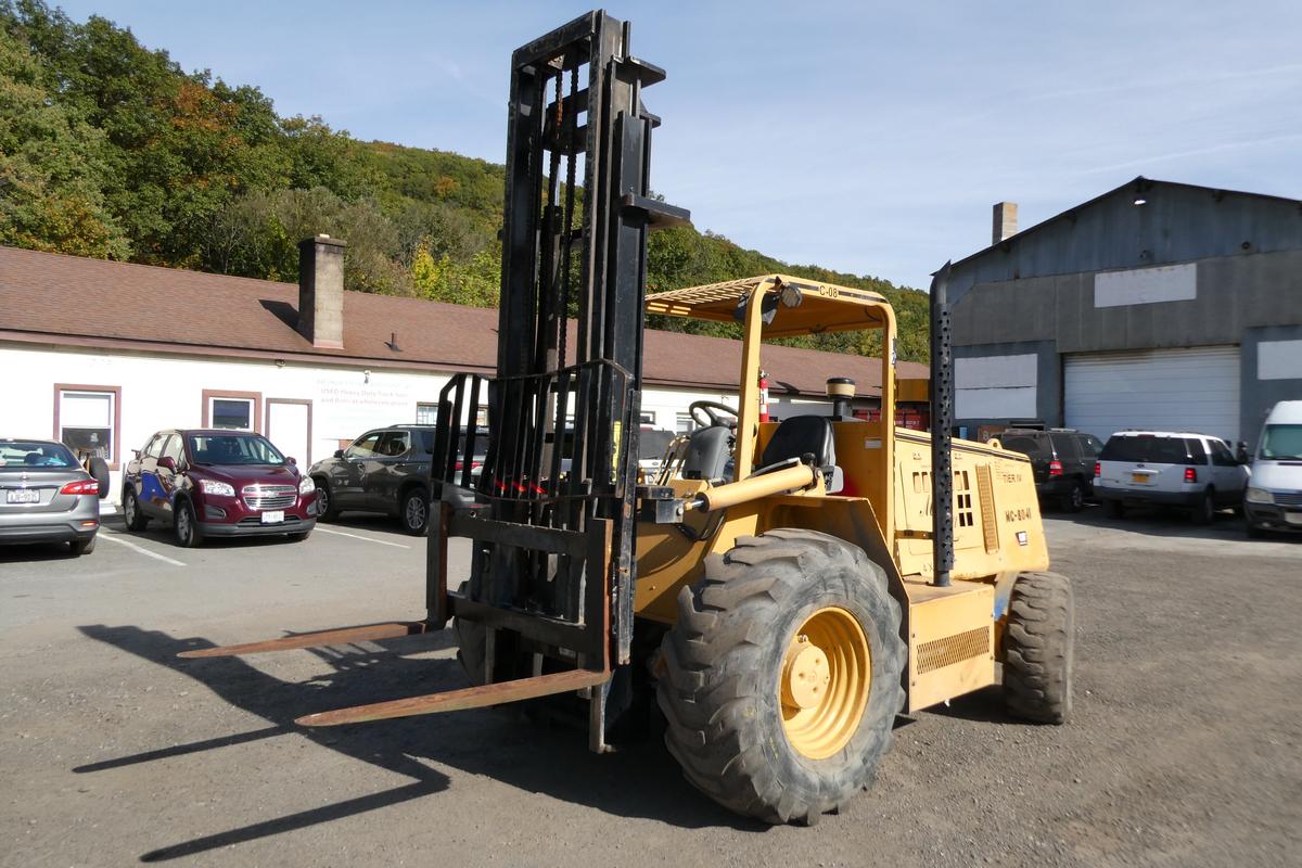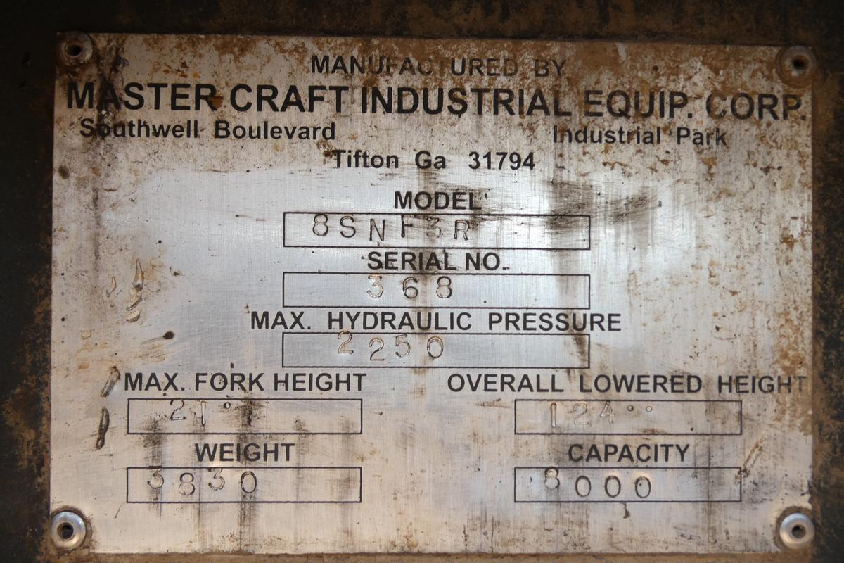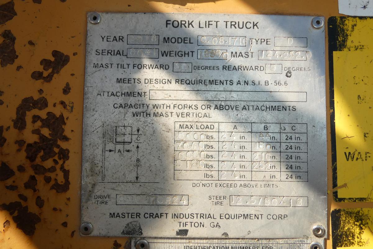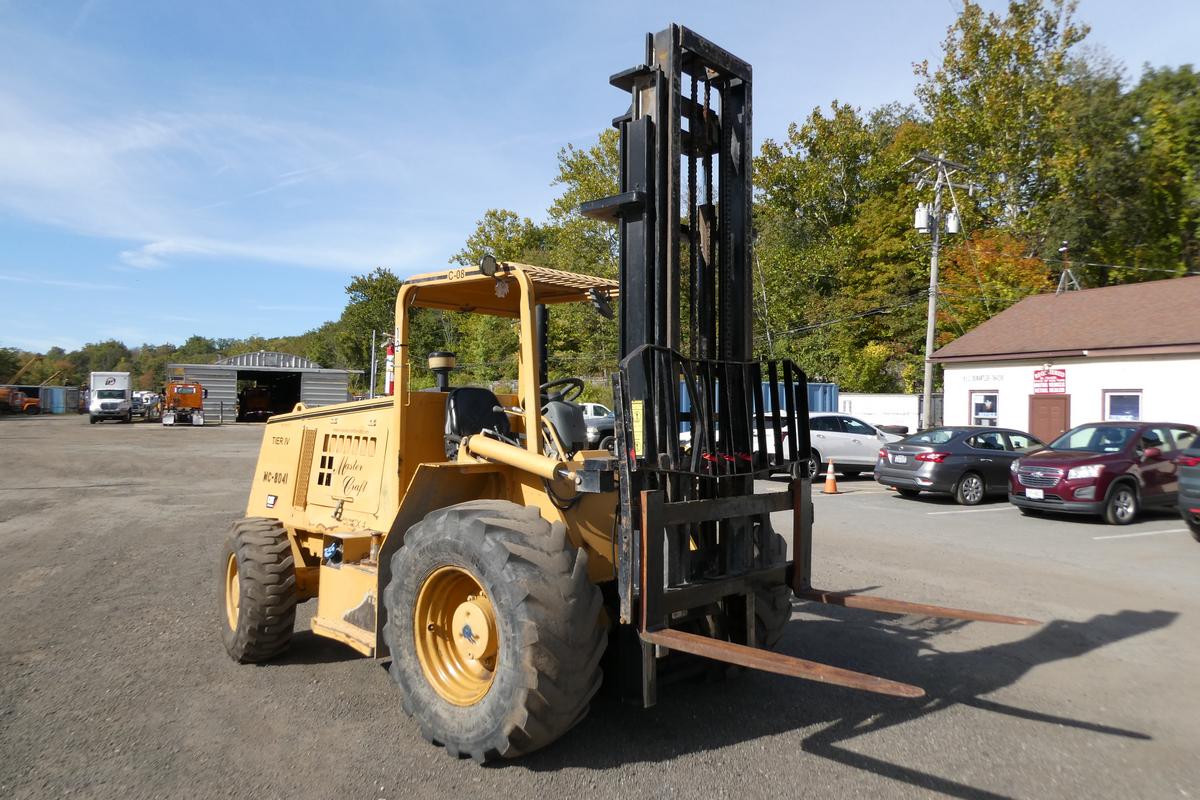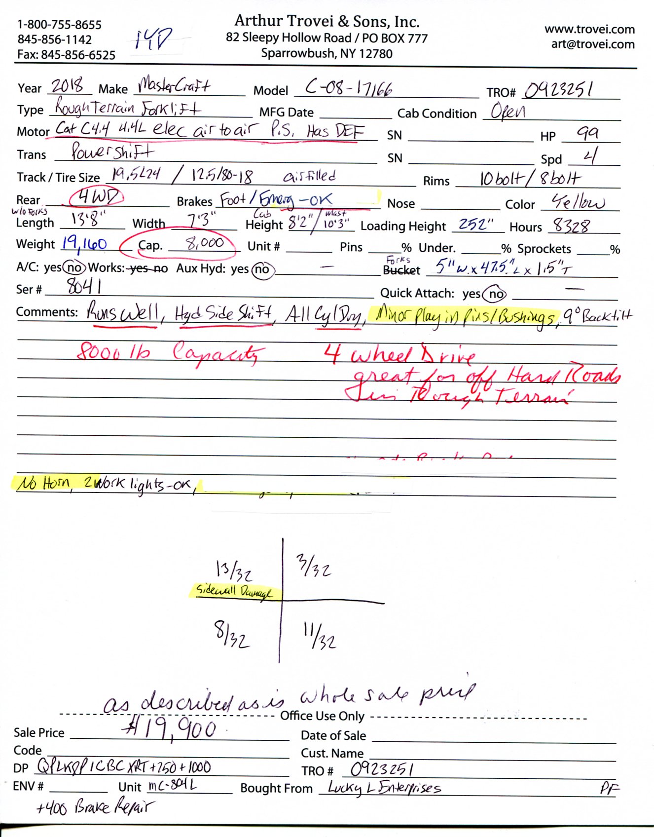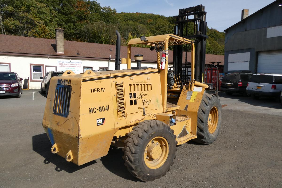 Inventory # 0923251Year: 2018 Make: MasterCraft Model: C08-17166 Type: Rough Terrain Forklift Serial # 8041 Motor: Caterpillar C4.4 4.4L 4 Cylinder Diesel Elec 99 HP Air To Air: Yes DEF: Yes Transmission: Powershift 4 Speed Tires: 19.5L-24 / 12.5/80-18 - Air Filled Rims: 10 Bolt / 8 bolt - Steel Hour Reading: 8,328 Length: 13'8" (without forks) Width: 7'3" Mast Height: 10'3" Cab Height: 8'2" Loading Height: 252" Weight: 19,160 Capacity: 8,000 lb Forks: 5" W x 47.5" L x 1.5" Thick At Base Added Details: Runs Well, 4WD, Power Steering, Minor Play In Pins/Bushings, All Cylinders Dry, Hydraulic Side Shift, Open Cab, Tri Mast, 9 Degrees Backtilt Price: $19,900 as is as described 1YDQPLKDPICBCXRT+750+1000+400 Terms of Sale