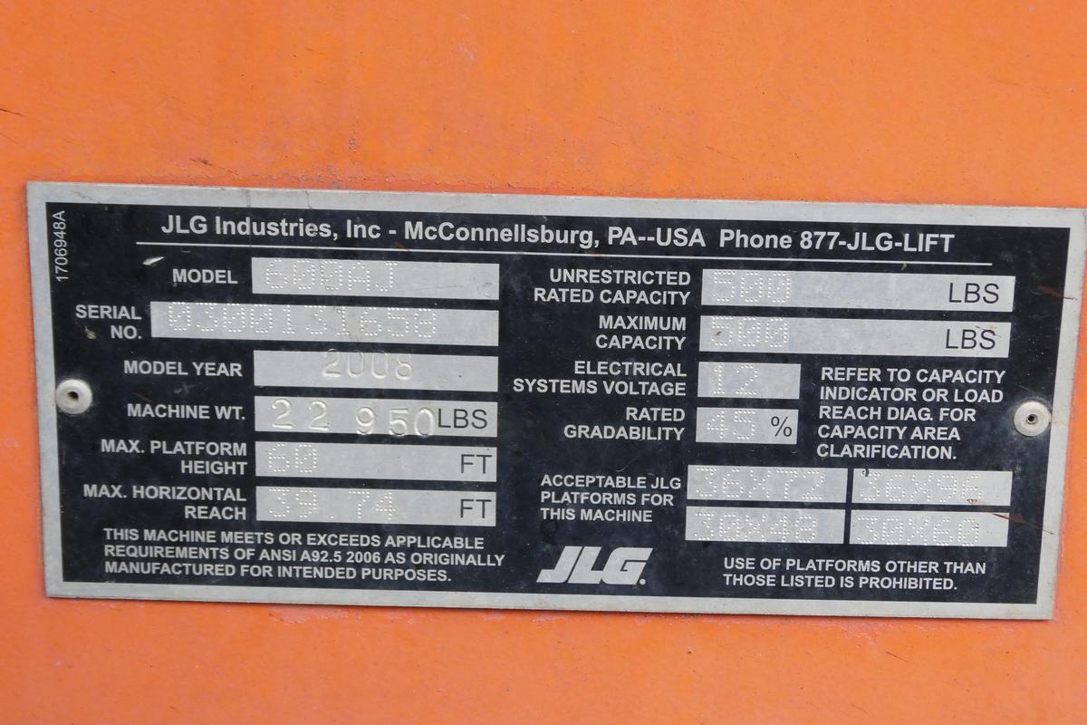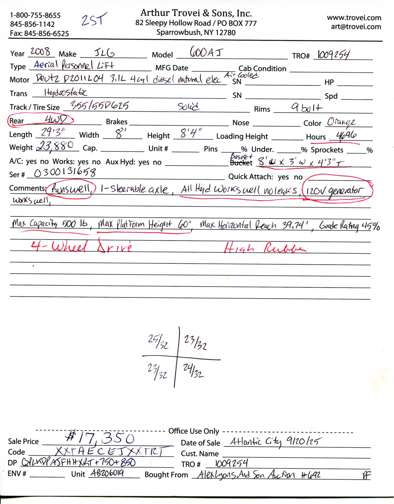 Inventory # 1009254Year: 2008 Make: JLG Model: 600AJ Type: Self Propelled Work Platform Serial # 0300131658 Motor: Deutz D2011l04 3.1L 4 cylinder Air Cooled Natural Elec Inj Diesel Transmission: Hydrostatic Rear: 4WD Tires: 355/55D625 Solid Rims: 9 bolt - Steel Hours: 4,696 (4 Digit) Length: 29'3" Width: 8' Height: 8'4 Weight: 23,880 lb Added Details: Basket And Ground Controls, Max Capacity 500 lb, 60' Max Platform Height, 39'9" Max Horizontal Reach, 4 Wheel Drive, 2 Wheel Steering, All Hydraulics Work Well With No Leaks, 3' W x 8' L x 4'3" T Basket, Max Two Occupants Price: $17,350 2STXXTAECEJXRTQPLKDPAJFHHXRT+750+850 Terms of Sale
