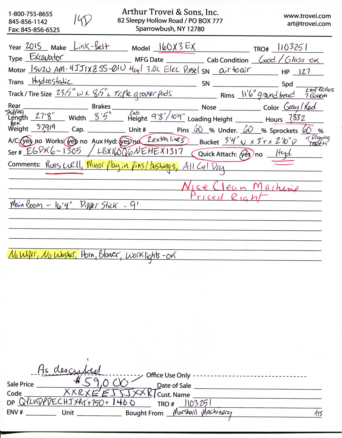 Inventory # 1103251Year: 2015 Make: Link-Belt Model: 160X3EX Type: Excavator Serial # EGDK6-1305 / LBX160Q6NEHEX1317 Motor: Isuzu AM-4JJ1XZSS-01U 4 Cylinder Diesel Elec 127 HP Air to Air: Yes Air Conditioning: Yes (Works) Transmission: Hydrostatic Tracks: 23.5" W x 8.5" L Triple Grouser Pads - 2 Top Roller, 7 Bottom Rollers Ground Tread: 11'6" Hour Reading: 7,832 Shipping Length: 27'8" Width: 8'5" Cab Height: 9'8" Boom Height: 10'9" Book Weight: 37,919 Boom Details: 16'4" Boom With 9' Dipper Stick Bucket Details: 3'4" W x 2'10" D x 3' T - Hydraulic Quick Disconnect Bucket - 5 Digging Teeth Added Details: Runs Well, All Cylinders Dry, Minor Play In Pins And Bushings, Enclosed Cab, Joystick Control, 2 Extra Hydraulic Lines Price: $59,000 as described 1YDXXRXEEJJJXXRTQPLKDPDECHJXRT+750+1400 Print This Page | Back to Excavators Inventory | Ask A Question Terms of Sale