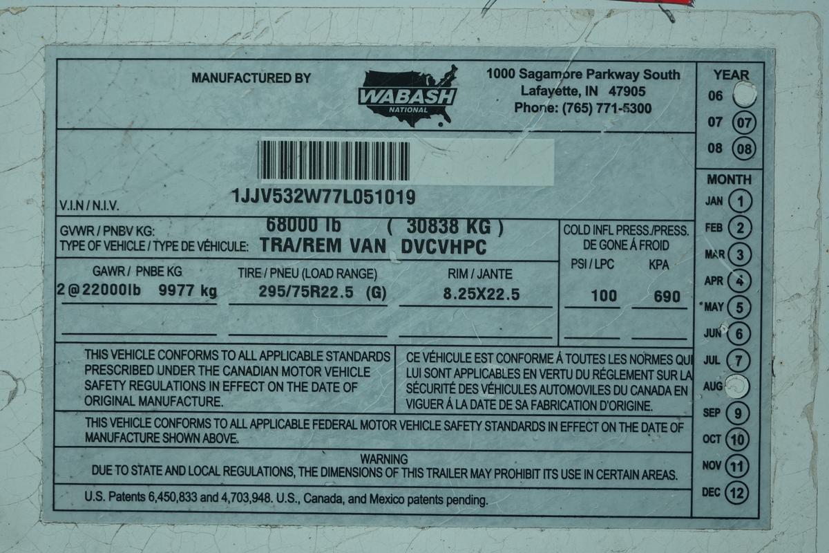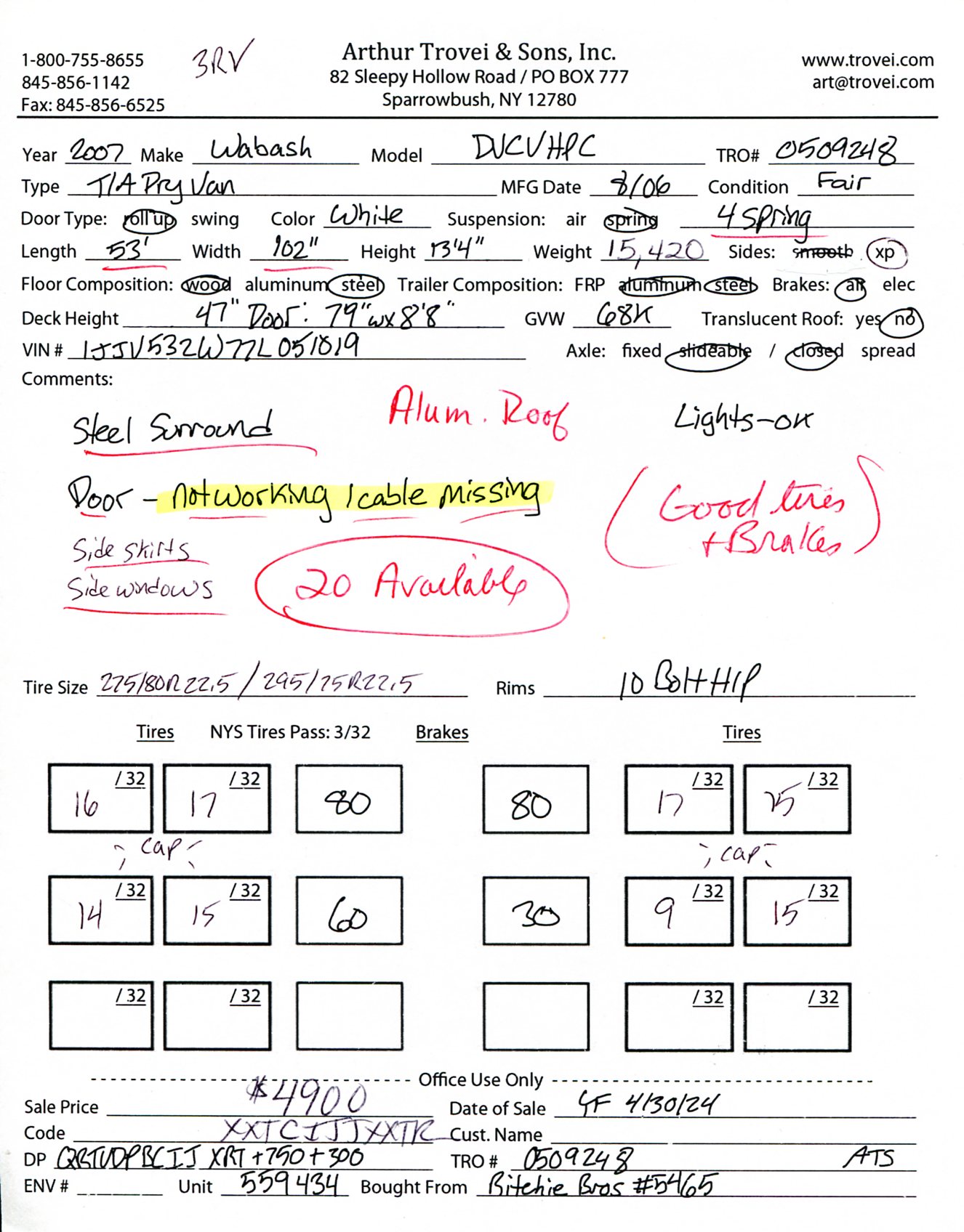 Inventory # 0509248Year: 2007 Make: Wabash Model: DVCVHPC Axles: Slideable Closed Tandem Type: Dry Box Trailer VIN: 1JJV532W77L051019 Suspension: 4 Spring Tires: 275/80R22.5 / 295/75R22.5 Rims: 10 Bolt Hub Pilot - Steel Length: 53' Width: 102" Height: 13'4" Weight: 15,420 lb Load Width: 7'9" Load Height: 8'8" GVWR: 68,000 lb Trailer Composition: Aluminum / Steel Floor Composition: Wood / Steel Door Type: Roll Up Door - Not Working (1 Cable Missing) - Steel Surround Added Details: Aluminum Roof, Air Brakes, Side Skirts, Side Windows Price: $4,900 3RVXXTCIJJXXTRQRTVDPBCIJXRT+750+300 Terms of Sale