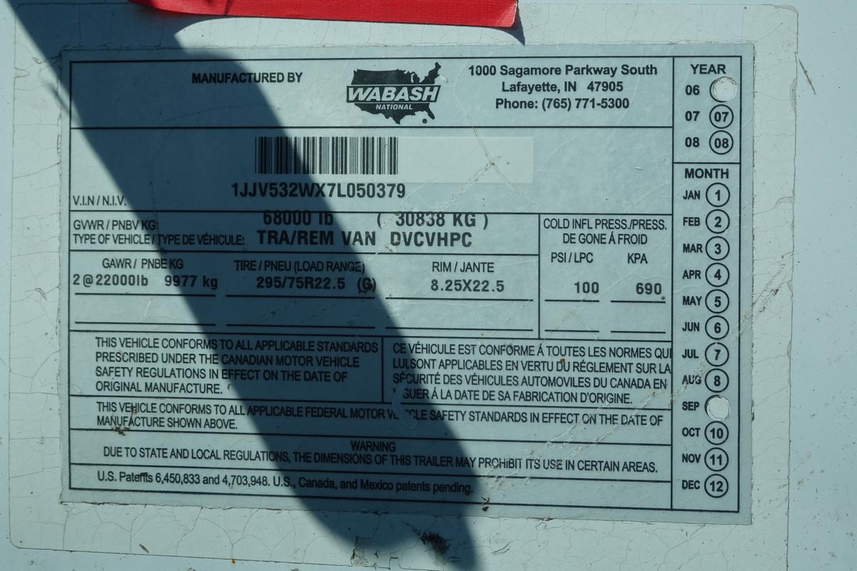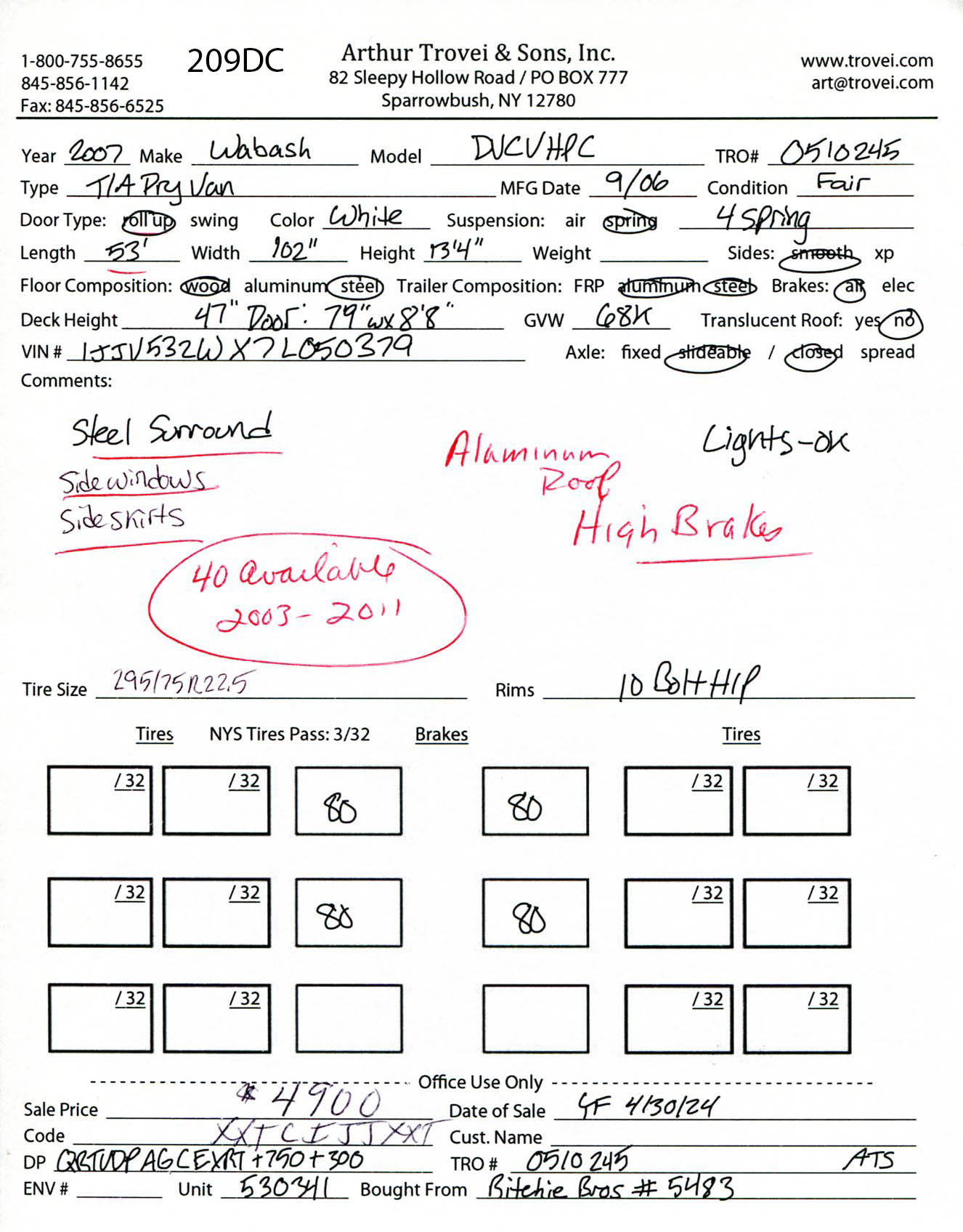 Inventory # 0510245Year: 2007 Make: Wabash Model: DVCVHPC Axles: Slideable Closed Tandem Type: Dry Box Trailer VIN: 1JJV532WX7L050379 Suspension: 4 Spring Tires: 295/75R22.5 Rims: 10 Bolt Hub Pilot - Steel Length: 53' Width: 102" Height: 13'4" Weight (Estimated): 15,460 lbs Load Width: 7'9" Load Height: 8'8" GVWR: 68,000 lb Trailer Composition: Aluminum / Steel Floor Composition: Wood / Steel Door Type: Roll Up Door - Steel Surround Added Details: Aluminum Roof, Air Brakes, Side Windows, Side Skirts Price: $4,900 209DCXXTCIJJXXTRQRTVDPAGCEXRT+750+300 Terms of Sale