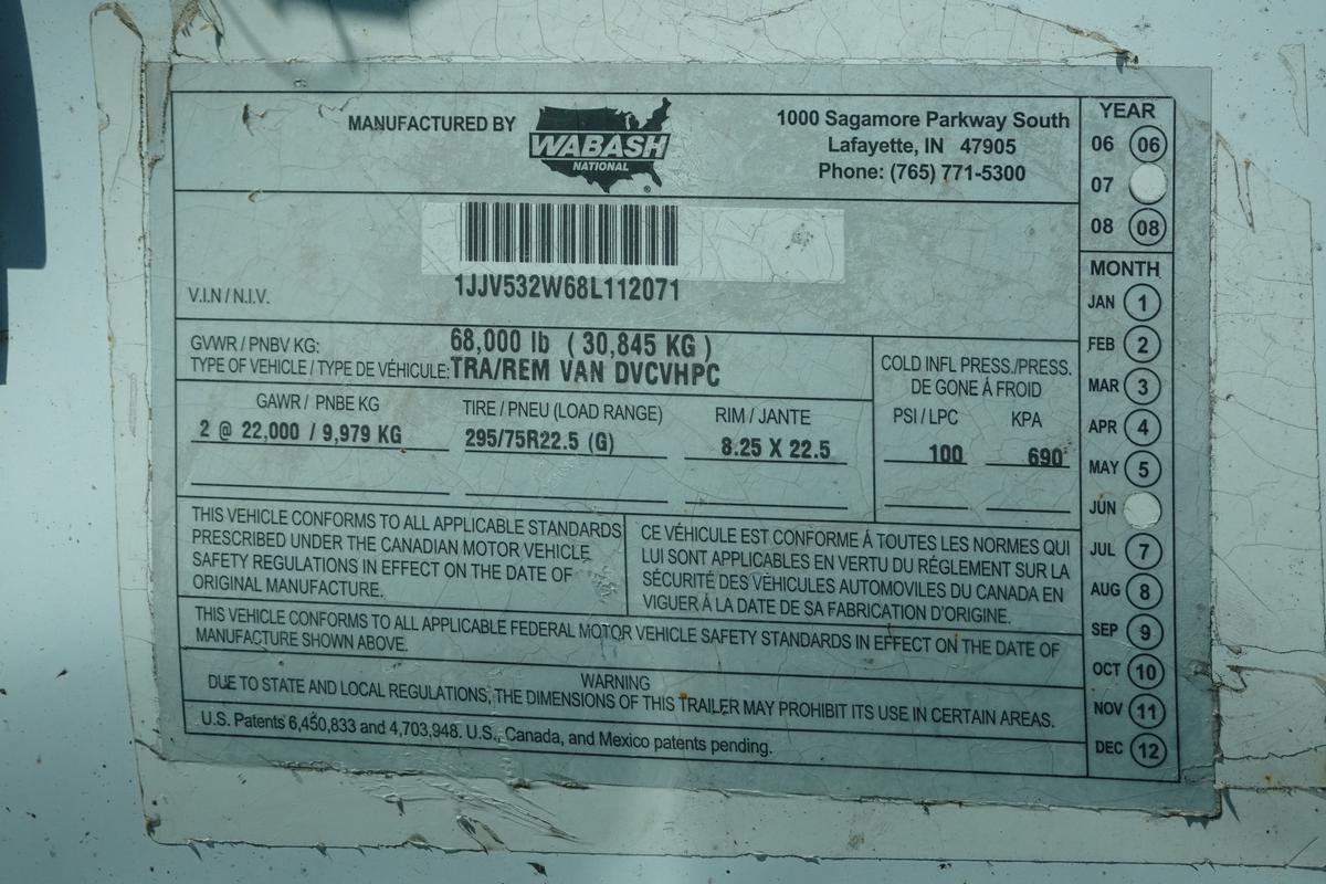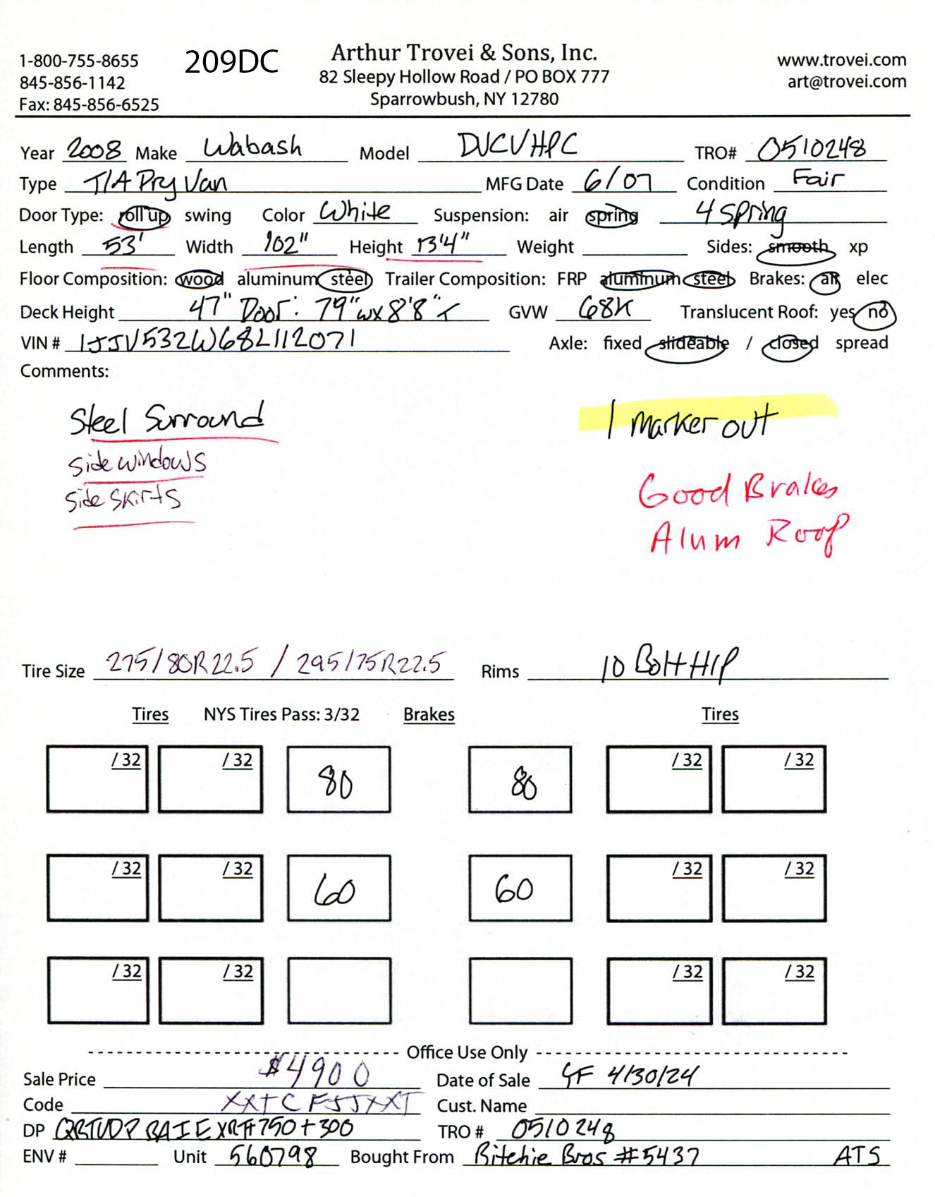 Inventory # 0510248Year: 2008 Make: Wabash Model: DVCVHPC Axles: Slideable Closed Tandem Type: Dry Box Trailer VIN: 1JJV532W68L112071 Suspension: 4 Spring Tires: 275/80R22.5 / 295/75R22.5 Rims: 10 Bolt Hub Pilot - Steel Length: 53' Width: 102" Height: 13'4" Weight (Estimated): 14,760 lb Load Width: 7'9" Load Height: 8'8" GVWR: 68,000 lb Trailer Composition: Aluminum / Steel Floor Composition: Wood / Steel Door Type: Roll Up Door - Steel Surround Added Details: Aluminum Roof, Side Windows, Side Skirts Price: $4,900 209DCXXTCFJJXXTQPLKDPBAIEXRT+750+300 Terms of Sale