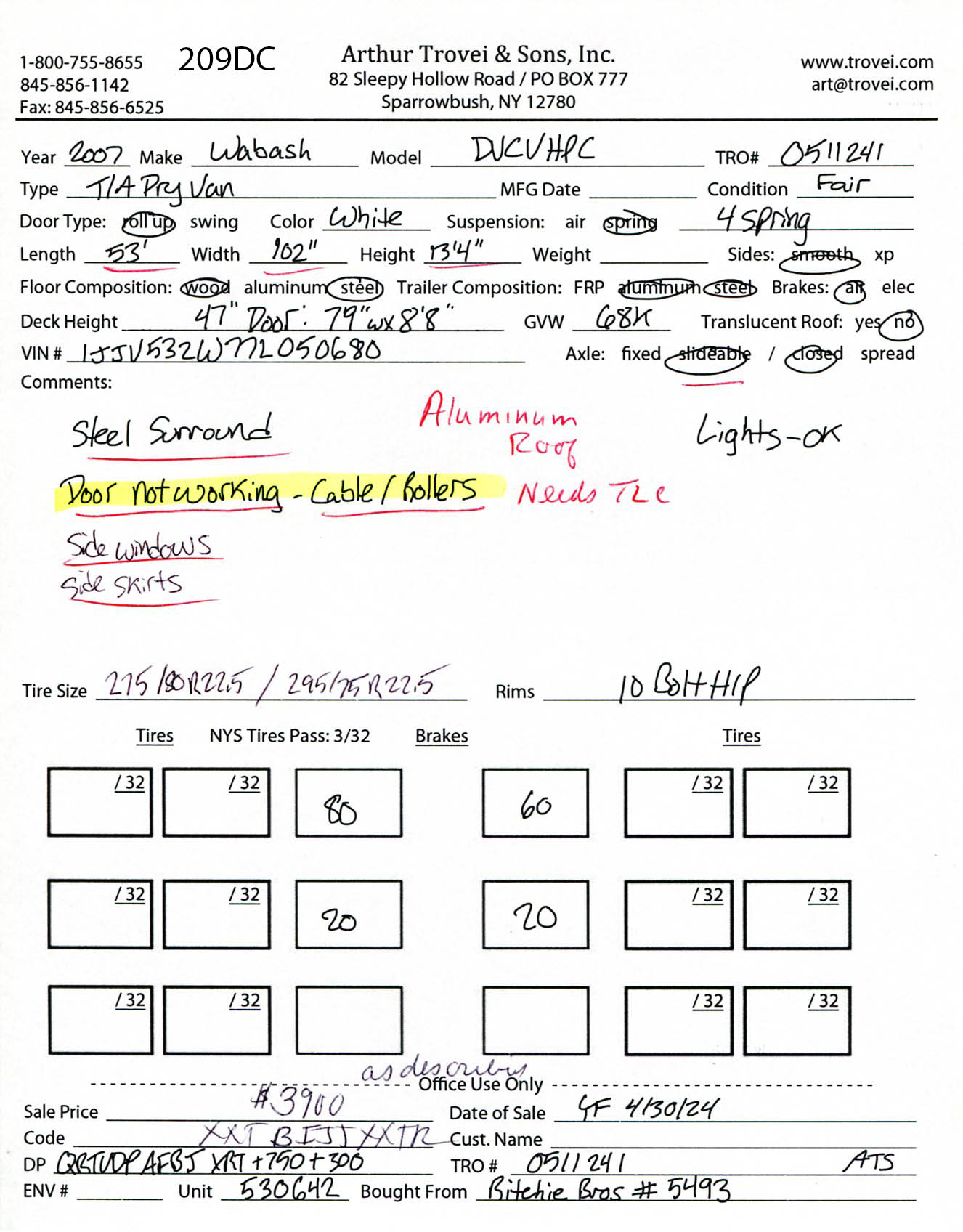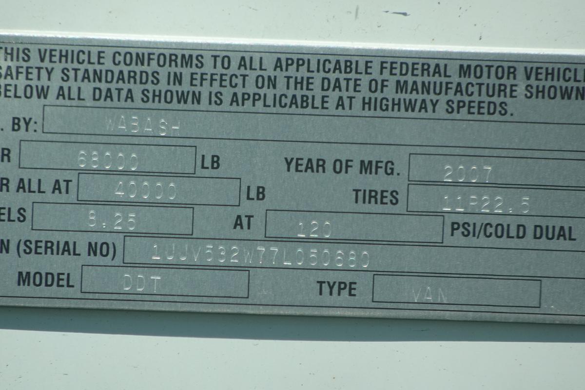 Inventory # 0511241Year: 2007 Make: Wabash Model: DVCVHPC Axles: Slideable Closed Tandem Type: Dry Box Trailer VIN: 1JJV532W77L050680 Suspension: 4 Spring Tires: 275/80R22.5 / 295/75R22.5 Rims: 10 Bolt Hub Pilot - Steel Length: 53' Width: 102" Height: 13'4" Weight (Estimated): 15,460 lbs Load Width: 7'9" Load Height: 8'8" GVWR: 68,000 lb Trailer Composition: Aluminum / Steel Floor Composition: Wood / Steel Door Type: Roll Up Door - Steel Surround (Not Working Cable / Rollers) Added Details: Aluminum Roof, Air Brakes, Side Windows, Side Skirts Price: $3,900 as described 209DCXXTBIJJXXTRQRTVDPAFBJXRT+750+300 Terms of Sale