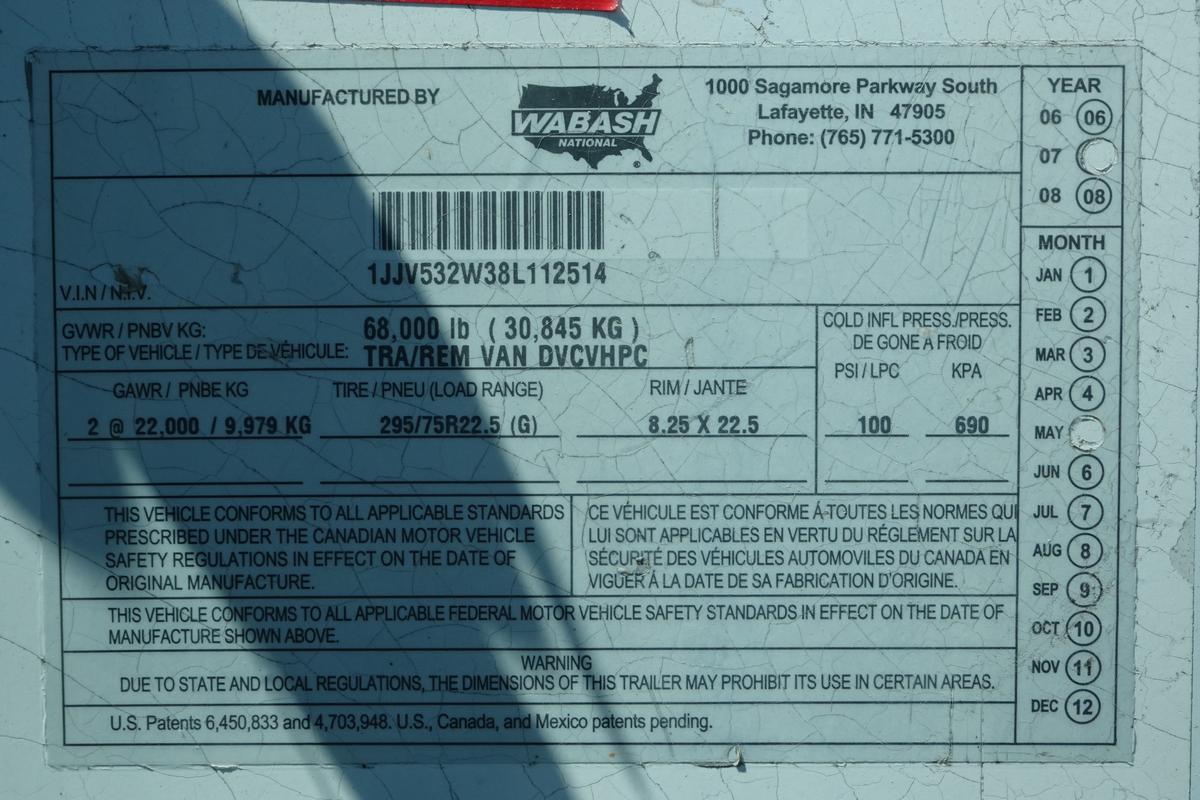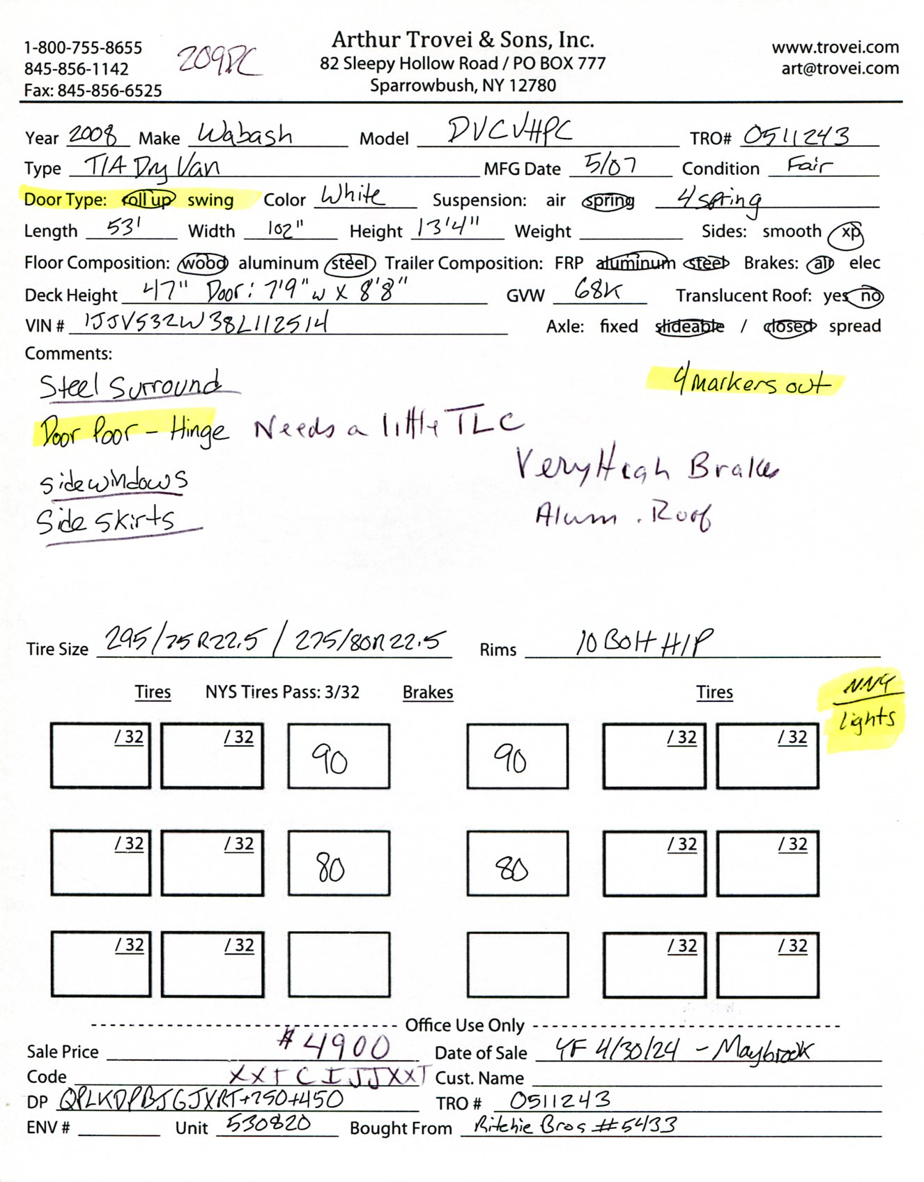 Inventory # 0511243Year: 2008 Make: Wabash Model: DVCVHPC Axles: Slideable Closed Tandem Type: Dry Box Trailer VIN: 1JJV532W38L112514 Suspension: 4 Spring Tires: 275/80R22.5 / 295/75R22.5 Rims: 10 Bolt Hub Pilot - Steel Length: 53' Width: 102" Height: 13'4" Weight (Estimated): 14,760 lb Load Width: 7'9" Load Height: 8'8" GVWR: 68,000 lb Trailer Composition: Aluminum / Steel Floor Composition: Wood / Steel Door Type: Roll Up Door - Steel Surround (Poor - Hinge) Added Details: Vertical Logistics, Side Windows, Side Skirts Price: $4,900 NNY 209DCXTRCIJJXXTQPLKDPBJGJXRT+750+300 Terms of Sale