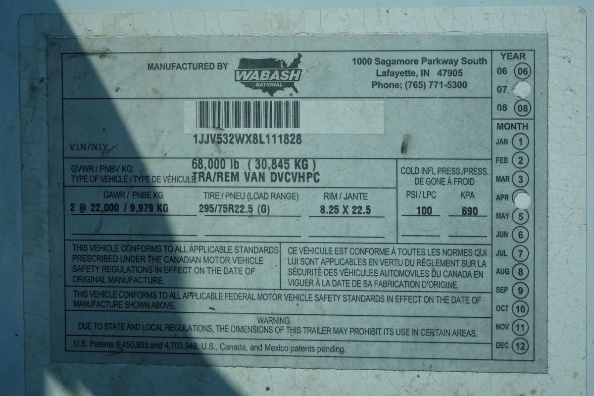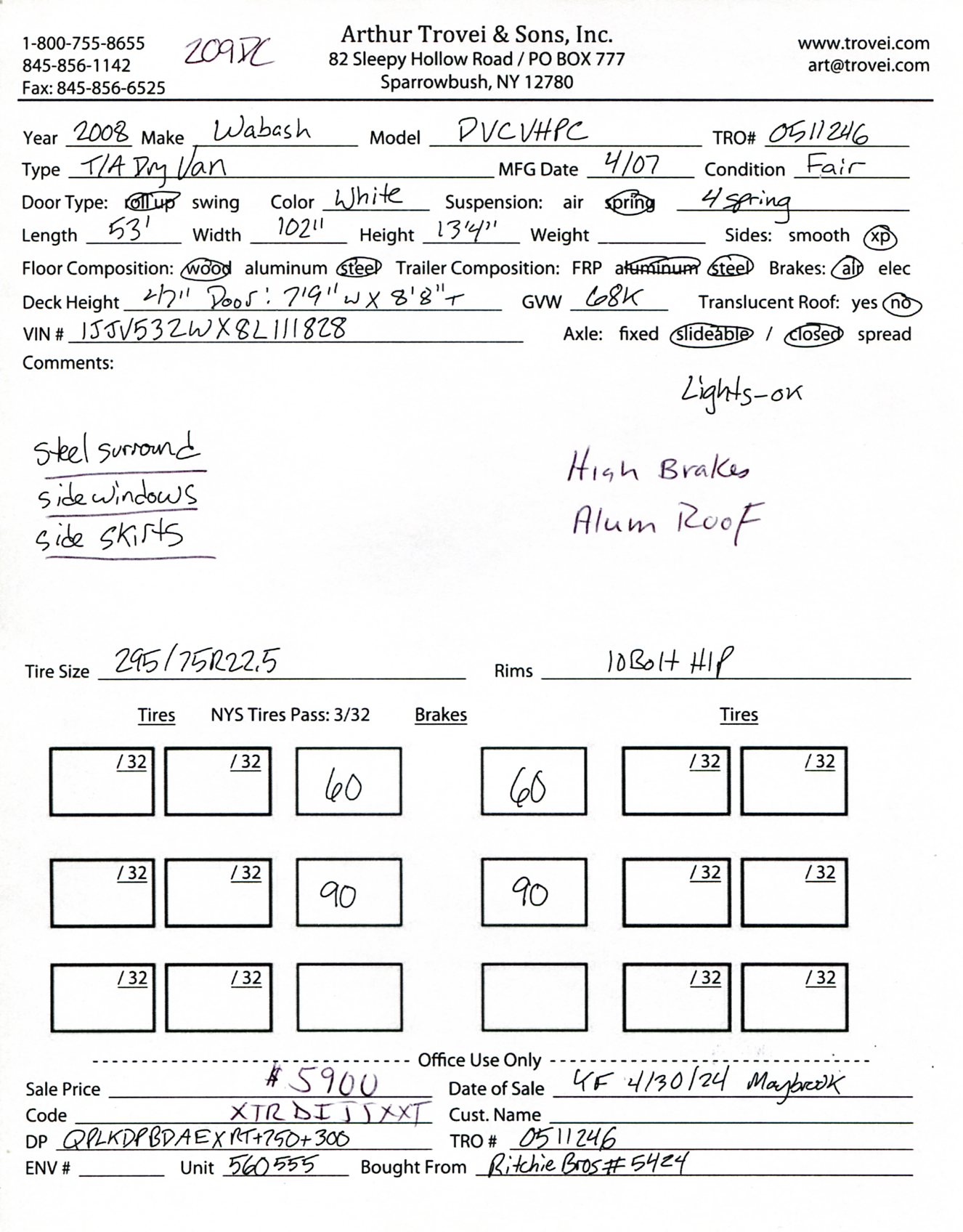 Inventory # 0511246Year: 2008 Make: Wabash Model: DVCVHPC Axles: Slideable Closed Tandem Type: Dry Box Trailer VIN: 1JJV532WX8L111828 Suspension: 4 Spring Tires: 295/75R22.5 Rims: 10 Bolt Hub Pilot - Steel Length: 53' Width: 102" Height: 13'4" Weight (Estimated): 14,760 lb Load Width: 7'9" Load Height: 8'8" GVWR: 68,000 lb Trailer Composition: Aluminum / Steel Floor Composition: Wood / Steel Door Type: Roll Up Door - Steel Surround Added Details: Vertical Logistics, Side Windows, Side Skirts Price: $5,900 209DCXTRDIJJXXTQPLKDPBDAEXRT+750+300 Terms of Sale