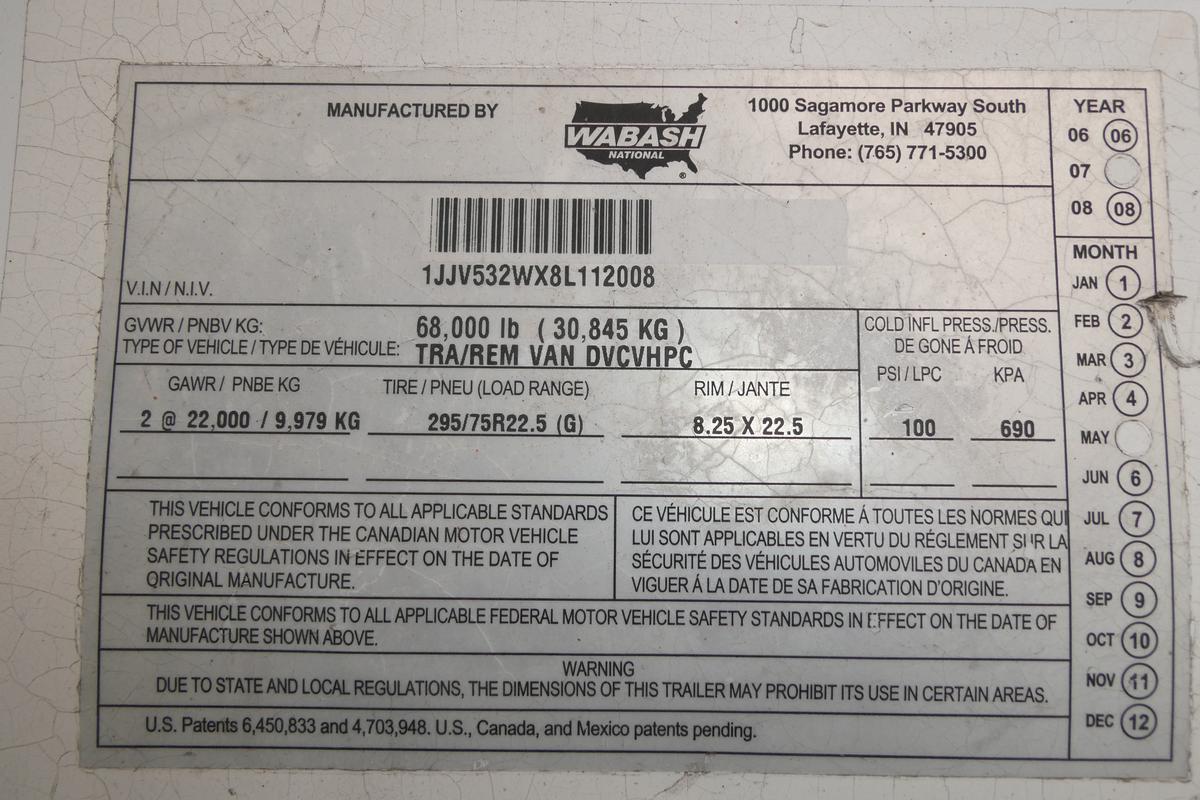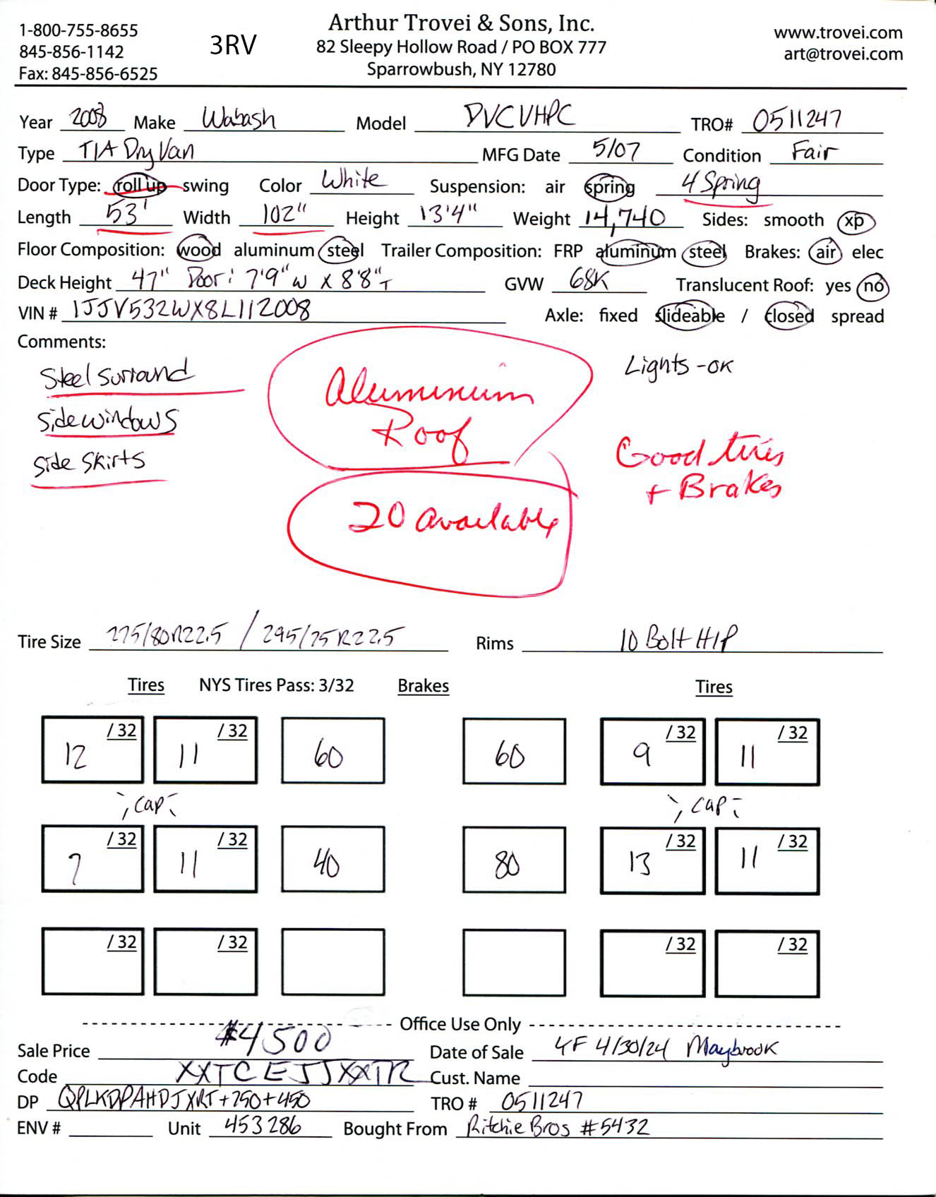 Inventory # 0511247Year: 2008 Make: Wabash Model: DVCVHPC Axles: Slideable Closed Tandem Type: Dry Box Trailer VIN: 1JJV532WX8L112008 Suspension: 4 Spring Tires: 275/80R22.5 / 295/75R22.5 Rims: 10 Bolt Hub Pilot - Steel Length: 53' Width: 102" Height: 13'4" Weight: 14,740 lb Load Width: 7'9" Load Height: 8'8" GVWR: 68,000 lb Trailer Composition: Aluminum / Steel Floor Composition: Wood / Steel Door Type: Roll Up Door - Steel Surround Added Details: Aluminum Roof, Vertical Logistics, Side Windows, Side Skirts Price: $4,500 3RVXXTCEJJXXTRQPLKDPAHDJXRT+750+450 Terms of Sale