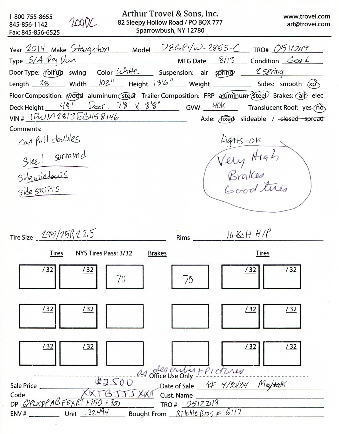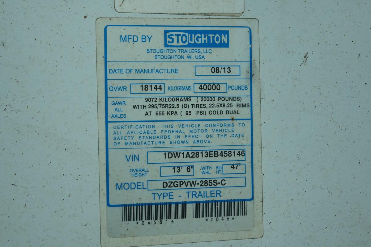 Inventory # 0512249Year: 2014 Make: Stoughton Model: DZGPVW-285S-C Axles: Fixed Single Type: Dry Box Trailer VIN: 1DW1A2813EB458146 Suspension: 2 Spring Tires: 295/75R22.5 Rims: 10 Bolt Hub Pilot - Steel Length: 28' Width: 102" Height: 13'6" Weight (Approximate): 8,540 lb GVW: 40,000 lb Floor Composition: Wood / Steel Trailer Composition: Steel / Aluminum Door Type: Roll Up - Steel Surround Door Opening Width: 7'8" Door Opening Height: 8'8" Added Details: Air Brakes, Can Pull Doubles, Aluminum Roof, Side Windows, Side Skirts Price: $2,500 as described as pictured 209DCXXTBJJJXXTQPLKDPABFEXRT+750+300 Terms of Sale