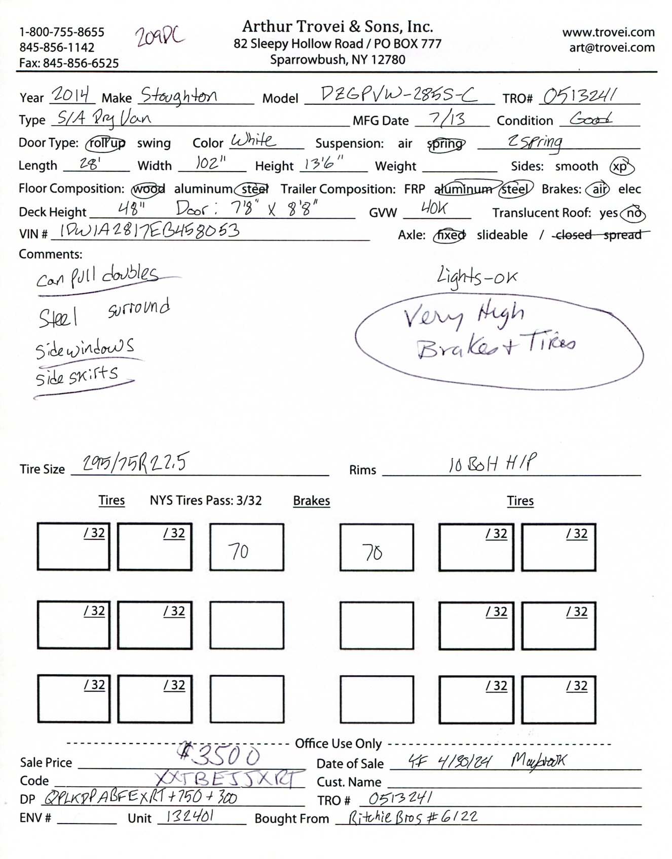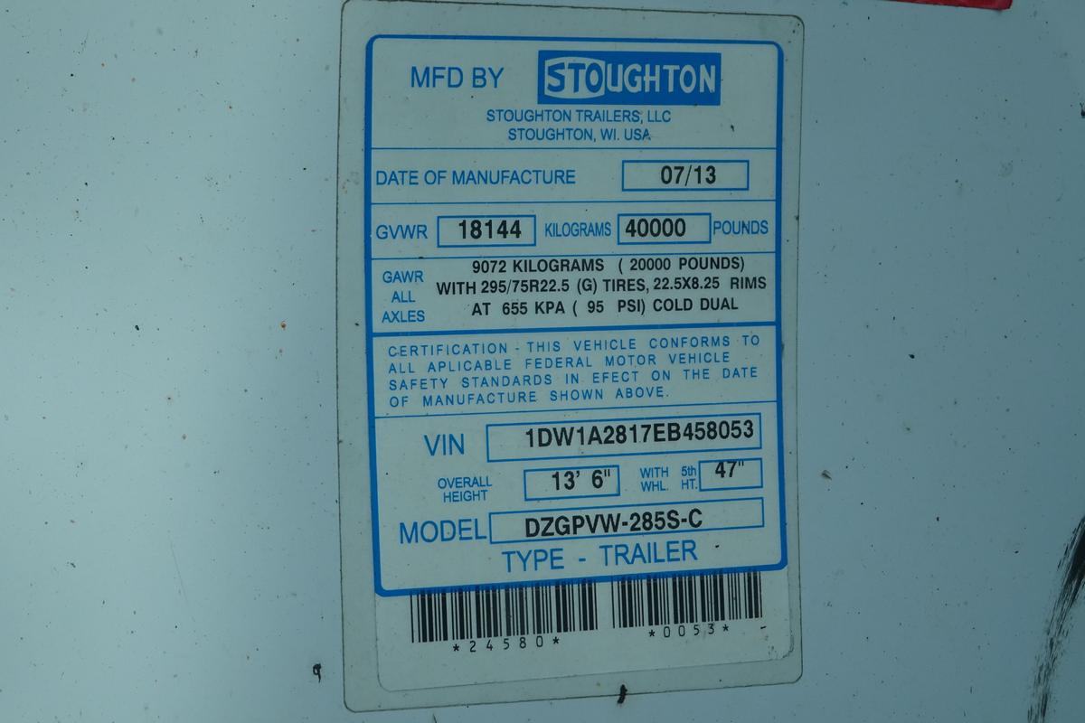 Inventory # 0513241Year: 2014 Make: Stoughton Model: DZGPVW-285S-C Axles: Fixed Single Type: Dry Box Trailer VIN: 1DW1A2817EB458053 Suspension: 2 Spring Tires: 295/75R22.5 Rims: 10 Bolt Hub Pilot - Steel Length: 28' Width: 102" Height: 13'6" Weight (Approximate): 8,540 lb GVW: 40,000 lb Floor Composition: Wood / Steel Trailer Composition: Steel / Aluminum Door Type: Roll Up - Steel Surround Door Opening Width: 7'8" Door Opening Height: 8'8" Added Details: Air Brakes, Can Pull Doubles, Aluminum Roof, Side Windows, Side Skirts Price: $3,500 209DCXXTBEJJXXTQPLKDPABFEXRT+750+300 Terms of Sale