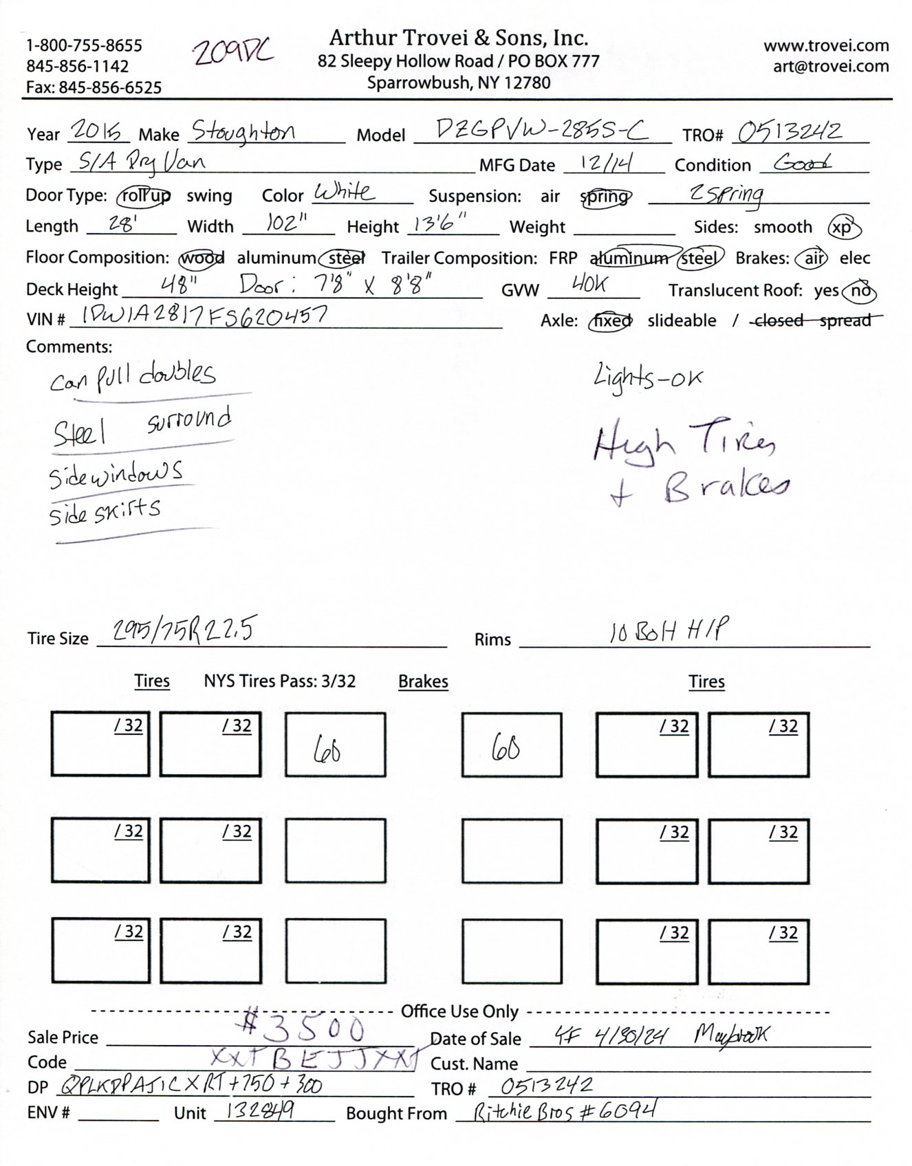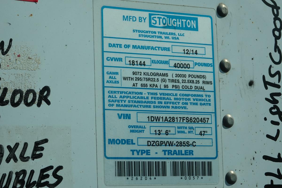 Inventory # 0513242Year: 2015 Make: Stoughton Model: DZGPVW-285S-C Axles: Fixed Single Type: Dry Box Trailer VIN: 1DW1A2817FS620457 Suspension: 2 Spring Tires: 295/75R22.5 Rims: 10 Bolt Hub Pilot - Steel Length: 28' Width: 102" Height: 13'6" Weight (Approximate): 8,260 lb GVW: 40,000 lb Floor Composition: Wood / Steel Trailer Composition: Steel / Aluminum Door Type: Roll Up - Steel Surround Door Opening Width: 7'9" Door Opening Height: 8'9" Added Details: Air Brakes, Can Pull Doubles, Aluminum Roof, Side Windows, Side Skirts Price: $3,500 209DCXXTBEJJXXTQPLKDPAJIC+750+300 Terms of Sale