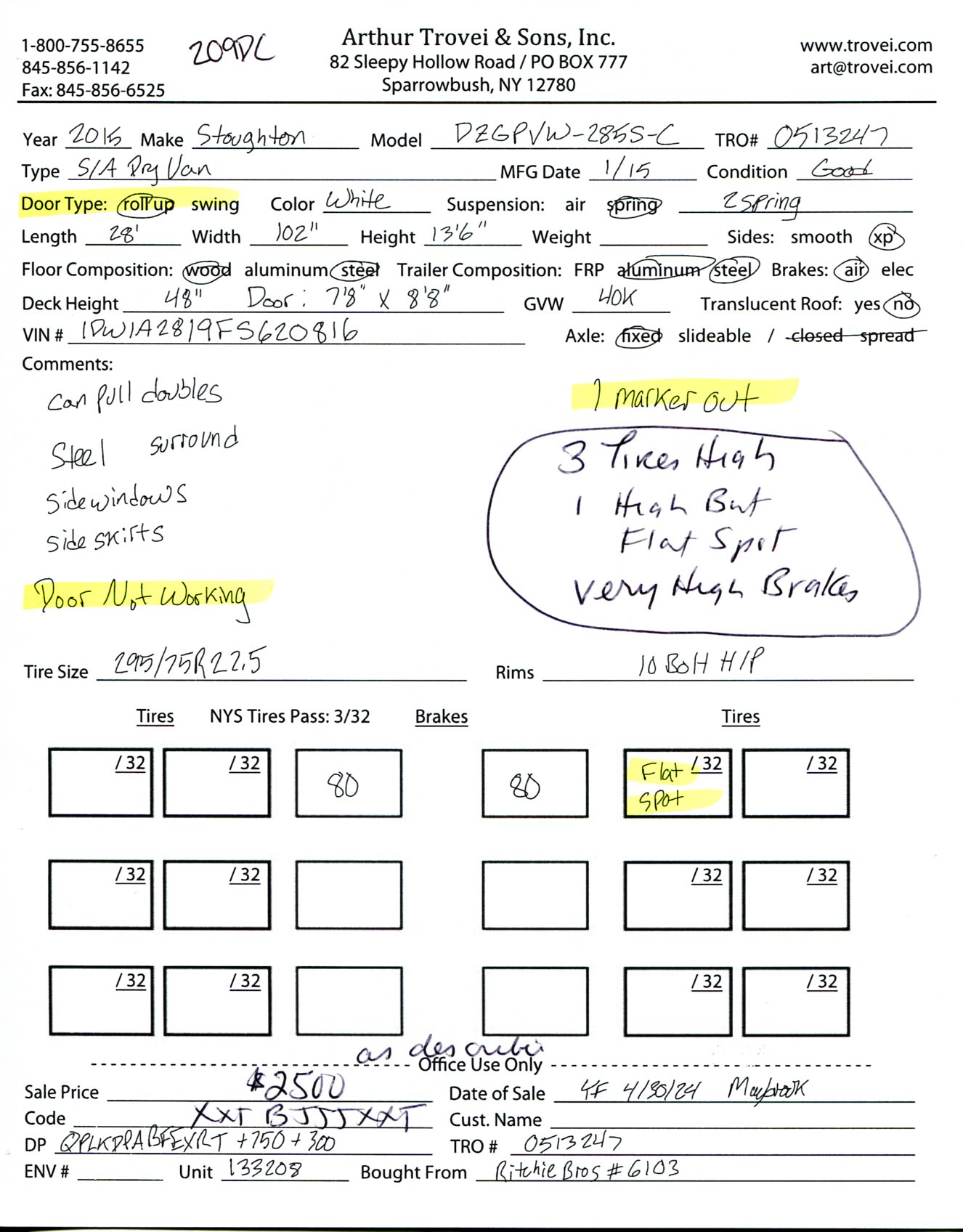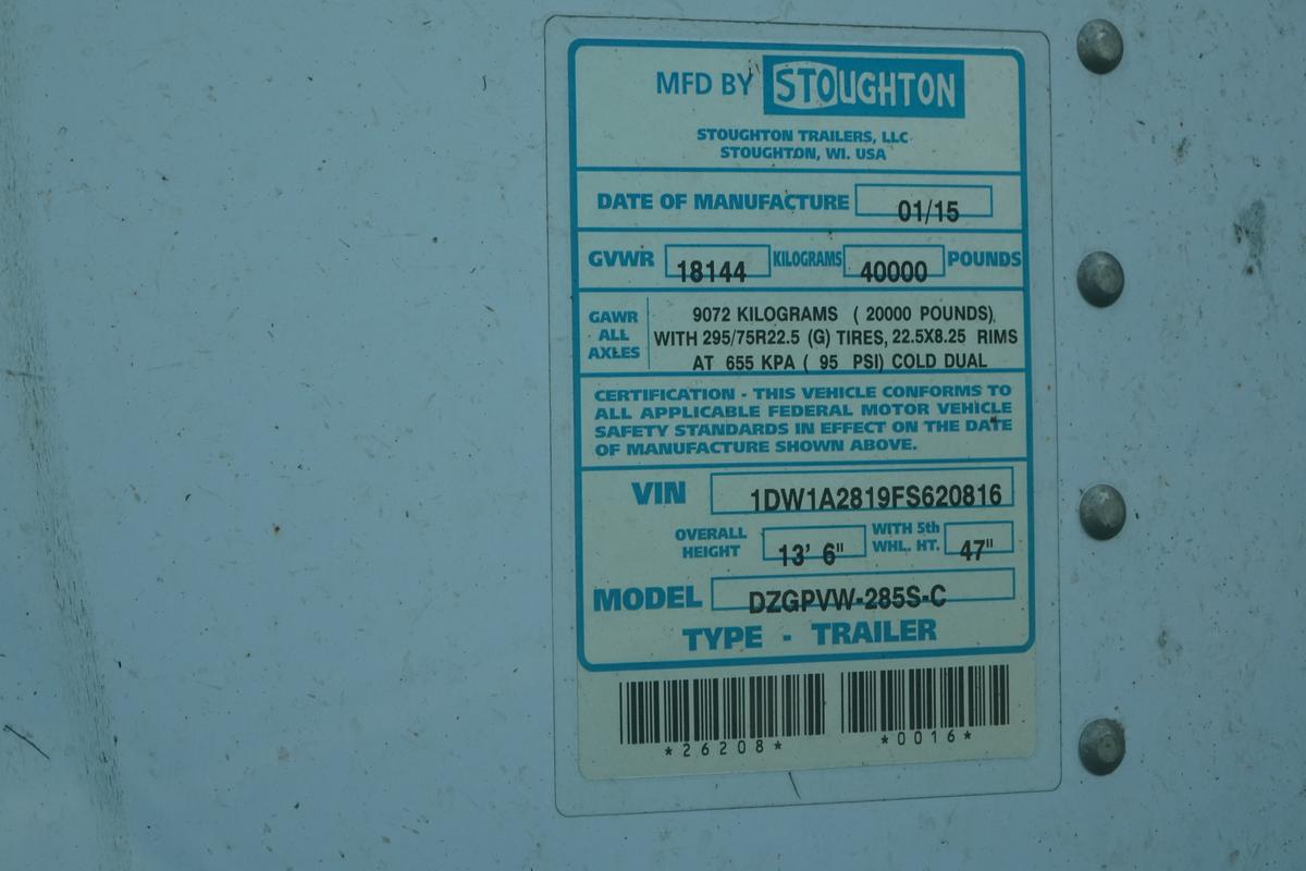 Inventory # 0513247Year: 2015 Make: Stoughton Model: DZGPVW-285S-C Axles: Fixed Single Type: Dry Box Trailer VIN: 1DW1A2819FS620816 Suspension: 2 Spring Tires: 295/75R22.5 Rims: 10 Bolt Hub Pilot - Steel Length: 28' Width: 102" Height: 13'6" Weight (Approximate): 8,260 lb GVW: 40,000 lb Floor Composition: Wood / Steel Trailer Composition: Steel / Aluminum Door Type: Roll Up (Not Working) - Steel Surround Door Opening Width: 7'9" Door Opening Height: 8'9" Added Details: Air Brakes, Can Pull Doubles, Aluminum Roof, Side Windows, Side Skirts Price: $2,500 as described 209DCXXTBJJJXXTQPLKDPABFEXRT+750+300 Terms of Sale