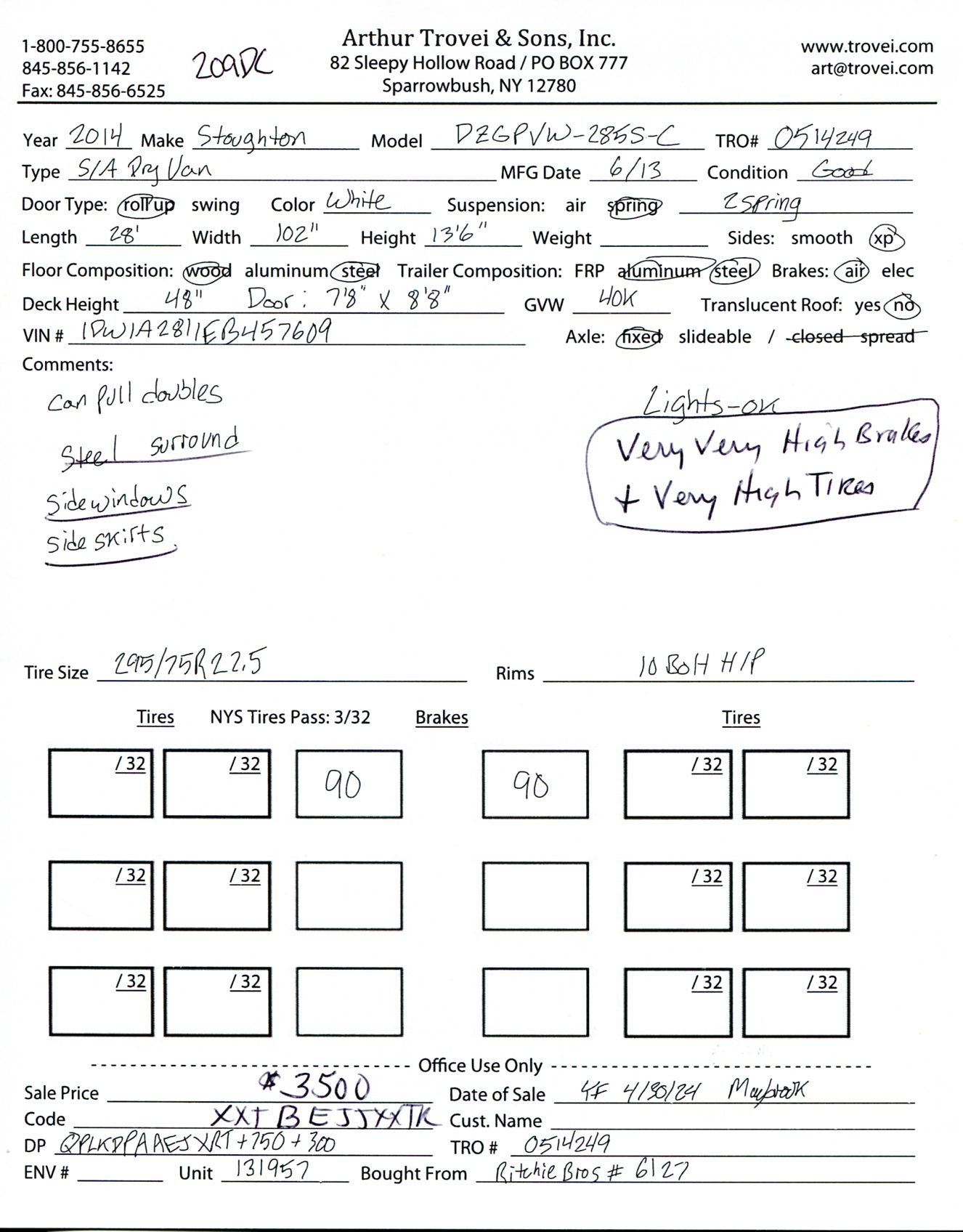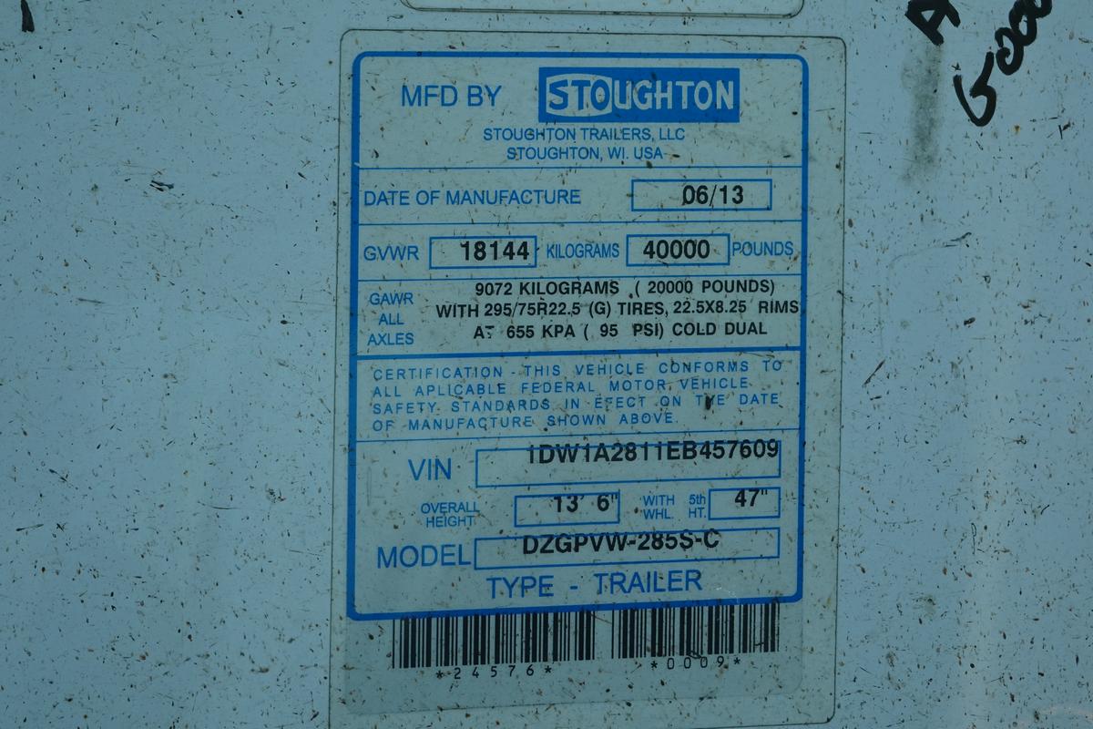Inventory # 0514249Year: 2014 Make: Stoughton Model: DZGPVW-285S-C Axles: Fixed Single Type: Dry Box Trailer VIN: 1DW1A2811EB457609 Suspension: 2 Spring Tires: 295/75R22.5 Rims: 10 Bolt Hub Pilot - Steel Length: 28' Width: 102" Height: 13'6" Weight (Approximate): 8,540 lb GVW: 40,000 lb Floor Composition: Wood / Steel Trailer Composition: Steel / Aluminum Door Type: Roll Up - Steel Surround Door Opening Width: 7'8" Door Opening Height: 8'8" Added Details: Air Brakes, Can Pull Doubles, Aluminum Roof, Side Windows, Side Skirts Price: $3,500 209DCXXTBEJJXXTQPLKDPAAEJXRT+750+300 Terms of Sale