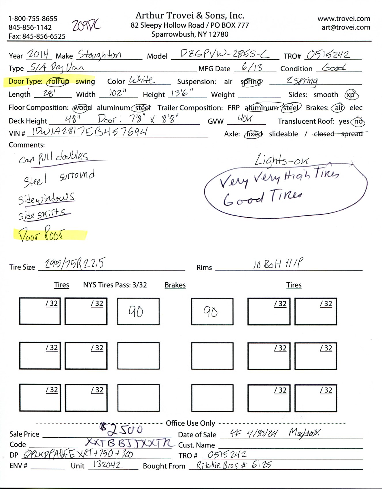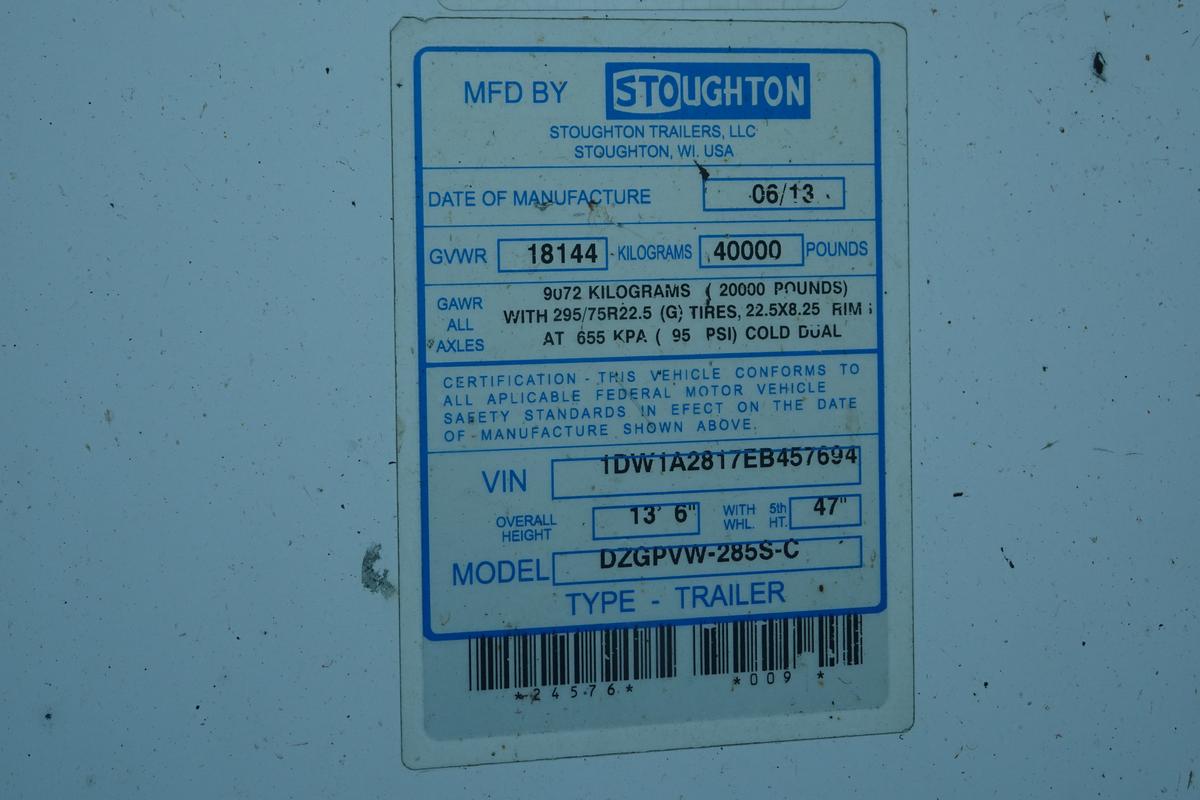 Inventory # 0515242Year: 2014 Make: Stoughton Model: DZGPVW-285S-C Axles: Fixed Single Type: Dry Box Trailer VIN: 1DW1A2811EB457609 Suspension: 2 Spring Tires: 295/75R22.5 Rims: 10 Bolt Hub Pilot - Steel Length: 28' Width: 102" Height: 13'6" Weight (Approximate): 8,540 lb GVW: 40,000 lb Floor Composition: Wood / Steel Trailer Composition: Steel / Aluminum Door Type: Roll Up (Poor) - Steel Surround Door Opening Width: 7'8" Door Opening Height: 8'8" Added Details: Air Brakes, Can Pull Doubles, Aluminum Roof, Side Windows, Side Skirts Price: $2,500 209DCXXTBBJJXXTQPLKDPABFEXRT+750+300 Terms of Sale