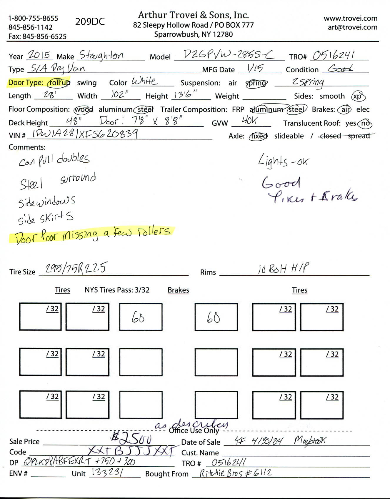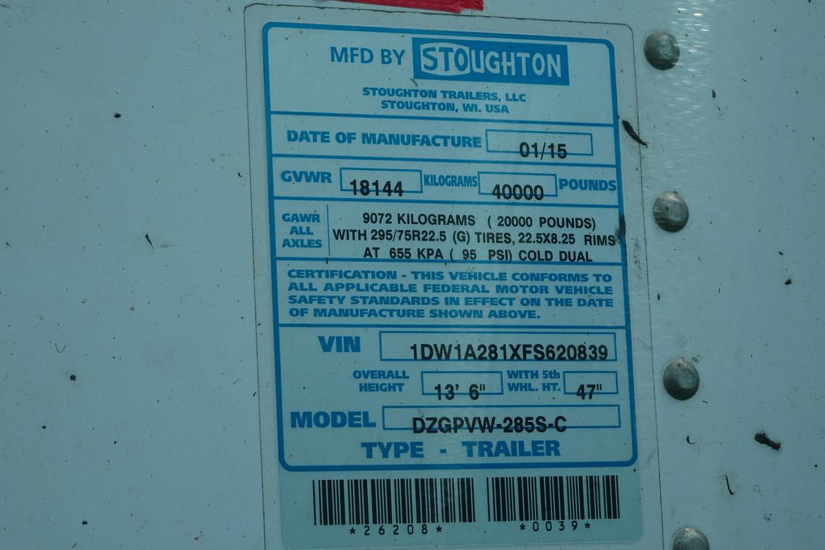 Inventory # 0516241Year: 2015 Make: Stoughton Model: DZGPVW-285S-C Axles: Fixed Single Type: Dry Box Trailer VIN: 1DW1A281XFS620839 Suspension: 2 Spring Tires: 295/75R22.5 Rims: 10 Bolt Hub Pilot - Steel Length: 28' Width: 102" Height: 13'6" Weight (Approximate): 8,260 lb GVW: 40,000 lb Floor Composition: Wood / Steel Trailer Composition: Steel / Aluminum Door Type: Roll Up (Poor - Missing A Few Rollers) - Steel Surround Door Opening Width: 7'9" Door Opening Height: 8'9" Added Details: Air Brakes, Can Pull Doubles, Aluminum Roof, Side Windows, Side Skirts Price: $2,500 as described 209DCXXTBJJJXXTQPLKDPABFEXRT+750+300 Terms of Sale