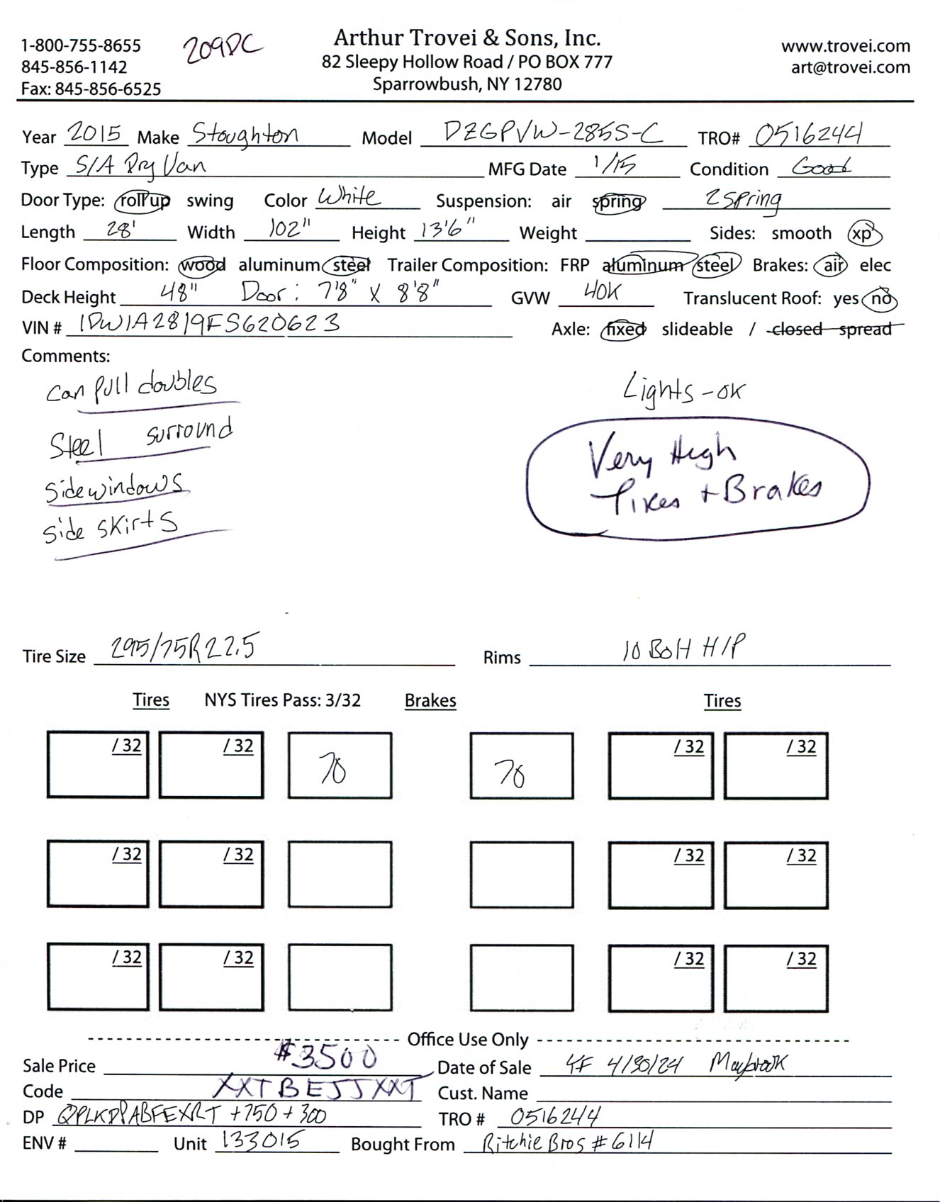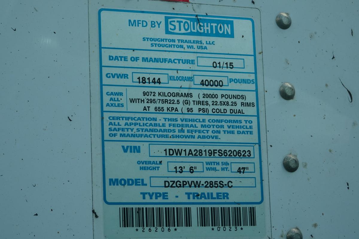 Inventory # 0516244Year: 2015 Make: Stoughton Model: DZGPVW-285S-C Axles: Fixed Single Type: Dry Box Trailer VIN: 1DW1A2819FS620623 Suspension: 2 Spring Tires: 295/75R22.5 Rims: 10 Bolt Hub Pilot - Steel Length: 28' Width: 102" Height: 13'6" Weight (Approximate): 8,260 lb GVW: 40,000 lb Floor Composition: Wood / Steel Trailer Composition: Steel / Aluminum Door Type: Roll Up - Steel Surround Door Opening Width: 7'9" Door Opening Height: 8'9" Added Details: Air Brakes, Can Pull Doubles, Aluminum Roof, Side Windows, Side Skirts Price: $3,500 209DCXXTBEJJXXTQPLKDPABFEXRT+750+300 Terms of Sale