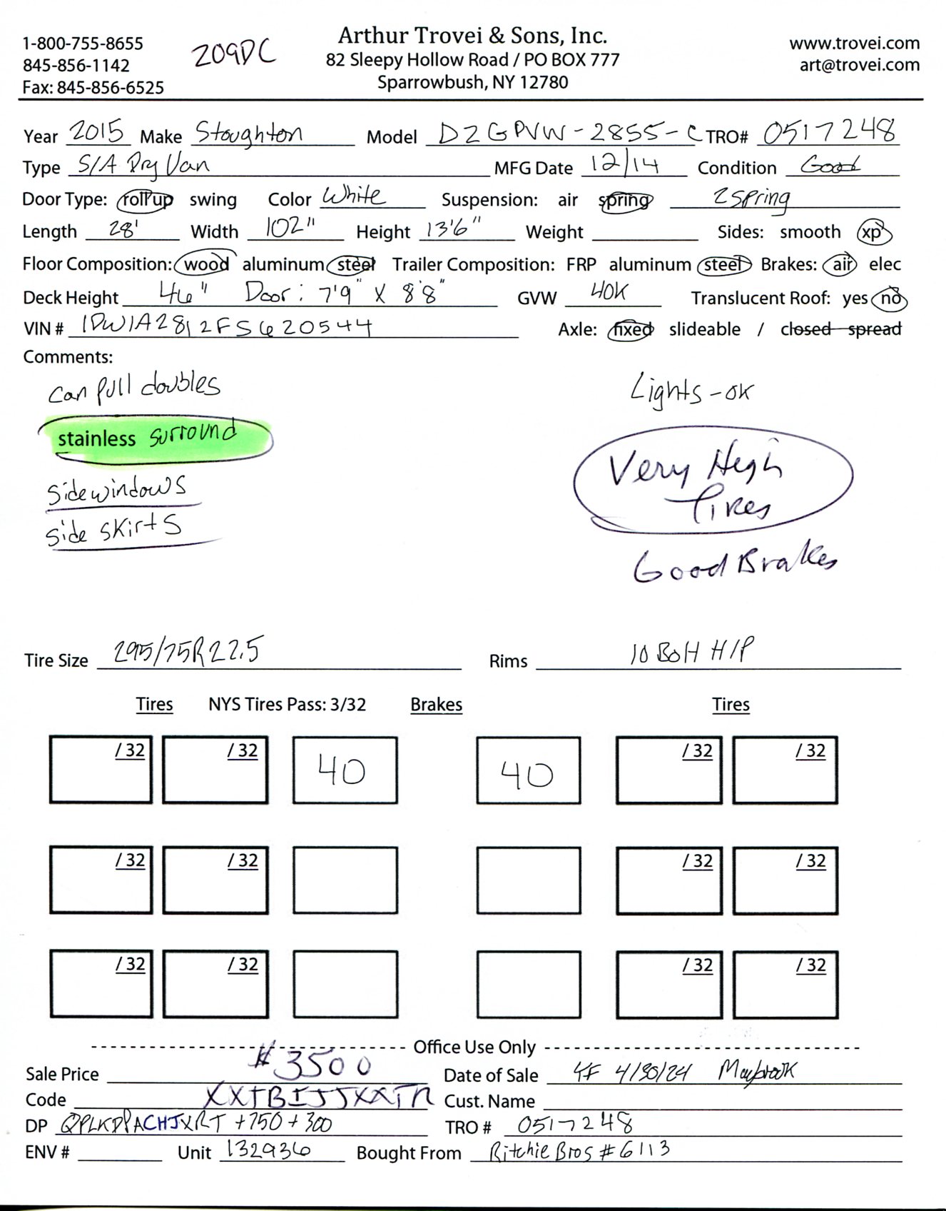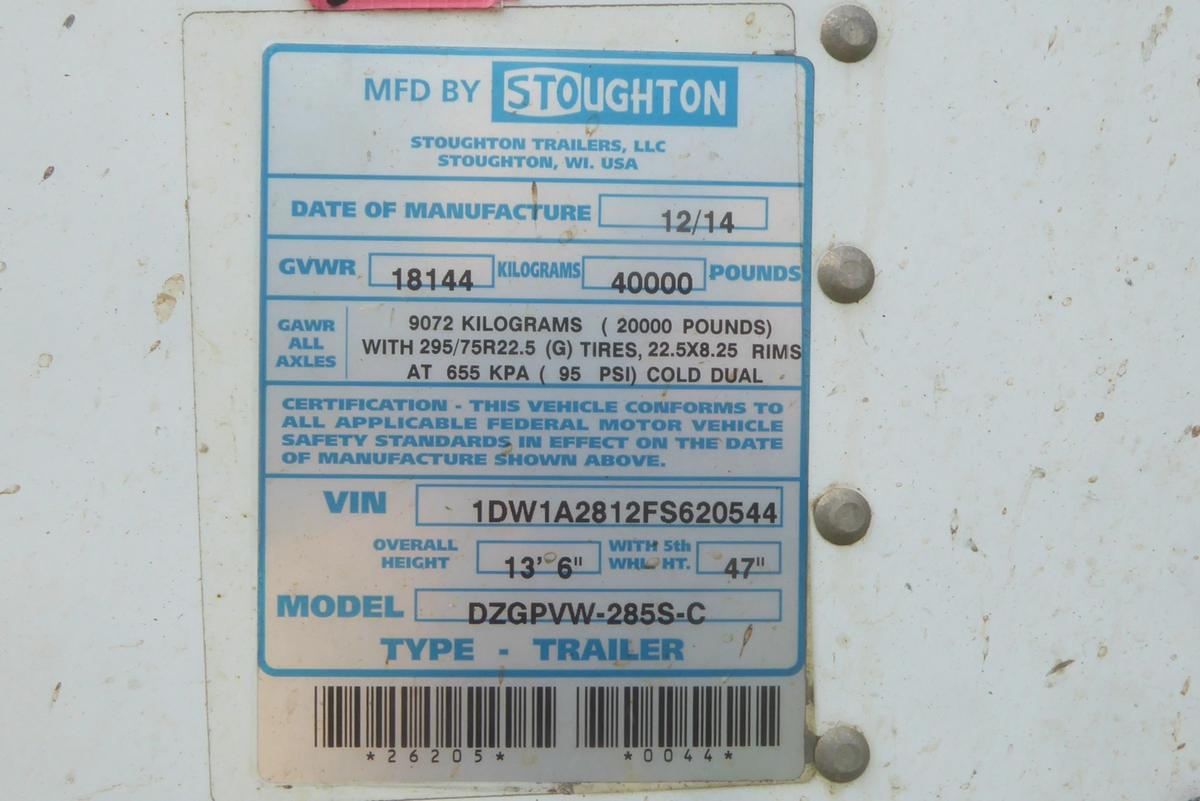 Inventory # 0517248Year: 2015 Make: Stoughton Model: DZGPVW-285S-C Axles: Fixed Single Type: Dry Box Trailer VIN: 1DW1A2812FS620544 Suspension: 2 Spring Tires: 295/75R22.5 Rims: 10 Bolt Hub Pilot - Steel Length: 28' Width: 102" Height: 13'6" Weight (Approximate): 8,260 lb GVW: 40,000 lb Floor Composition: Wood / Steel Trailer Composition: Steel / Aluminum Door Type: Roll Up - Stainless Surround Door Opening Width: 7'9" Door Opening Height: 8'9" Added Details: Air Brakes, Can Pull Doubles, Aluminum Roof, Side Windows, Side Skirts Price: $3,500 209DCXXTBIJJXXTQPLKDPACHJXRT+750+300 Terms of Sale