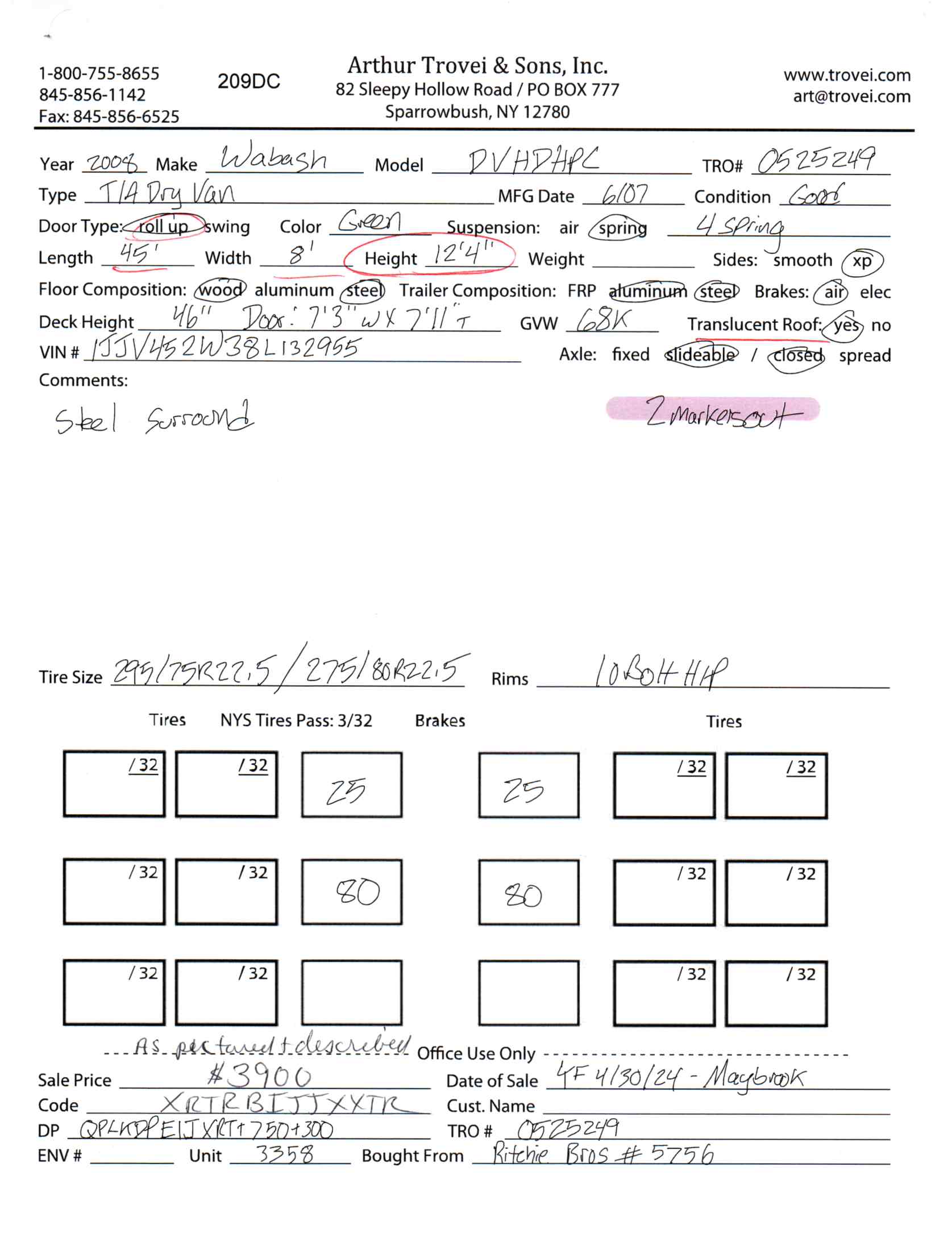 Inventory # 0525249Year: 2008 Make: Wabash Model: DVHDHPC Axles: Slideable Closed Tandem Type: Dry Box Trailer VIN: 1JJV452W38L132955 Suspension: 4 Spring Tires: 275/80R22.5 / 295/75R22.5 Rims: 10 Bolt Hub Pilot - All Steel Length: 45' Width: 8' Height: 12'4" Weight (Estimated): 13,260 lb Load Width: 7'3" Load Height: 7'11" GVWR: 68,000 lb Trailer Composition: Steel Floor Composition: Wood / Steel Door Type: Roll Up Door - Steel Surround Added Details: Air Brakes, Translucent Roof Price: $3,900 as described 209DCXXTBIJJXXTRQPLKDPEIJXRT+750+300 Terms of Sale
