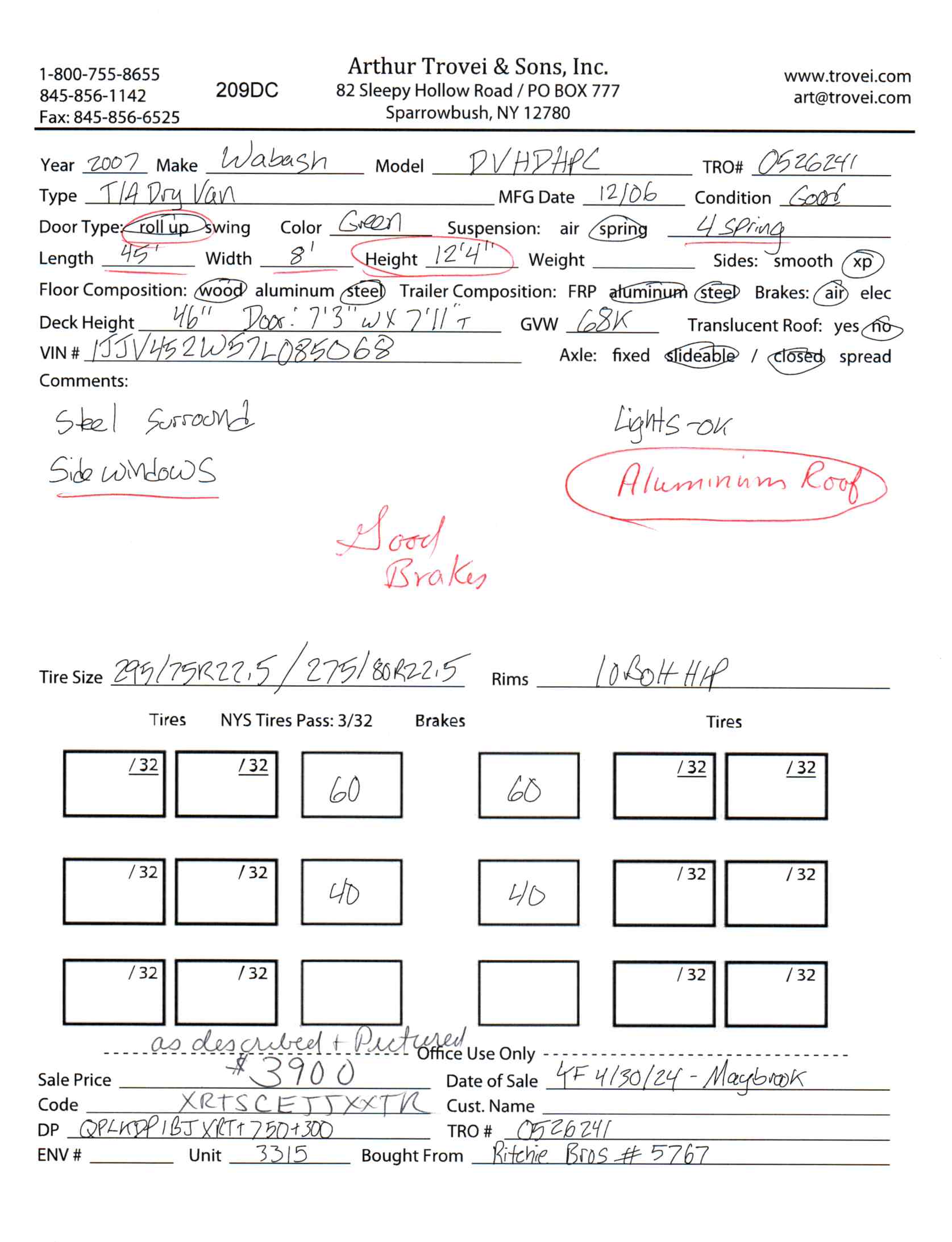 Inventory # 0526241Year: 2007 Make: Wabash Model: DVHDHPC Axles: Slideable Closed Tandem Type: Dry Box Trailer VIN: 1JJV452W57L085068 Suspension: 4 Spring Tires: 275/80R22.5 / 295/75R22.5 Rims: 10 Bolt Hub Pilot - All Steel Length: 45' Width: 8' Height: 12'4" Weight (Estimated): 13,260 lb Load Width: 7'3" Load Height: 7'11" GVWR: 68,000 lb Trailer Composition: Aluminum / Steel Floor Composition: Wood / Steel Door Type: Roll Up Door - Steel Surround Added Details: Air Brakes, Aluminum Roof Price: $3,900 as described 209DCXXTCEJJXXTRQPLKDPIBJXRT+750+300 Terms of Sale