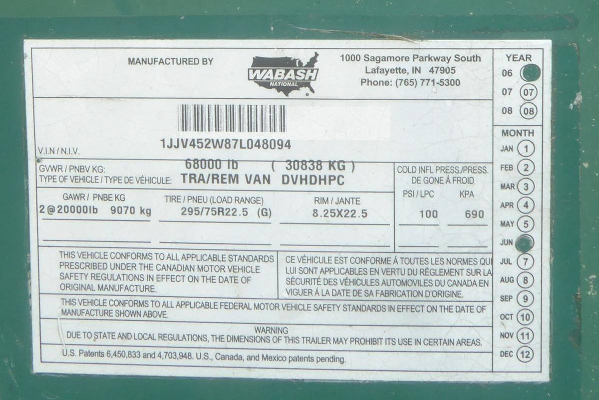 Inventory # 0526242Year: 2007 Make: Wabash Model: DVHDHPC Axles: Slideable Closed Tandem Type: Dry Box Trailer VIN: 1JJV452W87L048094 Suspension: 4 Spring Tires: 275/80R22.5 / 295/75R22.5 Rims: 10 Bolt Hub Pilot - All Steel Length: 45' Width: 8' Height: 12'4" Weight (Estimated): 13,260 lb Load Width: 7'3" Load Height: 7'9" GVWR: 68,000 lb Trailer Composition: Aluminum / Steel Floor Composition: Wood / Steel Door Type: Roll Up Door - Steel Surround Added Details: Air Brakes, Translucent Roof Price: $3,900 as described NNY 209DCXXTBIJJXXTRQPLKDPHFEXRT+750+300 Terms of Sale