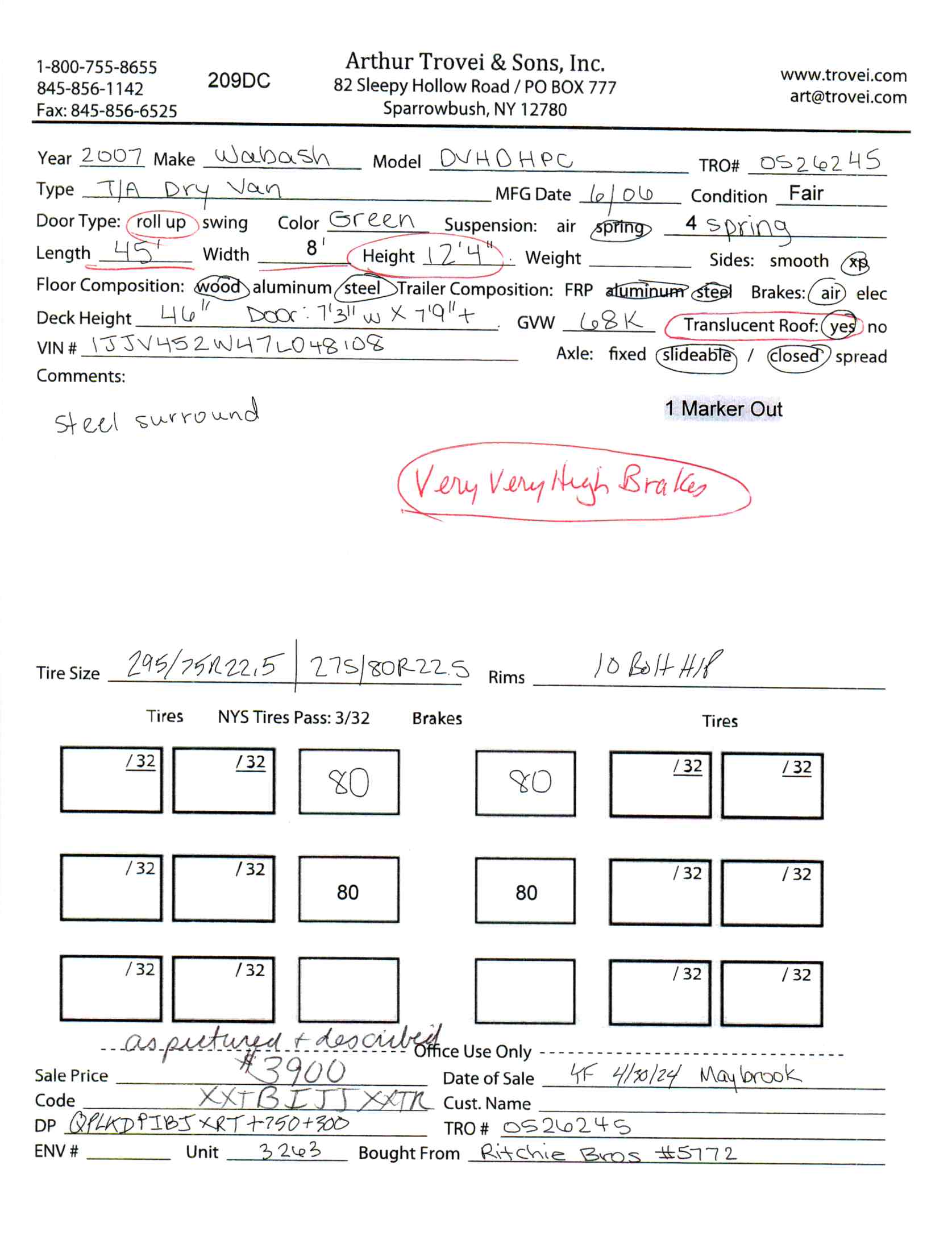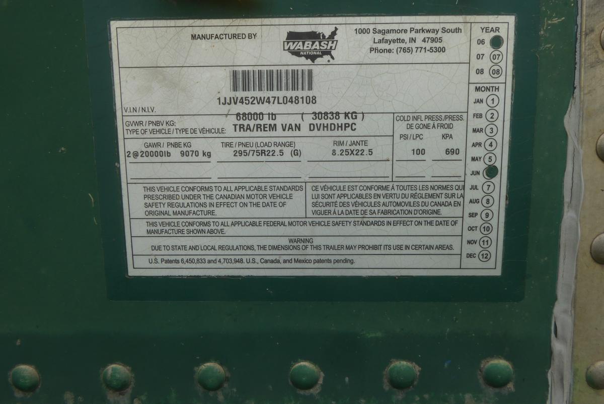 Inventory # 0526245Year: 2007 Make: Wabash Model: DVHDHPC Axles: Slideable Closed Tandem Type: Dry Box Trailer VIN: 1JJV452W47L048108 Suspension: 4 Spring Tires: 275/80R22.5 / 295/75R22.5 Rims: 10 Bolt Hub Pilot - All Steel Length: 45' Width: 8' Height: 12'4" Weight (Estimated): 13,260 lb Load Width: 7'3" Load Height: 7'9" GVWR: 68,000 lb Trailer Composition: Aluminum / Steel Floor Composition: Wood / Steel Door Type: Roll Up Door - Steel Surround Added Details: Air Brakes, Translucent Roof Price: $3,900 as described 209DCXXTBIJJXXTRQPLKDPIBJXRT+750+300 Terms of Sale