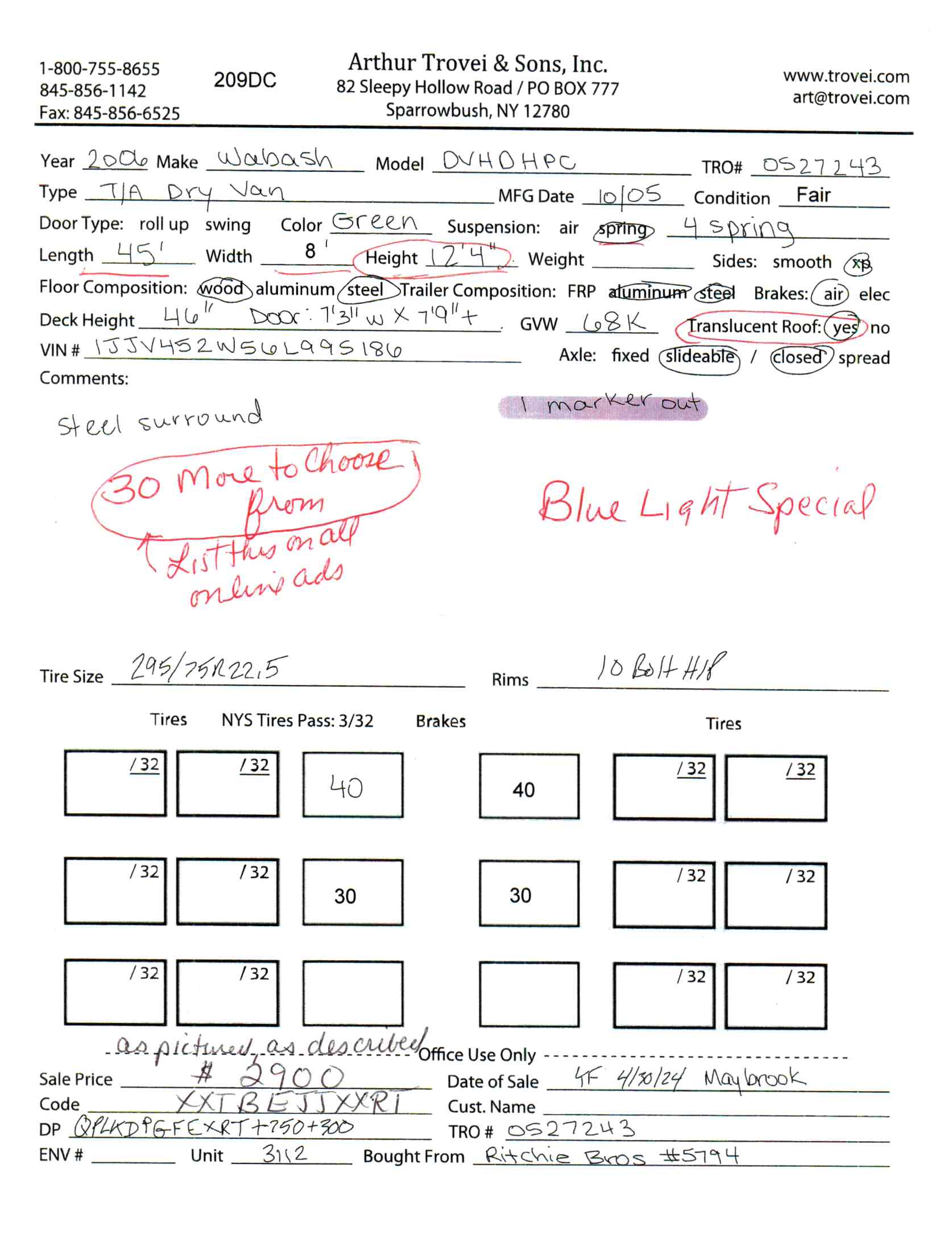 Inventory # 0527243Year: 2006 Make: Wabash Model: DVHDHPC Axles: Slideable Closed Tandem Type: Dry Box Trailer VIN: 1JJV452W56L995186 Suspension: 4 Spring Tires: 275/80R22.5 / 295/75R22.5 Rims: 10 Bolt Hub Pilot - All Steel Length: 45' Width: 8' Height: 12'4" Weight (Estimated): 13,260 lb Load Width: 7'3" Load Height: 7'9" GVWR: 68,000 lb Trailer Composition: Aluminum / Steel Floor Composition: Wood / Steel Door Type: Roll Up Door - Steel Surround Added Details: Air Brakes, Translucent Roof Price: $2,900 as described 209DCXXTBEJJXXTRQPLKDPGFEXRT+750+300 Terms of Sale