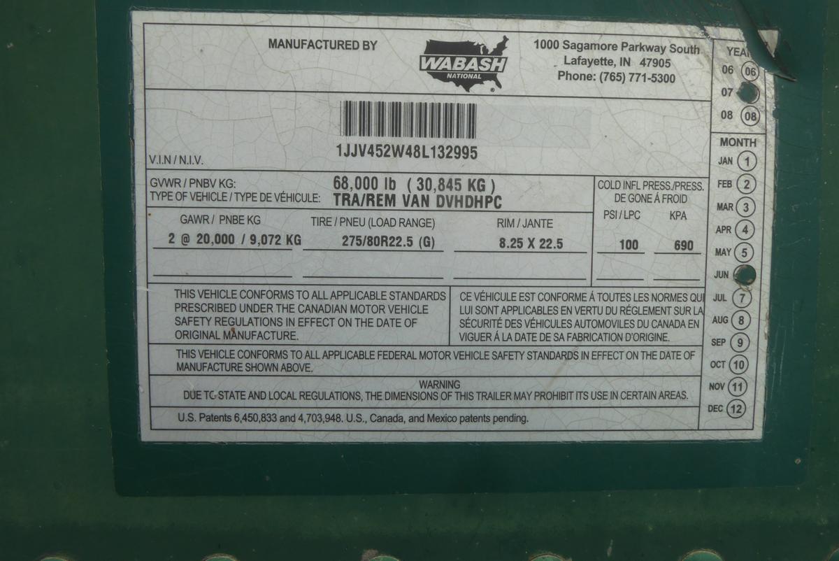 Inventory # 0529244Year: 2008 Make: Wabash Model: DVHDHPC Axles: Slideable Closed Tandem Type: Dry Box Trailer VIN: 1JJV452W48L132995 Suspension: 4 Spring Tires: 295/75R22.5 Rims: 10 Bolt Hub Pilot - All Steel Length: 45' Width: 8' Height: 12'4" Weight (Estimated): 13,260 lb Load Width: 7'3" Load Height: 7'11" GVWR: 68,000 lb Trailer Composition: Steel Floor Composition: Wood / Steel Door Type: Roll Up Door - Steel Surround Added Details: Air Brakes, Translucent Roof Price: $3,900 209DCXXTBIJJXXTRQPLKDPCGEXRT+750+300 Terms of Sale