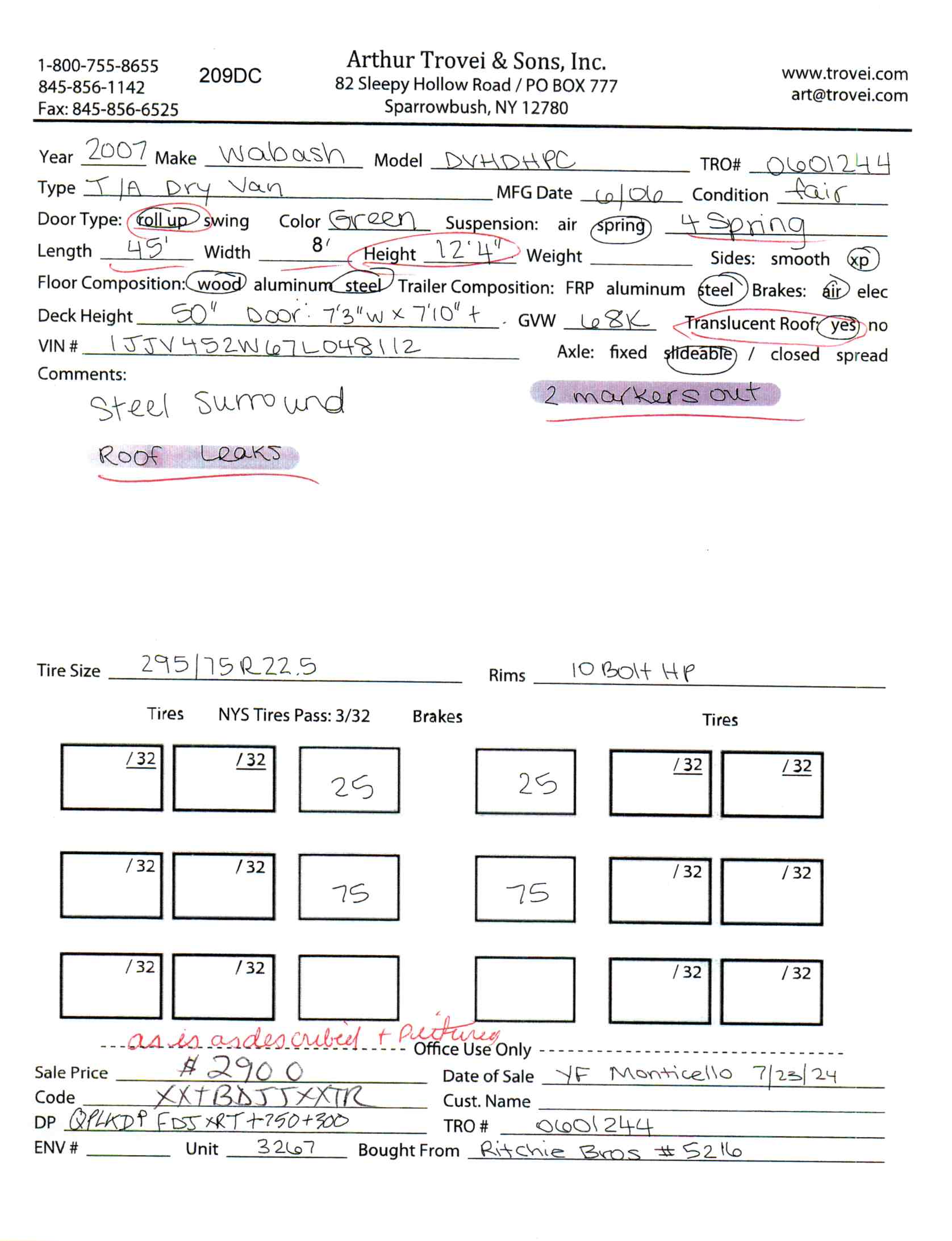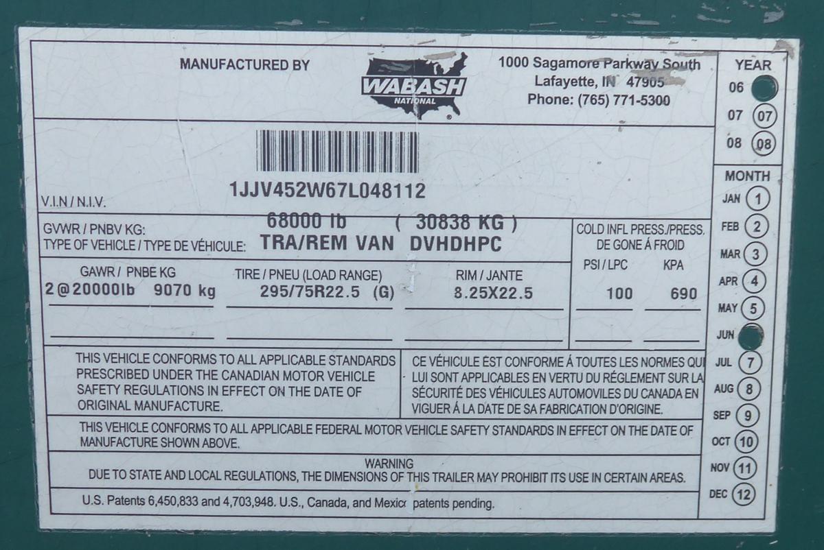 Inventory # 0601244Year: 2007 Make: Wabash Model: DVHDHPC Axles: Slideable Closed Tandem Type: Dry Box Trailer VIN: 1JJV452W67L048112 Suspension: 4 Spring Tires: 275/80R22.5 / 295/75R22.5 Rims: 10 Bolt Hub Pilot - All Steel Length: 45' Width: 8' Height: 12'4" Weight (Estimated): 13,260 lb Load Width: 7'3" Load Height: 7'9" GVWR: 68,000 lb Trailer Composition: Aluminum / Steel Floor Composition: Wood / Steel Door Type: Roll Up Door - Steel Surround Added Details: Air Brakes, Translucent Roof (Leaks) Price: $3,900 as described 209DCXXTBDJJXXTRQPLKDPFDJXRT+750+300 Terms of Sale