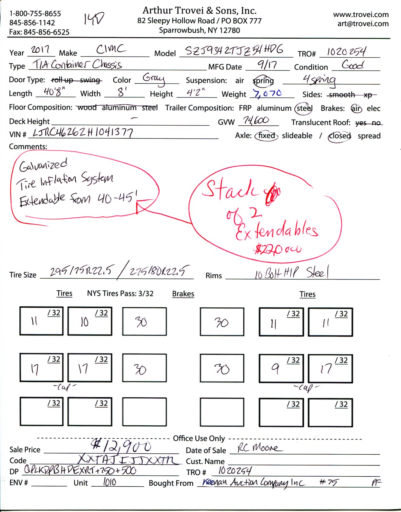 Inventory # 1020254Year: 2017 Make: CIMC Model: SZJ9342TJZ54HDG Axles: Tandem Axle Fixed Closed Type: Extendable Container Chassis VIN: LJRC46262H1041377 Suspension: 4 Spring Tires: 275/80R22.5 / 295/75R22.5 Rims: 10 Bolt Hub Pilot Length: 40'8" Width: 8' Height: 4'2" Weight: 7,070 lb Trailer Composition: Steel Added Details: Extends From 40' to 45', Tire Inflation System Price (Individual): $12,900 Price (Stack Of 2): $22,000 Price (Stack Of 4): $39,600 1YDXXTAJIJJXXTRQPLKDPBHDEXRT+750+500 Terms of Sale