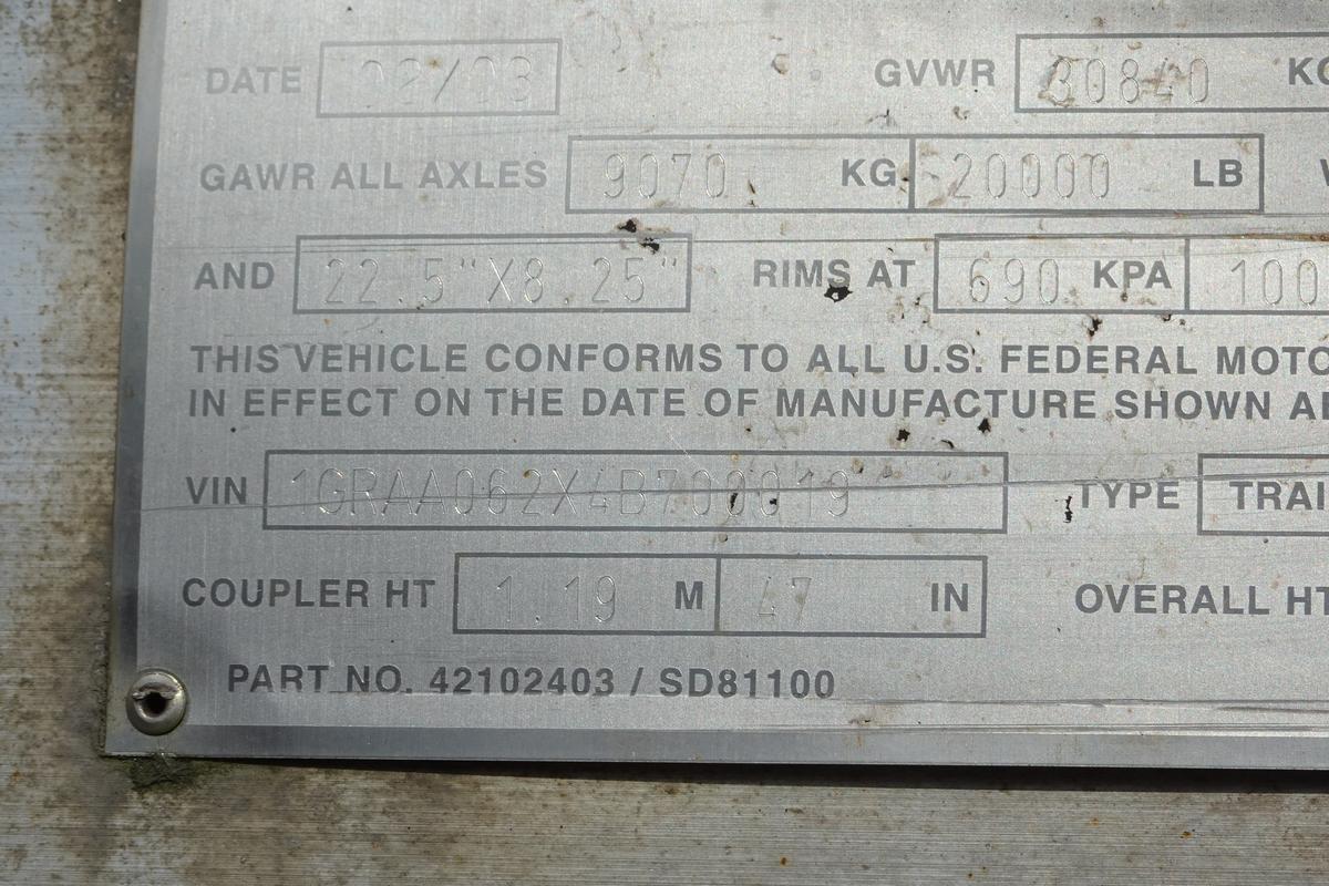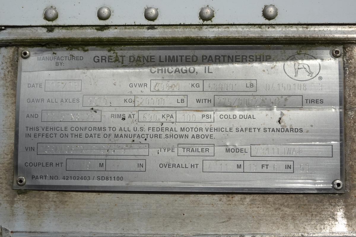 Inventory # 1204236Year: 2004 Make: Great Dane Model: 7311TJWA Axles: slideable closed tandem Type: Dry Box Trailer VIN: 1GRAA062X4B700019 Suspension: 4 air bag Tires: 22.5LP Rims: 10 bolt hub pilot - all steel Length: 53' Width: 102" Height: 13'6" Weight: 15,260 lbs Load Width: 8'2" Load Height: 9'1" GVWR: 68,000 lbs Trailer Composition: Aluminum Floor Composition: Wood/Steel Door Type: Swing doors - stainless steel surround Added Details: transparent roof, slideable tandem, air brakes Price: Call WOT 3RVQPLKDPAJJXRT+750 Terms of Sale