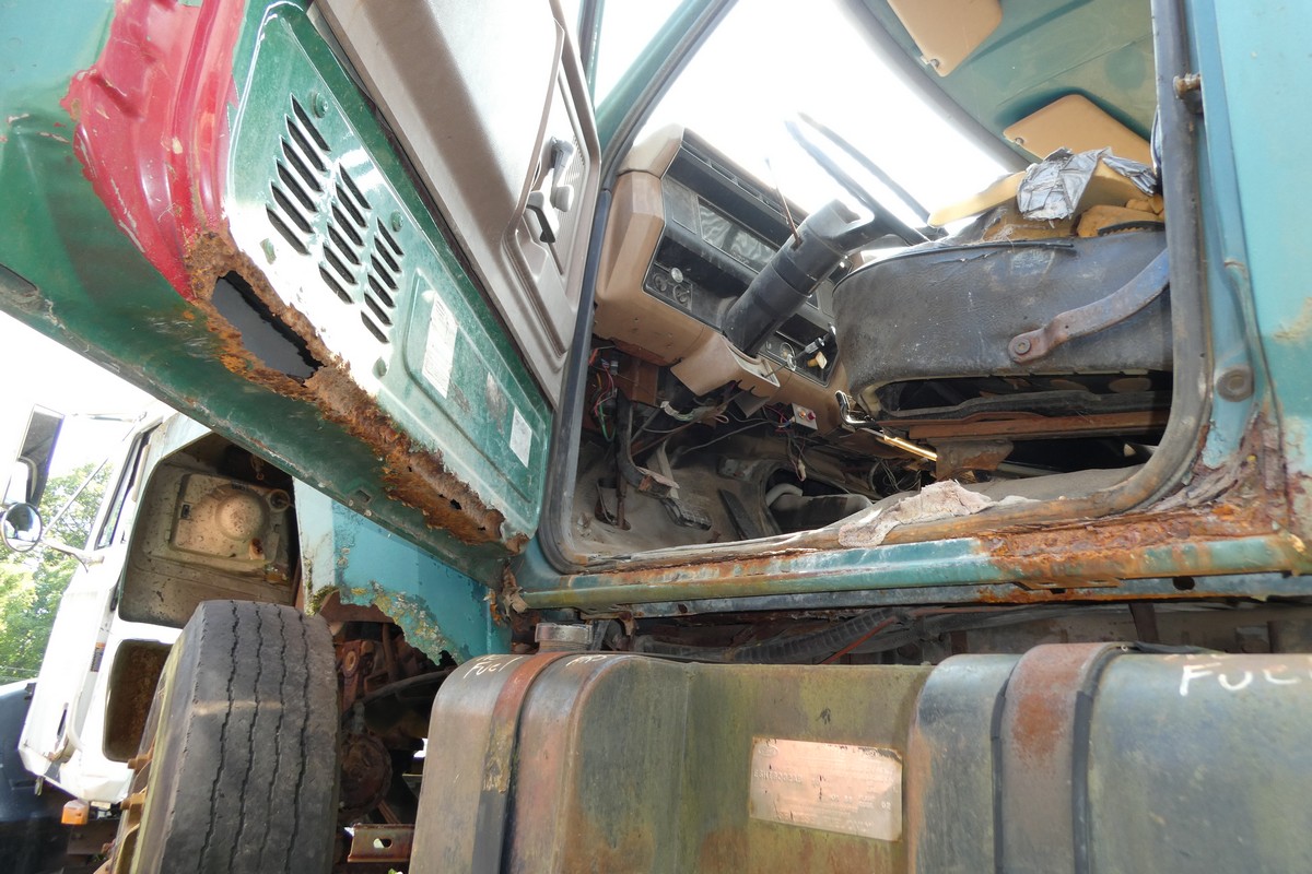 Inventory # 0430211Year: 1988 Make: Ford Model: F800 Type: Single Axle Cab Cut Motor: Ford 7.8L mech 215 hp - CORE TURNS Wetline: for dump body Air to Air: No Air Conditioning: no Engine Brake: No Transmission: Eaton FS6105A 5 speed - SOLD PTO: lever operated drivers side with lever operated hydraulic pump Rear: Rockwell RS21-230 elec 2 speed 21,000 lb - SOLD Ratio: 4.88-6.80 Power Divider: N/A Suspension: spring 21,000 lbs - SOLD Tires: 10.00R20 Rims: 20" open Length: 19'10" Width: 8' Height: 8'9" Odometer Reading: 77,291 ECM Mileage Reading: Hour Meter Reading: Computer Hour Reading: Wheelbase: 154" Cab to Axle: 85" Cab to End: 116" Weight: 15,480 lbs GVW: 31,800 lbs Dump Body: Added Details: CORE TURNS - most parts for engine in cab, NO INJECTION PUMP, single frame, air brakes - passenger door / tensioner pulley / fan & hub / transmission / rear / passenger side air tank ALL SOLD - frame SCRAPPED Price: $2,800 as is 1YDXXTBBJJXXTQRTVDPAEJJXRT+600+175 Terms of Sale