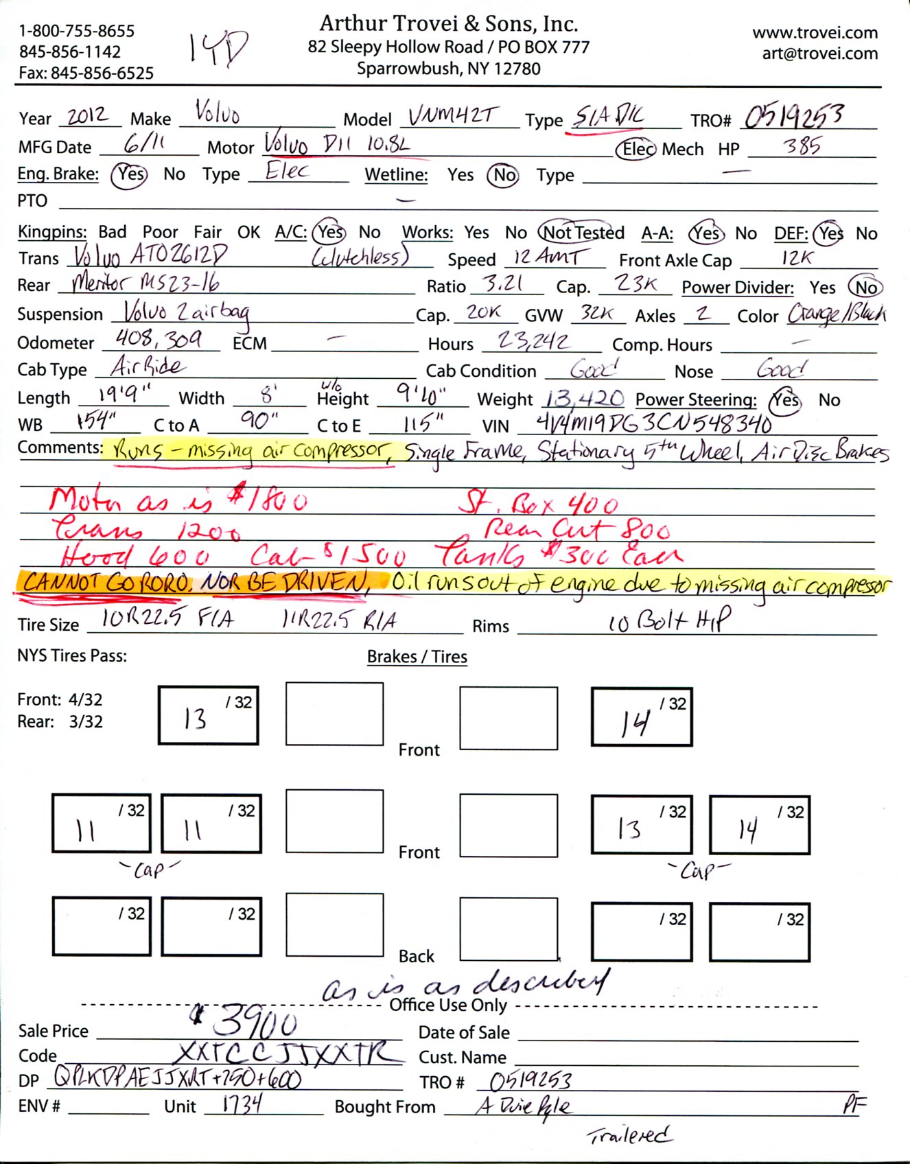 Inventory # 0519253Year: 2012 Make: Volvo Model: VNM42T Type: Single Axle Day Cab Tractor VIN: 4V4M19DG3CN548340 Motor: Volvo D11 10.8L Elec 385 HP - Missing Air Compressor (Oil Runs Out From Where It Belongs) Air to Air: Yes Air Conditioning: Yes (Not Tested) Engine Brake: Electronic DEF: Yes Transmission: Volvo ATO2612D IShift (Clutchless) 12 Speed Automated Manual PTO: No Front Axle: 12,000 lb Rear: Meritor MS23-16 23,000 lb Ratio: 3.21 Power Divider: No Suspension: Volvo 2 Air Bag 20,000 lb Tires: 10R22.5 F/A - 11R22.5 R/A Rims: 10 Bolt Hub Pilot - Steel Odometer Reading: 408,3209 ECM: Hour Meter Reading: 23,242 ECM Hour Reading: Length: 19'9" Width: 8' Height: 9'10" Wheelbase: 154" Cab to Axle: 90" Cab to End: 115" Weight: 13,420 lbs GVW: 32,000 lbs Added Features: Runs - CANNOT GO RORO NOR BE DRIVEN - Missing Air Compressor (Oil Runs Out From Where It Belongs), Single Frame, Stationary 5th Wheel, Air Disc Brakes Price: $3,900 as is as described 1YDXXTCCJJXXTRQPLKDPAEJJXRT+750+600 Terms of Sale