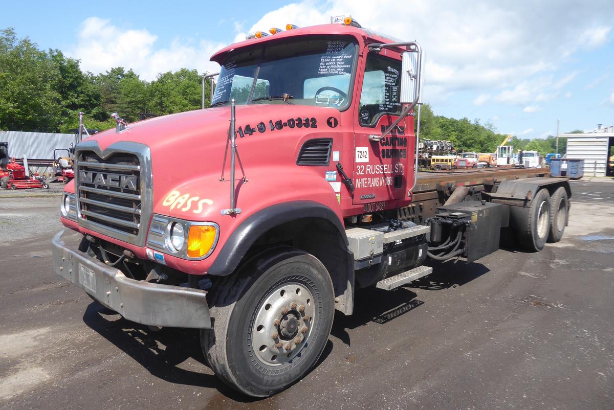 Inventory # 0619251Year: 2006 Make: Mack Model: CV713 Type: Tandem Axle Roll Off Truck VIN: 1M2AG11C96M033557 Motor: Mack AMI Elec 370 HP - Misses, Smokes, Very Low Oil Pressure Engine Brake: Elec Air to Air: Yes Air Conditioning: Yes (Not Working) Transmission: Mack T310M 10 Speed PTO: Air Operated Drivers Side With Married Hydraulic Pump Front Axle: 18,000 lb Rear: Mack 44,000 lb Ratio: 4.64 Suspension: Camelback Bronze Bushing 44,000 lb Tires: 315/80R22.5 F/A / 11R24.5 T/A Rims: 10 Bolt Hub Pilot - steel Odometer Reading: Dash Not Working ECM: Hour Meter Reading: Length: 34'4" Width: 8' Height: 9'5" Wheelbase: 265" Cab to Axle: 186" Cab to End: 232" Weight: 26,120 lbs GVW: 62,000 lbs Body Details: Rudco Roll Off Body, 75,000 lb Capacity - All Hydraulics Work Well (1 Boom Cylinder, And Winch Have Minor Seepage) - Play In Pins / Bushings Added Details: Runs - Misses, Smokes, Very Low Oil Pressure, Double Frame Price: Sold 1YDXXTAJIJJXXTQPLKDPGCJJXRT+750 Terms of Sale