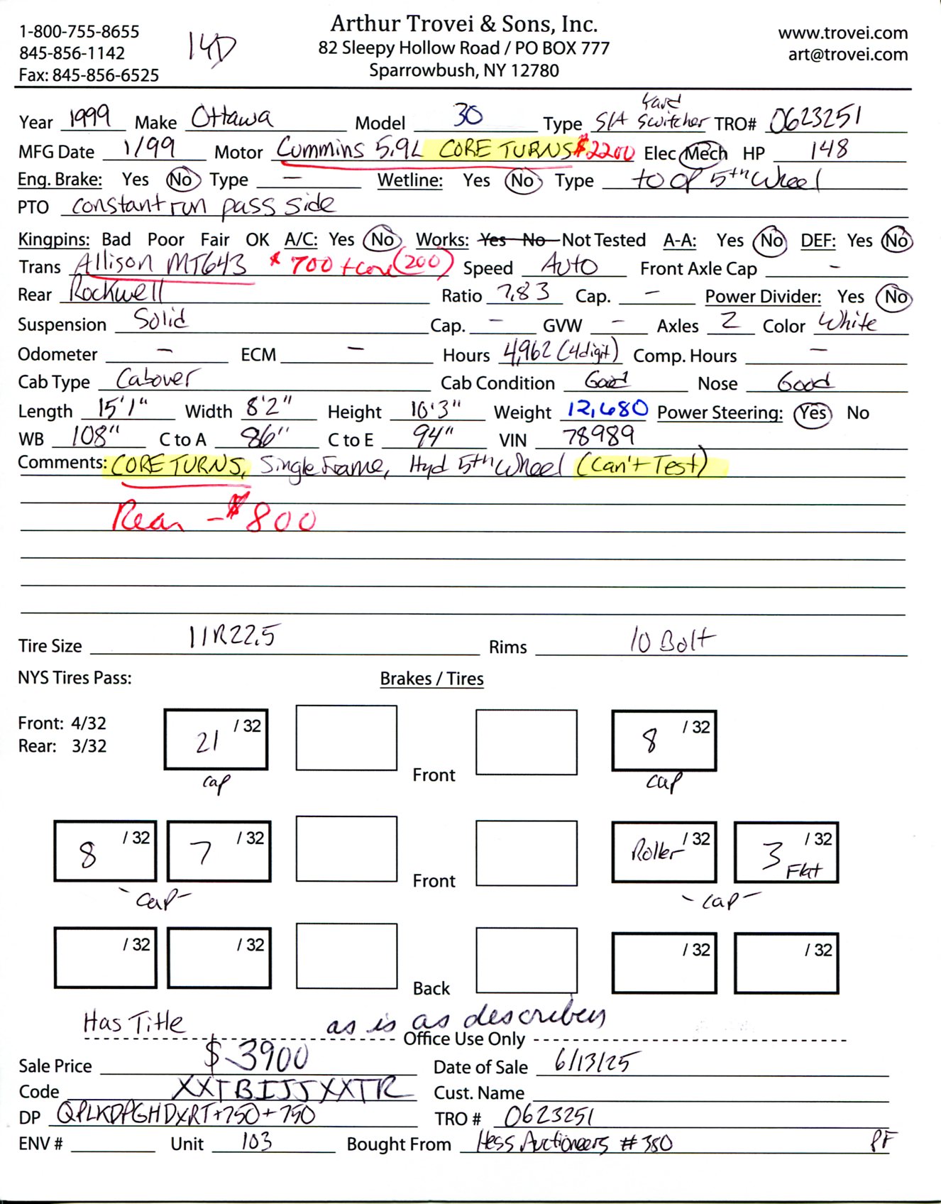 Inventory # 0623251Year: 1999 Make: Ottawa Model: 30 Type: Single Axle Yard Switcher VIN: 78989 Motor: Cummins 5.9L Mech 148 HP - CORE TURNS DOES NOT RUN Air to Air: No Air Conditioning: No Wetline: Hydraulics For 5th Wheel PTO: Constant Run Passenger Side Transmission: Allison MT643 Automatic Front Axle: No Tag Rear: Rockwell Ratio: 7.83 Suspension: Solid Tires: 11R22.5 Rims: 10 Bolt - Steel Odometer Reading: ECM: Hour Meter Reading: 4,962 (4 Digit) Length: 15'1" Width: 8'2" Height: 10'3" Wheelbase: 108" Cab to Axle: 86" Cab to End: 94" Weight: 12,680 GVW: Added Details: DOES NOT RUN - CORE TURNS, Single Frame, Hydraulic 5th Wheel (Not Tested) Price: $3,900 Has Title as is as described 1YDXXTBIJJXXTRQPLKDPGHDXRT+750+750 Print This Page | Back to Yard Switcher Inventory | Ask A Question Terms of Sale