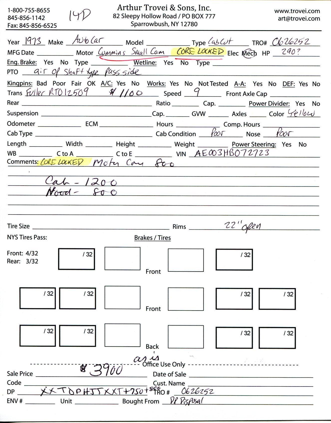 Inventory # 0626252Year: 1973 Make: Autocar Model: Type: Cab Cut VIN: AE003HB0727223 Motor: Cummins Small Cam Mech 290? HP Air to Air: No Engine Brake: No Transmission: Fuller RTO12509 9 Speed PTO: Air Operated Passenger Side - Shaft Type Front Axle: Unknown Tires: Rims: 22" Open Odometer Reading: ECM Reading: Hour Meter Reading: ECM Hour Reading: Weight: Added Details: CORE LOCKED, DOES NOT RUN, Cab and Hood Poor Price: $3,900 as is as described 1YDXXTDPHJJXXT+750+800 Print This Page | Back to Cab Chassis Truck Inventory | Ask A Question Terms of Sale