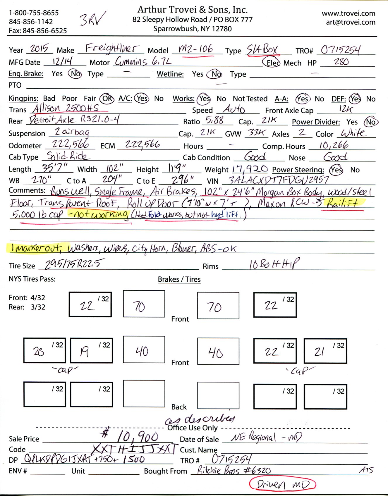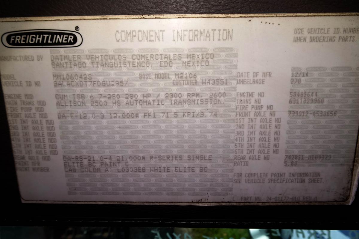Inventory # 0715254Year: 2015 Make: Freightliner Model: M2-106 Type: Single Axle Box Truck VIN: 3ALACXDT7FDGU2957 Motor: Cummins 6.7L Elec 280 HP Engine Brake: No DEF: Yes Air to Air: Yes Air Conditioning: Yes (Works) Transmission: Allison 2500HS Automatic PTO: No Front Axle: 12,000 lb Rear: Detroit RS21.0-4 21,000 lb Ratio: 5.88 Suspension: 2 air bag 21,000 lbs Tires: 295/75R22.5 Rims: 10 Bolt Hub Pilot Odometer Reading: 222,566 ECM: 222,566 Hour Meter Reading: Computer Hour Reading: 10,266 Length: 35'7" Width: 102" Height: 11'9" Wheelbase: 270" Cab to Axle: 204" Cab to End: 296" Weight: 17,920 lbs GVW: 33,000 lbs Box Details: 102" Wide x 24'6" Long Morgan Box Body, Roll Up Door (7'10" W x 7' T, Steel Surround), Wood / Steel Floor, Translucent Roof Tailgate Details: Maxon RCW-5 Hydraulic Railift - 5,000 lb Capacity - Steel Frame / Deck - Not Fully Working (Fold Works, Lift Not Working) Added Details: Runs Well, Single Frame, Air Brakes Price: $10,900 as described 3RVXXTHIJJXXTQPLKDPDGIJXRT+750+1500 Terms of Sale