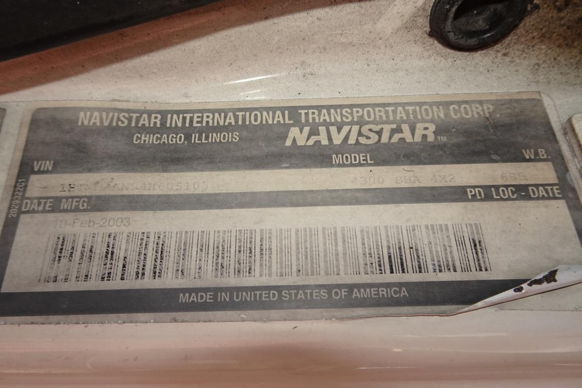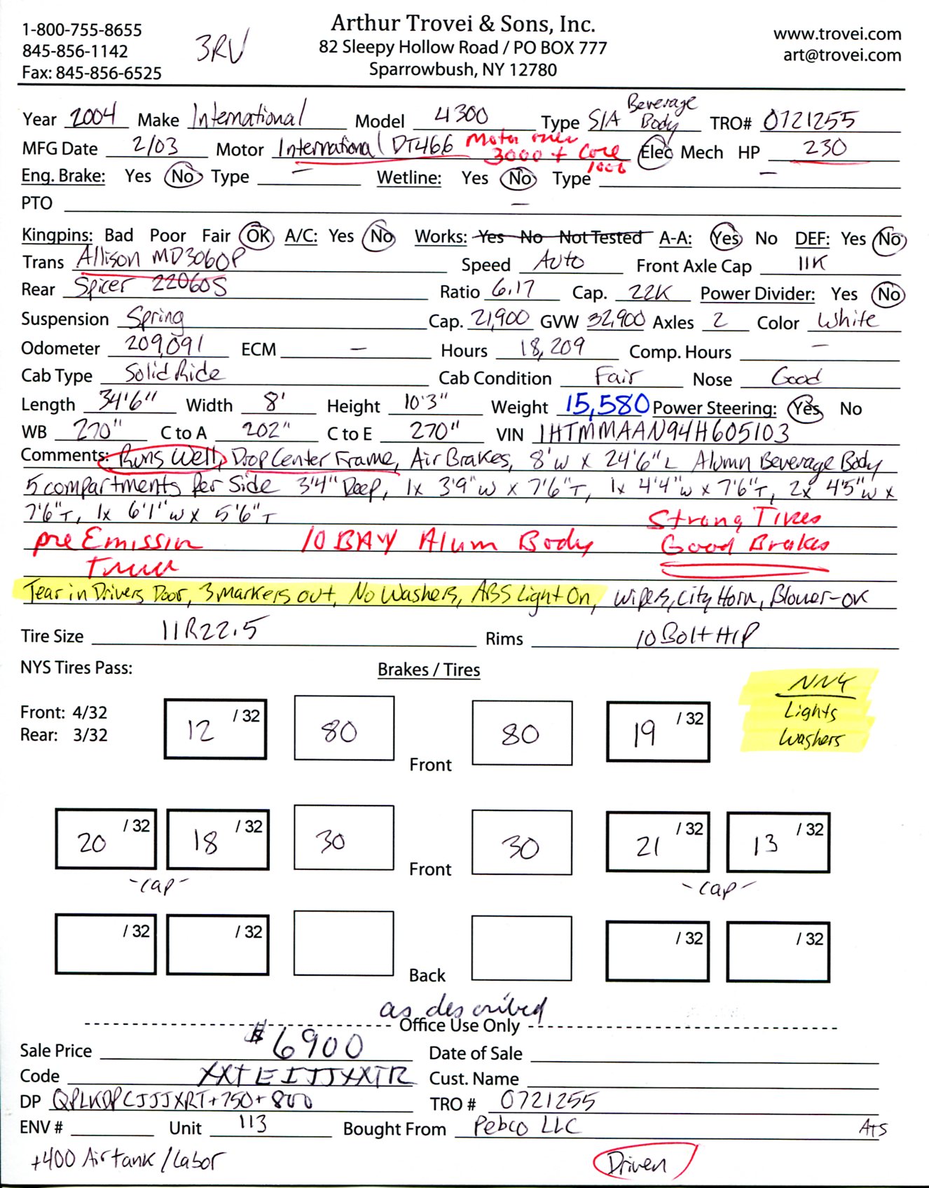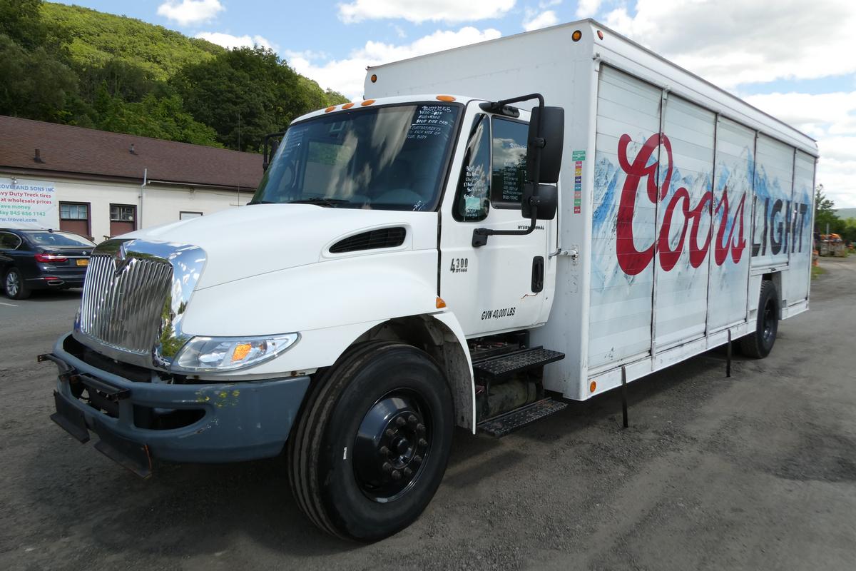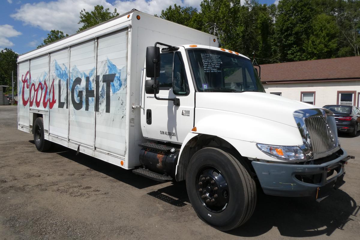 Inventory # 0721255Year: 2004 Make: International Model: 4300 Type: Single Axle Beverage Truck VIN: 1HTMMAAN94H605103 Motor: International DT466 Elec 230 HP Engine Brake: No Air to Air: Yes Air Conditioning: No Transmission: Allison MD3060P Automatic PTO: No Front Axle: 11,000 lb Rear: Spicer 22060S 22,000 lb Ratio: 6.17 Suspension: Spring 21,900 lbs Tires: 11R22.5 Rims: 10 Bolt Hub Pilot Odometer Reading: 209,091 ECM: Hour Meter Reading: 18,209 Comp Hour Reading: Length: 34'6" Width: 8' Height: 10'3" Wheelbase: 270" Cab to Axle: 202" Cab to End: 270" Weight: 18,209 lb GVW: 32,900 lb Box Details: 8' Wide x 24'6" Long Aluminum Body - 10 Bays (5 Per Side), Non-Insulated, Bays are: 1x 3'9" W x 7'6" T x 3'4" D | 1x 4'4" W x 7'6" T x 3'4" D | 2x 4'5" W x 7'6" T x 3'4" D | 1x 6'1" W x 5'6" T x 3'4" D Added Details: Runs Well, Drop Center Frame, Air Brakes Price: $6,900 as described NNY 3RVXXTEIJJXXTRQPLKDPCJJJXRT+750+800+400 Terms of Sale