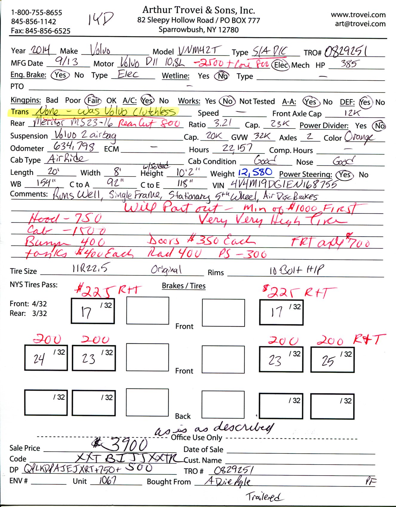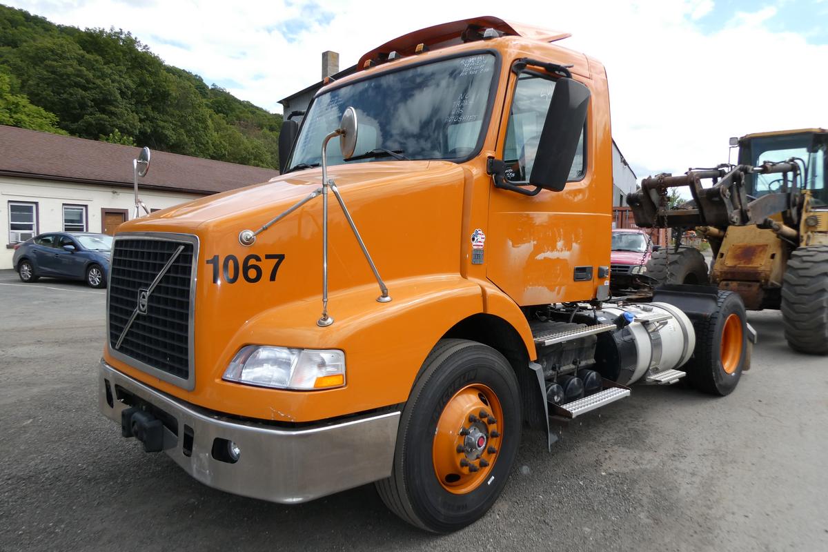 Inventory # 0829251Year: 2014 Make: Volvo Model: VNM42T Type: Single Axle Day Cab Tractor VIN: 4V4M19DG1EN168755 Motor: Volvo D11 10.8L Elec 385 HP Air to Air: Yes Air Conditioning: Yes (Not Working) Engine Brake: Electronic DEF: Yes Transmission: NONE - Was Volvo ATO2612D IShift 12 Speed Automated Manual (Clutchless) PTO: No Front Axle: 12,000 lb Rear: Meritor MS23-16 23,000 lb Ratio: 3.21 Power Divider: Yes Suspension: Volvo 2 Air Bag 20,000 lb Tires: 11R22.5 Rims: 10 Bolt Hub Pilot - Steel Odometer Reading: 634,798 ECM: Hour Meter Reading: 22,157 ECM Hour Reading: Length: 20' Width: 8' Height w/ fairing folded: 10'2" Wheelbase: 154" Cab to Axle: 92" Cab to End: 118" Weight: 12,580 lb GVW: 32,000 lb Added Features: Runs Well - No Transmission, Single Frame, Stationary 5th Wheel, Air Disc Brakes Price: $3,900 as is as described 1YDXXTBIJJXXTRQPLKDPAJEJXRT+750+500 Terms of Sale
