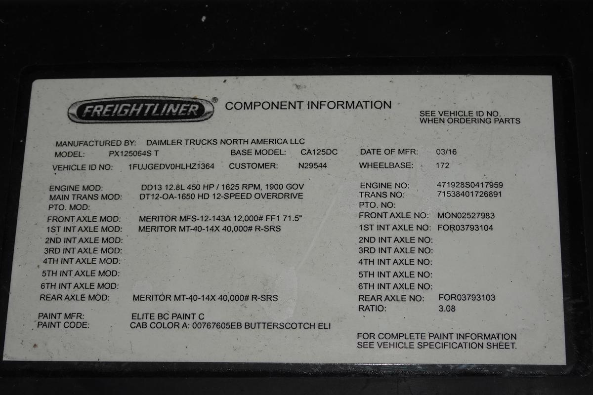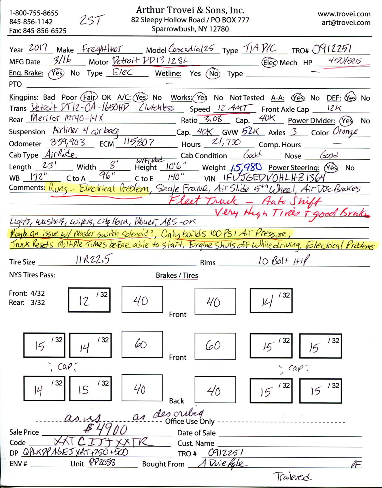 Inventory # 0912251Year: 2017 Make: Freightliner Model: Cascadia 125 Type: Tandem Axle Day Cab Tractor VIN: 1FUJGEDV0HLHZ1364 Motor: Detroit DD13 12.8L Elec 450/525 HP - Electrical Issues, Shuts Off While Driving, Only Builds 100 PSI Air Pressure Air to Air: Yes Air Conditioning: Yes (Work) Engine Brake: Electronic DEF: Yes Transmission: Detroit DT12-OA-1650HD 12 Speed Automated Manual (Clutchless) PTO: No Front Axle: 12,000 lb Rear: Meritor MT40-14X 40,000 lb Ratio: 3.08 Power Divider: Yes Suspension: Airliner 4 Air Bag 40,000 lb Tires: 11R22.5 Rims: 10 Bolt Hub Pilot - Steel Odometer Reading: 839,903 ECM: 115,807 Hour Meter Reading: 21,730 ECM Hour Reading: Length: 23' Width: 8' Height w/ Fairing Down: 10'6" Wheelbase: 172" Cab to Axle: 96" Cab to End: 140" Weight: 15,980 lb GVW: 52,000 lb Added Features: Runs Well - Electrical Issues, Shuts Off While Driving, Only Builds 100 PSI Air Pressure, Single Frame, Air Slide 5th Wheel, Air Disc Brakes Price: $4,900 as is as described 2STXXTCIJJXXTRQPLKDPAGEJXRT+750+500 Terms of Sale