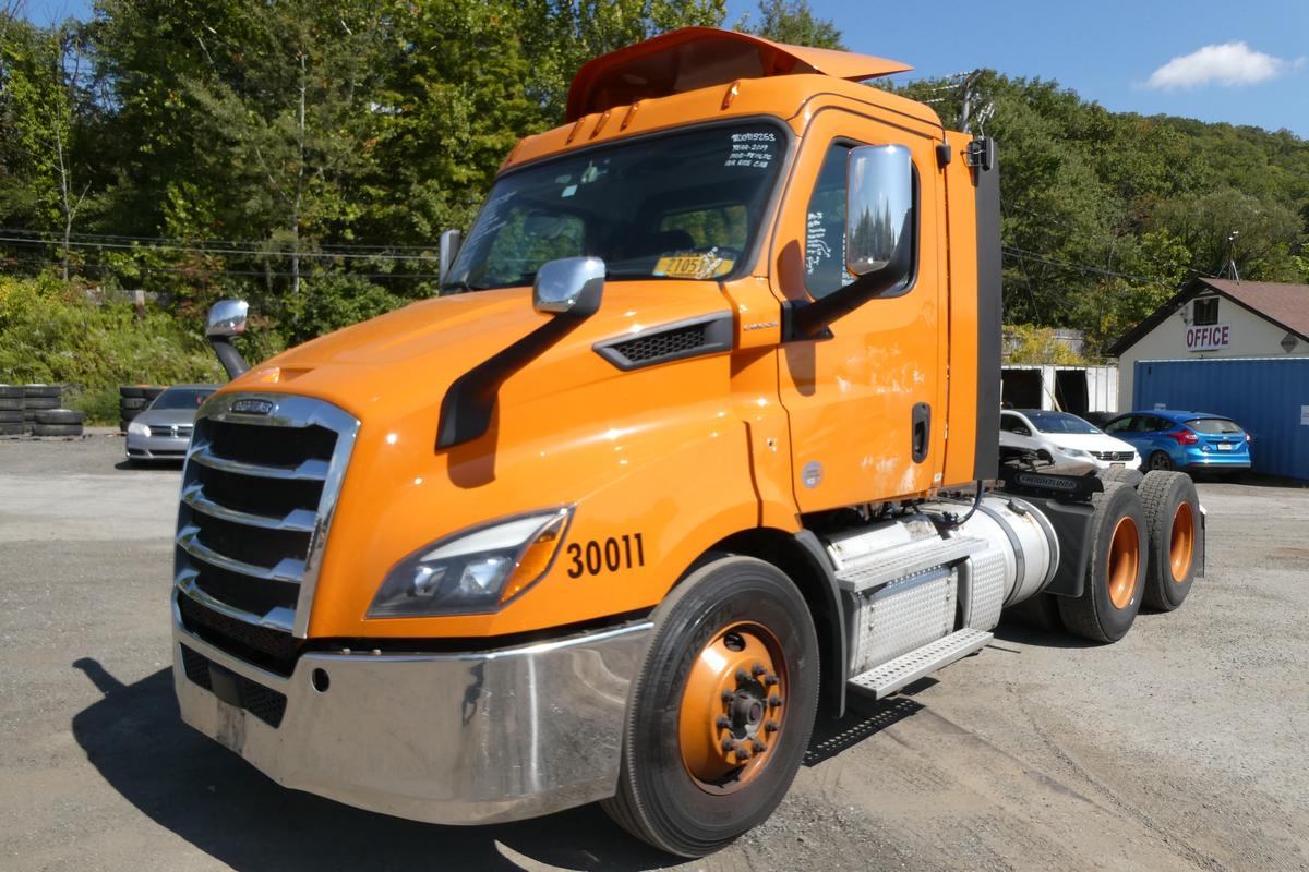 Inventory # 0915253Year: 2019 Make: Freightliner Model: Cascadia PE116 Type: Tandem Axle Day Cab Tractor VIN: 3AKJHTDV6KSKC4159 Motor: Detroit DD13 12.8L elec 410/525 hp Air to Air: Yes Air Conditioning: Yes (Works) Engine Brake: Electronic DEF: Yes Transmission: Detroit DT12-1650-DH1 HD 12 Speed Automated Manual (Clutchless) PTO: No Front Axle: 12,000 lb Rear: Meritor MT40-14X 40,000 lb Ratio: 2.47 Power Divider: Yes Suspension: Airliner 4 air bag 40,000 lb Tires: 11R22.5 Rims: 10 bolt hub pilot - steel Odometer Reading: 757,641 ECM: Hour Meter Reading: 21,195 ECM Hour Reading: Length: 24'7" Width: 8' Height w/ Fairing Folded: 10'6" Wheelbase: 176" Cab to Axle: 112" Cab to End: 154" Weight: 16,240 lbs GVW: 52,000 lbs Added Features: Runs Well - Engine Light On, Single Frame, Air Slide 5th wheel, Air Disc Brakes Price: Sold 3RVXXTRGIJJXXTRQPLKDPCBEJXRT+750+500 Terms of Sale