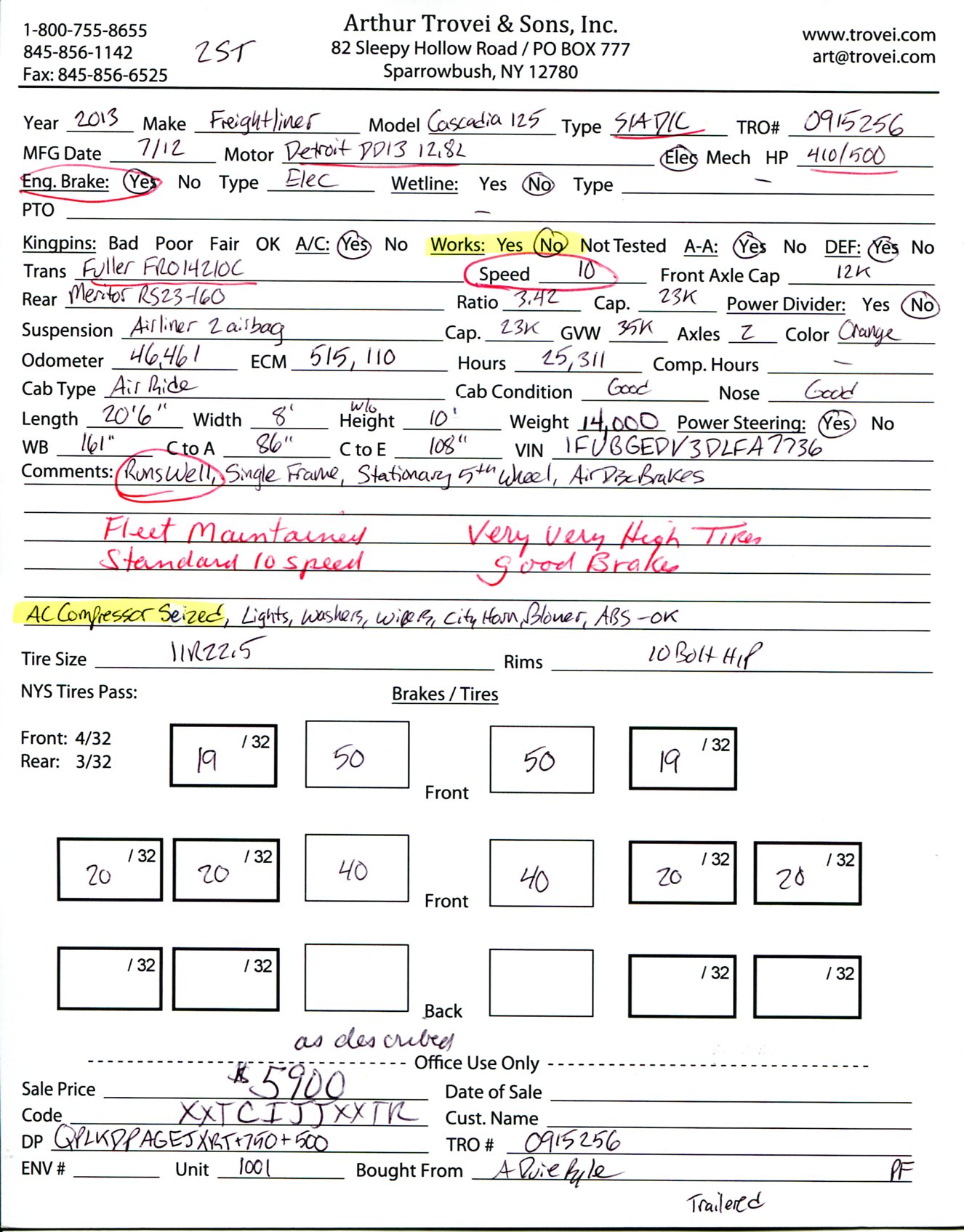 Inventory # 0915256Year: 2013 Make: Freightliner Model: Cascadia 125 Type: Single Axle Day Cab Tractor VIN: 1FUBGEDV3DLFA7736 Motor: Detroit DD13 12.8L Elec 410/500 HP Air to Air: Yes Air Conditioning: Yes (Not Working) - Compressor Seized Engine Brake: Electronic DEF: Yes Transmission: Fuller FRO14210C 10 Speed PTO: No Front Axle: 12,000 lb Rear: Meritor RS23-160 23,000 lb Ratio: 3.42 Power Divider: No Suspension: Airliner 2 Air Bag 23,000 lb Tires: 11R22.5 Rims: 10 Bolt Hub Pilot - Steel Odometer Reading: 46,461 ECM: 515,110 Hour Meter Reading: 25,311 ECM Hour Reading: Length: 20'6" Width: 8' Height: 10' Wheelbase: 161" Cab to Axle: 86" Cab to End: 108" Weight: 14,000 lb GVW: 35,000 lb Added Features: Runs Well, Single Frame, Stationary 5th Wheel, Air Disc Brakes Price: $5,900 as described 2STXXTCIJJXXTRQPLKDPAGEJXRT+750+500 Terms of Sale