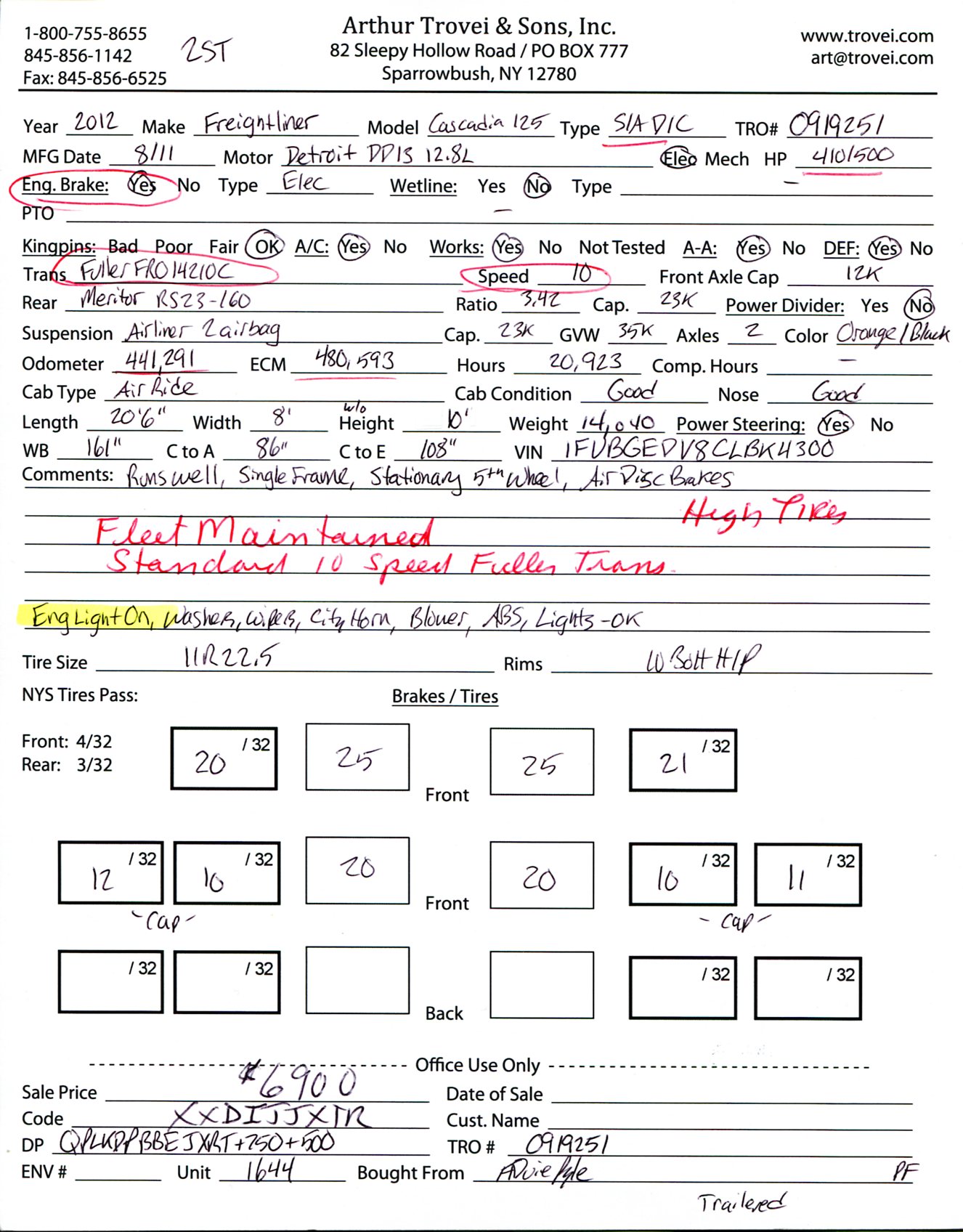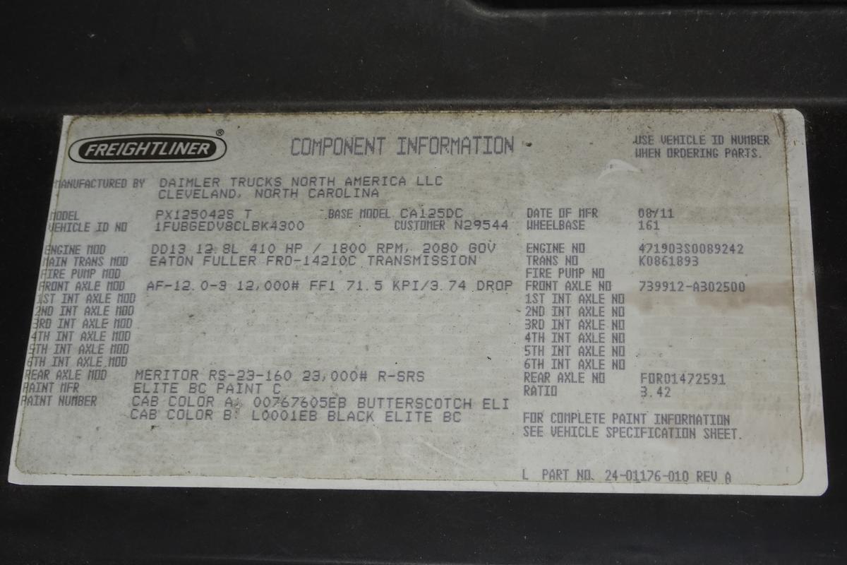 Inventory # 0919251Year: 2012 Make: Freightliner Model: Cascadia 125 Type: Single Axle Day Cab Tractor VIN: 1FUBGEDV8CLBK4300 Motor: Detroit DD13 12.8L Elec 410/500 HP Air to Air: Yes Air Conditioning: Yes (Works) Engine Brake: Electronic DEF: Yes Transmission: Fuller FRO14210C 10 Speed PTO: No Front Axle: 12,000 lb Rear: Meritor RS23-160 23,000 lb Ratio: 3.42 Power Divider: No Suspension: Airliner 2 Air Bag 23,000 lb Tires: 11R22.5 Rims: 10 Bolt Hub Pilot - Steel Odometer Reading: 441,291 ECM: 480,593 Hour Meter Reading: 20,923 ECM Hour Reading: Length: 20'6" Width: 8' Height: 10' Wheelbase: 161" Cab to Axle: 86" Cab to End: 108" Weight: 14,040 lb GVW: 35,000 lb Added Features: Runs Well - Engine Light On, Single Frame, Stationary 5th Wheel, Air Disc Brakes Price: $6,900 2STXXTDIJJXTRQPLKDPBBEJXRT+750+500 Terms of Sale