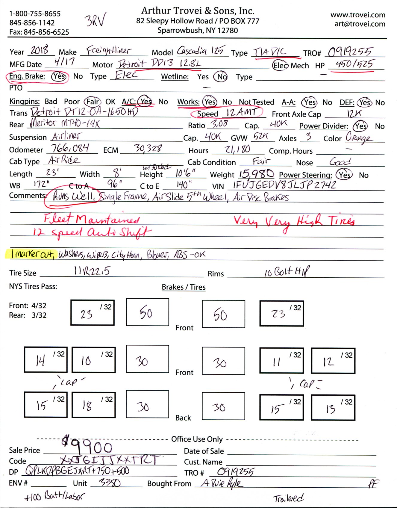 Inventory # 0919255Year: 2018 Make: Freightliner Model: Cascadia 125 Type: Tandem Axle Day Cab Tractor VIN: 1FUJGEDV8JLJP2742 Motor: Detroit DD13 12.8L Elec 450/500 HP Air to Air: Yes Air Conditioning: Yes (Works) Engine Brake: Electronic DEF: Yes Transmission: Detroit DT12-OA-1650HD 12 Speed Automated Manual (Clutchless) PTO: No Front Axle: 12,000 lb Rear: Meritor MT40-14X 40,000 lb Ratio: 3.08 Power Divider: Yes Suspension: Airliner 4 Air Bag 40,000 lb Tires: 11R22.5 Rims: 10 Bolt Hub Pilot - Steel Odometer Reading: 766,084 ECM: 30,328 Hour Meter Reading: 21,180 ECM Hour Reading: Length: 23' Width: 8' Height w/ Fairing Down: 10'6" Wheelbase: 172" Cab to Axle: 96" Cab to End: 140" Weight: 15,980 lb GVW: 52,000 lb Added Features: Runs Well, Single Frame, Air Slide 5th Wheel, Air Disc Brakes Price: $9,900 3RVXXTGIJJXXTRTQPLKDPBGEJXRT+750+500+100 Terms of Sale