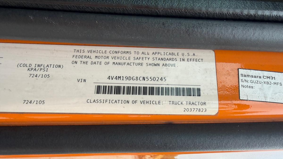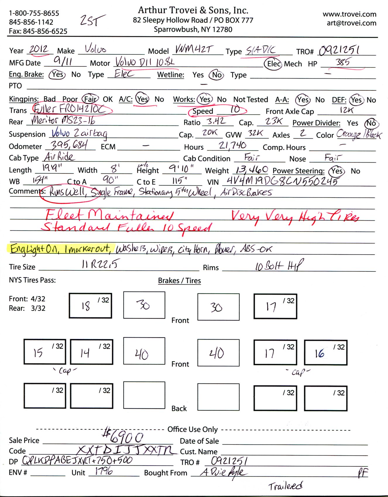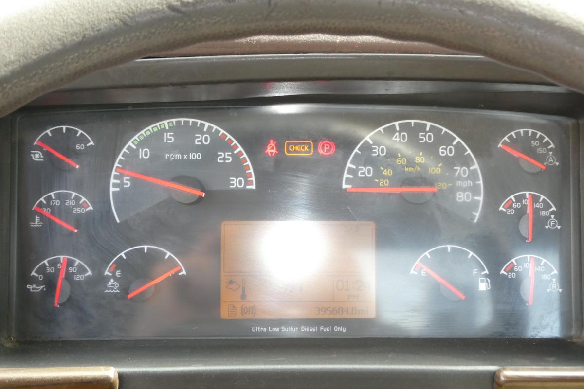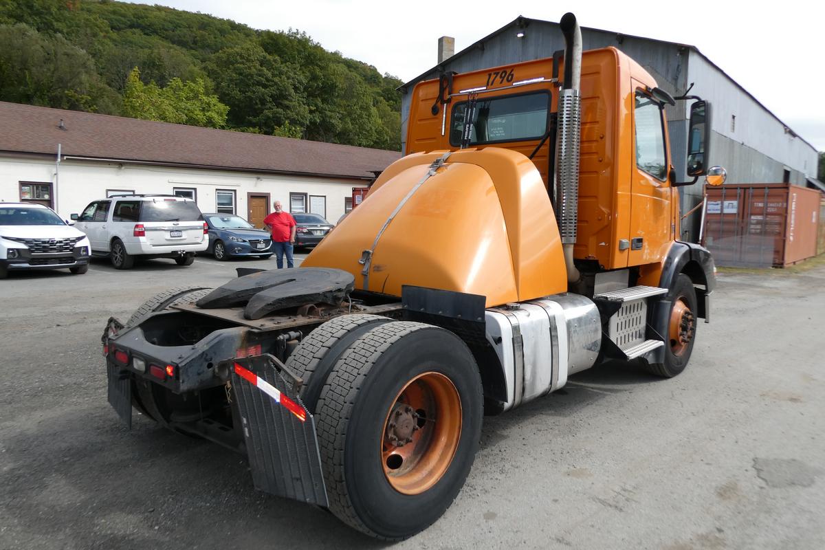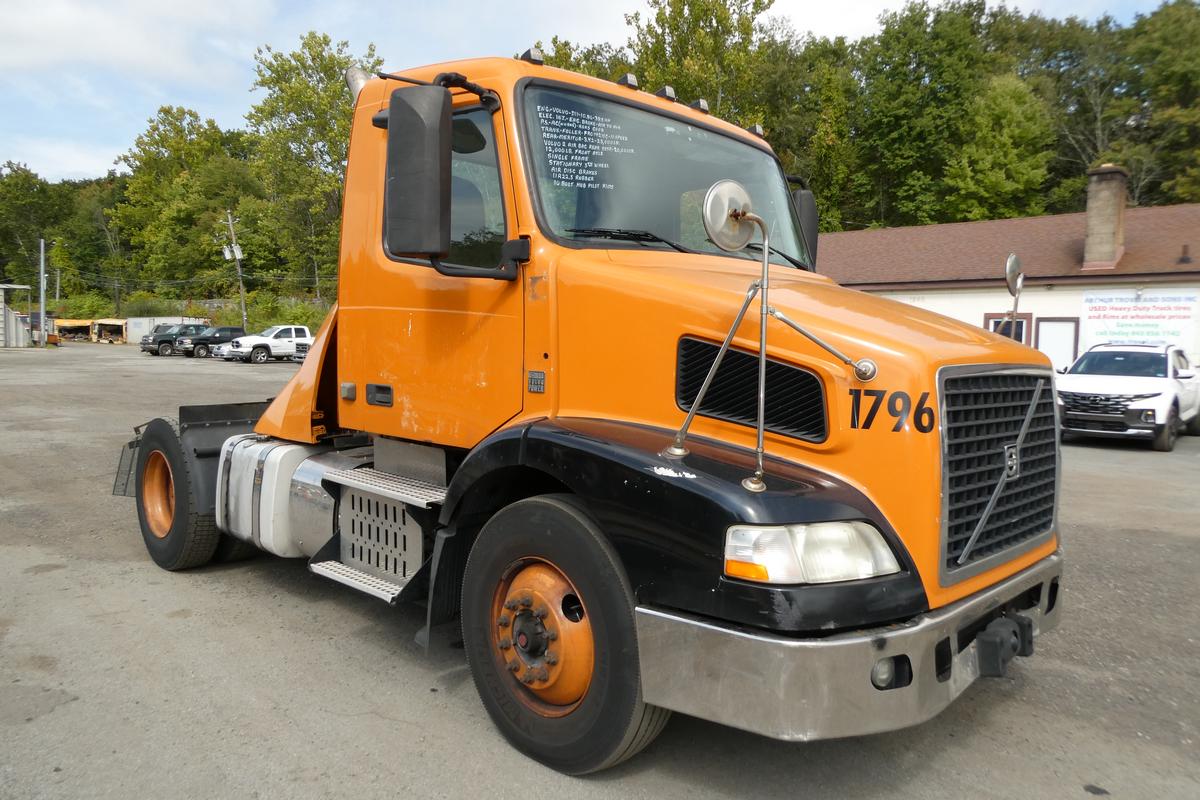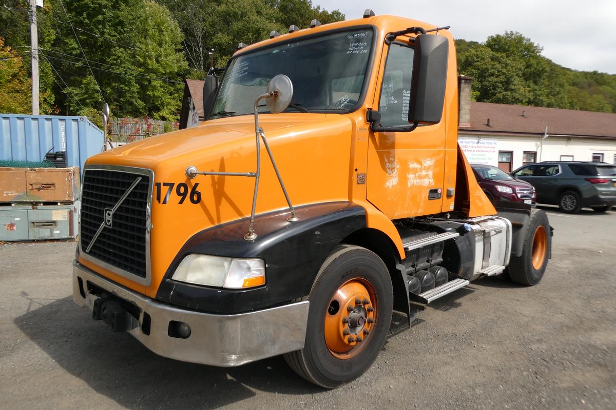 Inventory # 0921251Year: 2012 Make: Volvo Model: VNM42T Type: Single Axle Day Cab Tractor VIN: 4V4M19DG8CN550245 Motor: Volvo D11 10.8L Elec 385 HP - Engine Light On Air to Air: Yes Air Conditioning: Yes (Works) Engine Brake: Electronic DEF: Yes Transmission: Fuller FRO14210C 10 Speed PTO: No Front Axle: 12,000 lb Rear: Meritor MS23-16 23,000 lb Ratio: 3.42 Power Divider: No Suspension: Volvo 2 Air Bag 20,000 lb Tires: 11R22.5 Rims: 10 Bolt Hub Pilot - steel Odometer Reading: 395,684 ECM: Hour Meter Reading: ECM Hour Reading: 21,740 Length: 19'9" Width: 8' Height: 9'10" Wheelbase: 154" Cab to Axle: 90" Cab to End: 115" Weight: 13,460 lb GVW: 32,000 lb Added Features: Runs Well - Engine Light On, Single Frame, Stationary 5th Wheel, Air Disc Brakes Price: $6,900 2STXXTDIJJXXTRQPLKDPABEJXRT+750+500 Terms of Sale