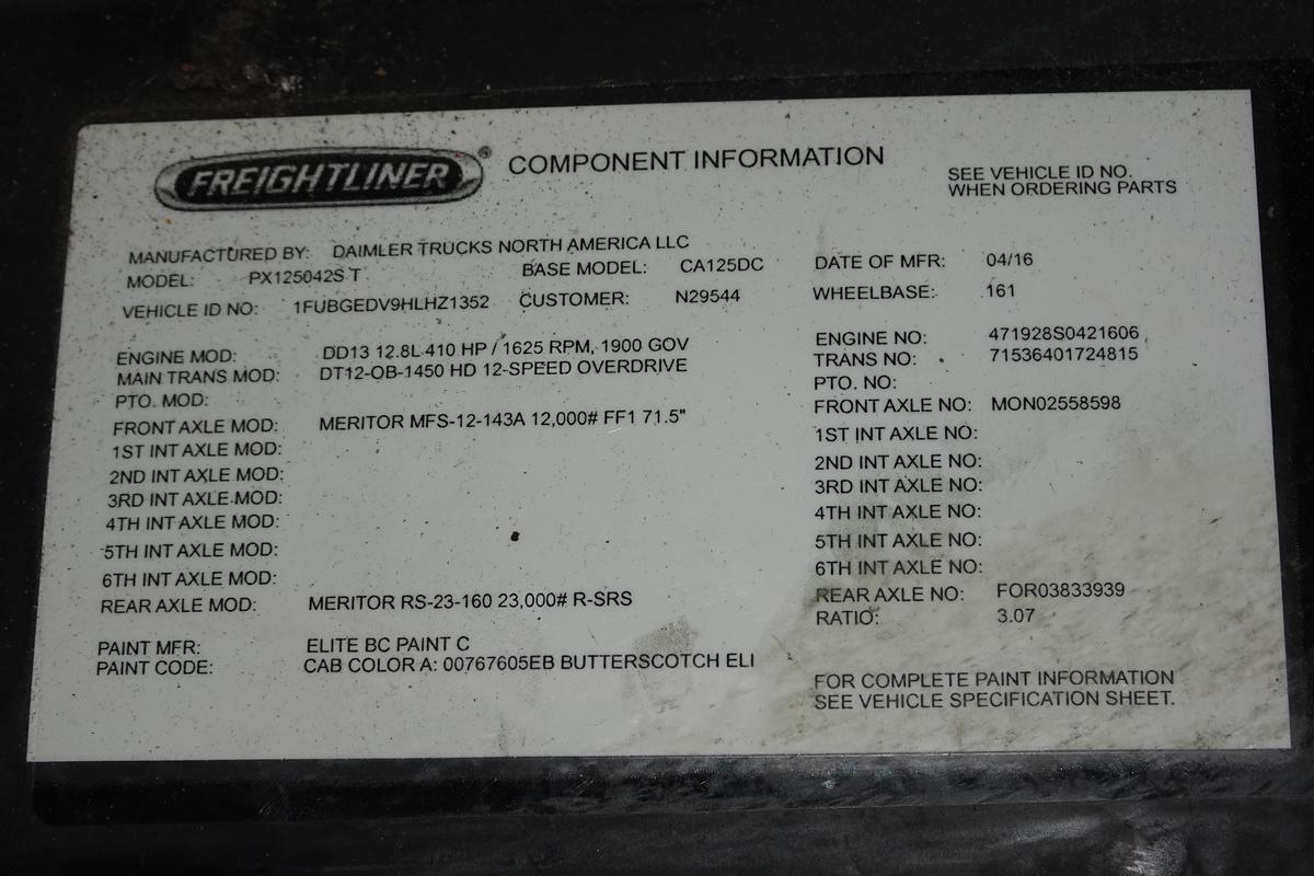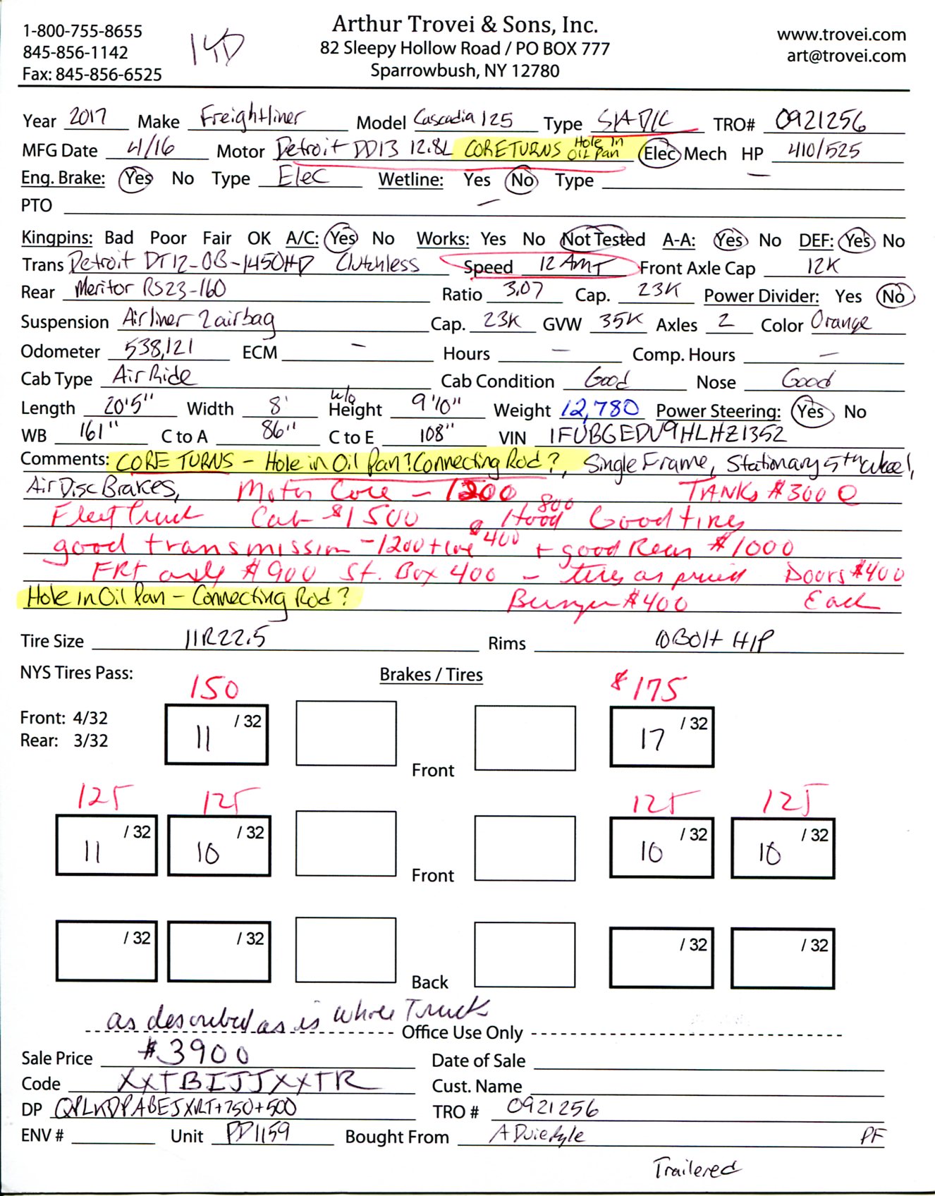 Inventory # 0921256Year: 2017 Make: Freightliner Model: Cascadia 125 Type: Single Axle Day Cab Tractor VIN: 1FUBGEDV9HLHZ1352 Motor: Detroit DD13 12.8L Elec 410/525 HP - DOES NOT RUN CORE TURNS HOLE IN OIL PAN ? CONNECTING ROD ? Air to Air: Yes Air Conditioning: Yes (Not Tested) Engine Brake: Electronic DEF: Yes Transmission: Detroit DT12-OB-1450HD 12 Speed Automated Manual (Clutchless) PTO: No Front Axle: 12,000 lb Rear: Meritor RS23-160 23,000 lb Ratio: 3.07 Power Divider: Yes Suspension: Airliner 2 Air Bag 23,000 lb Tires: 11R22.5 Rims: 10 Bolt Hub Pilot - Steel Odometer Reading: 538,121 ECM: Hour Meter Reading: ECM Hour Reading: Length: 20'5" Width: 8' Height: 9'10" Wheelbase: 161" Cab to Axle: 86" Cab to End: 108" Weight: 12,780 lb GVW: 35,000 lb Added Features: DOES NOT RUN CORE TURNS HOLE IN OIL PAN ? CONNECTING ROD ?, Single Frame, Stationary 5th Wheel, Air Disc Brakes Price: $3,900 as is as described 1YDXXTBIJJXXTRQPLKDPABEJXRT+750+500 Terms of Sale