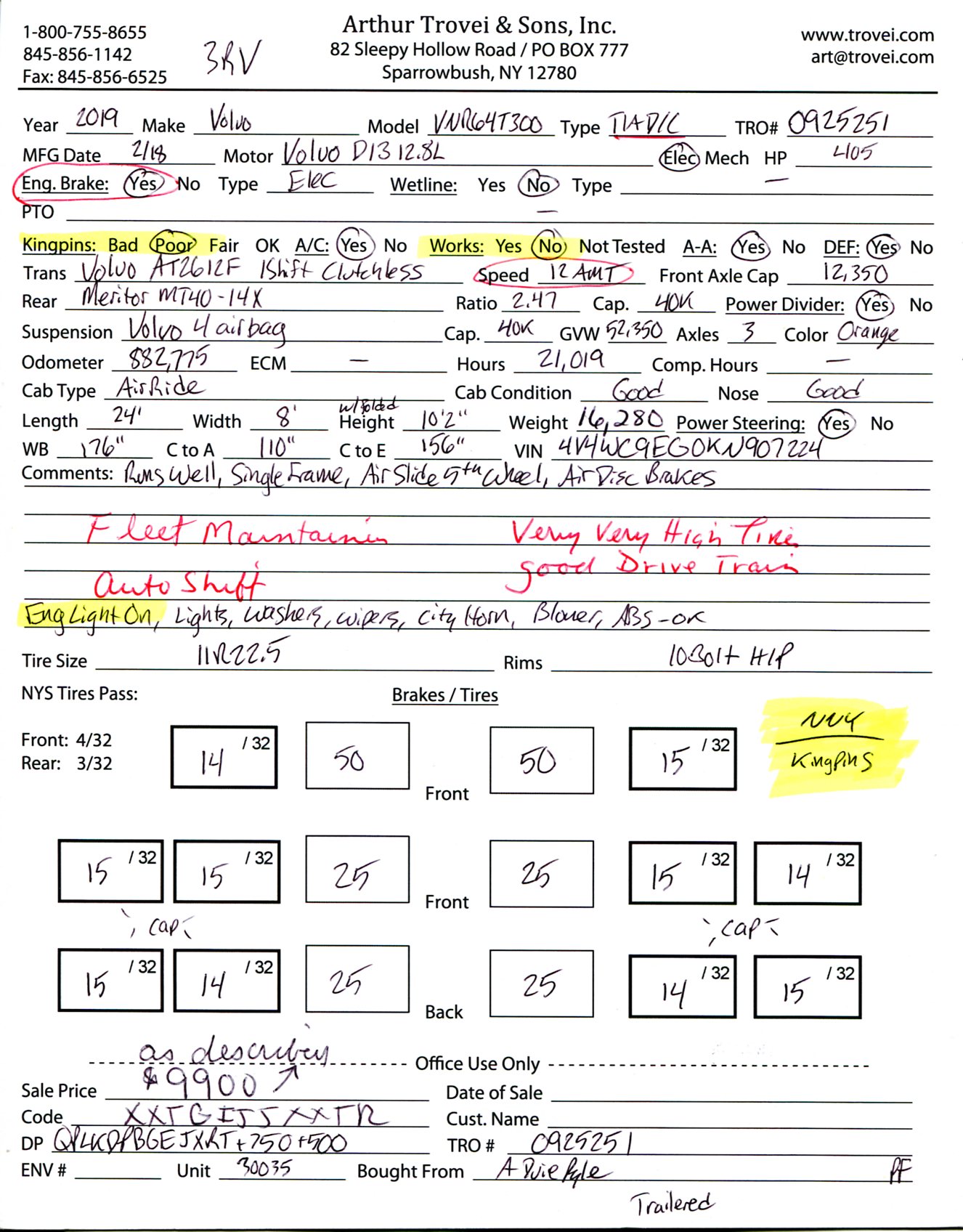 Inventory # 0925251Year: 2019 Make: Volvo Model: VNR64T300 Type: Tandem Axle Day Cab Tractor VIN: 4V4WC9EG0KN907224 Motor: Volvo D13 12.8L Elec 405 hp - Engine Light On Air to Air: Yes Air Conditioning Yes (Not Working) Engine Brake: Electronic DEF: Yes Transmission: Volvo AT2612F IShift (Clutchless) 12 Speed Automated Manual PTO: n/a Front Axle: 12,350 LB Rear: Meritor MT40-14X 40,000 LB Ratio: 2.47 Power Divider: Yes Suspension: Volvo 4 Air Bag 40,000 LB Tires: 11R22.5 Rims: 10 Bolt Hub Pilot - Steel Odometer Reading: 882,775 ECM Reading: Hour Meter Reading: 21,019 ECM Hour Reading: Length: 24' Width: 8' Height w/ fairing folded: 10'2" Wheelbase: 176" Cab to Axle: 110" Cab to End: 156" Weight: 16,280 lbs GVW: 52,350 lbs Added Details: Runs Well - Engine Light On, Single Frame, Air Slide 5th Wheel, Air Disc Brakes Price: $9,900 as described NNY 3RVXXTGIJJXXTRQPLKDPBGEJXRT+750+500 Terms of Sale